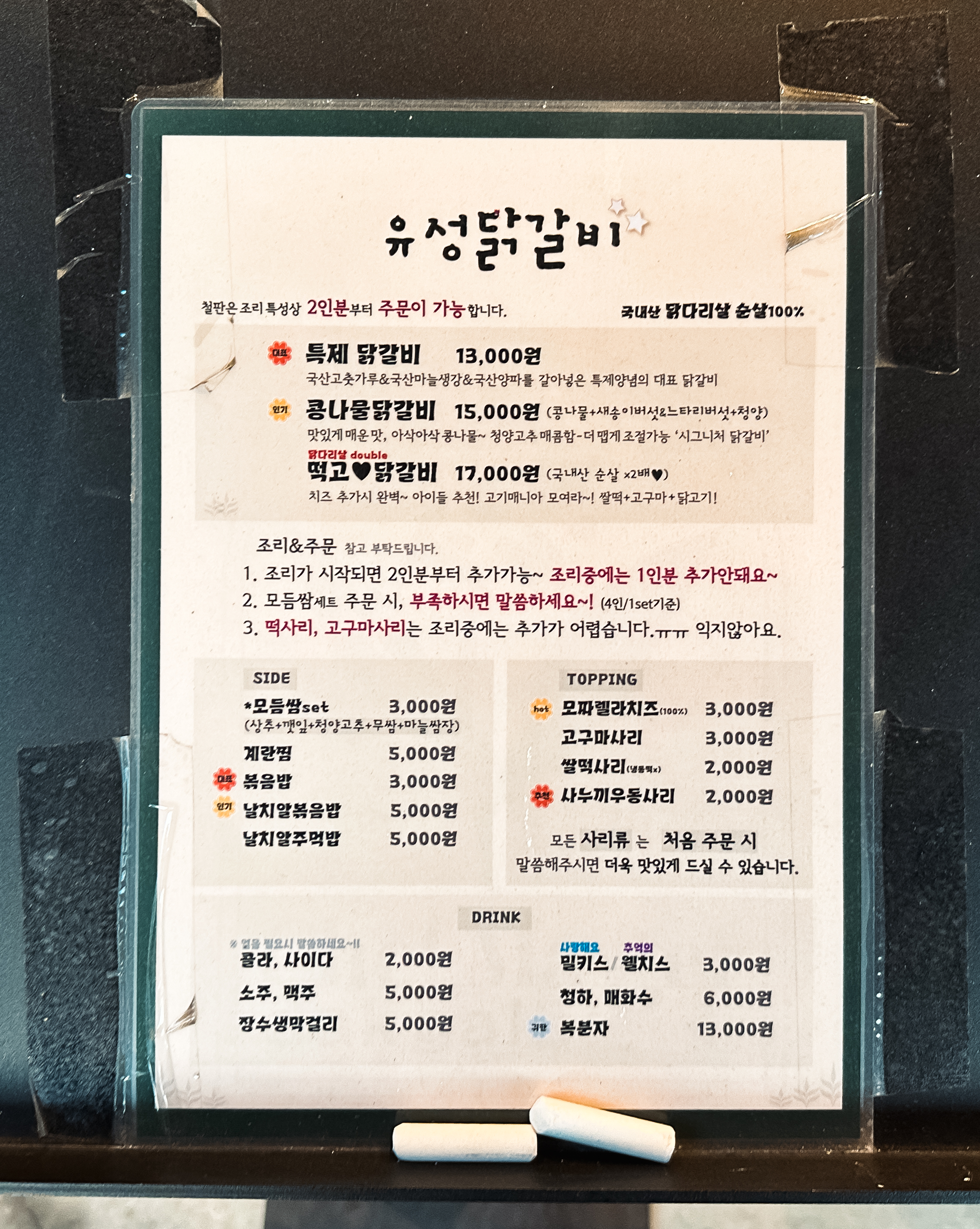유성닭갈비의 위치는 서울 송파구 거여동 42-19, 1층에 위치한 가게입니다. 제가 앞서 소갯말에서 언급하였던 김대감감자탕과 같은 건물에 위치해 있었고, 비교적 최근에 오픈하여 깔끔한 분위기의 식당이었습니다. 그럼 이제 가게의 메뉴를 함께 살펴보실까요?