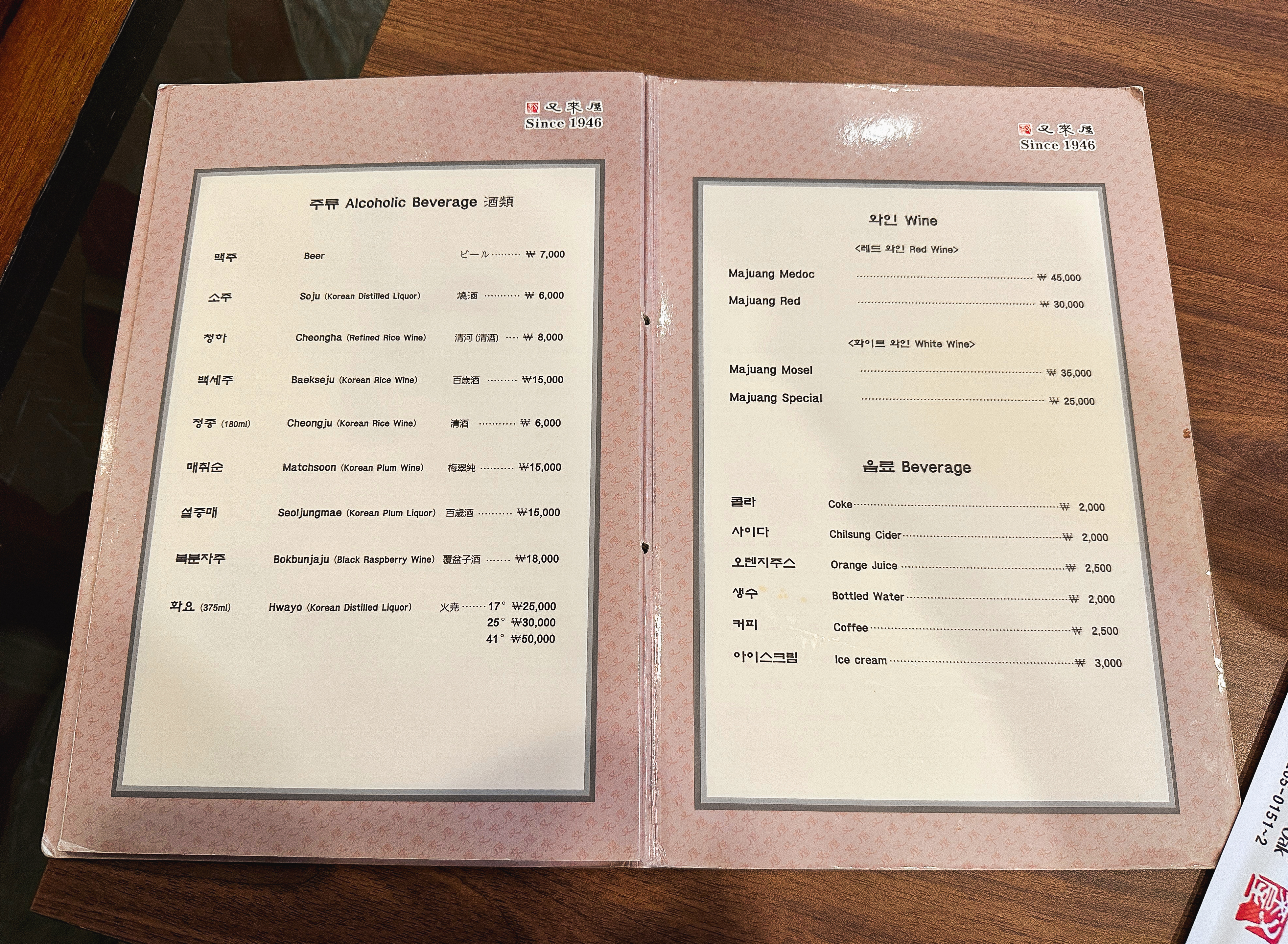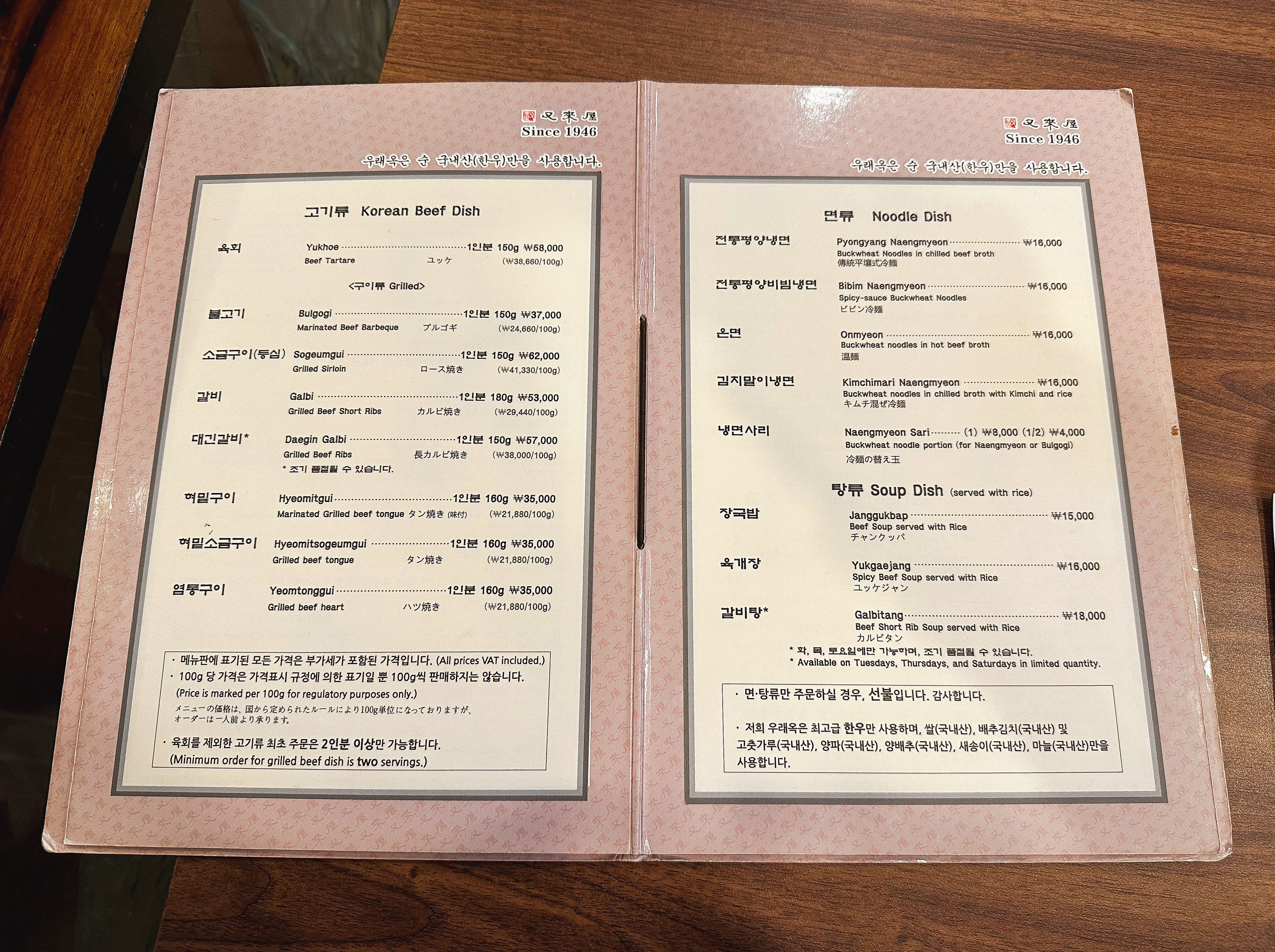 가게에서 저는 2층으로 자리를 안내를 받았고, 메뉴판은 위와 같이 준비되어 있었습니다. 육회, 불고기, 소금구이, 갈비, 대긴갈비, 혀밑구이, 혀밑소금구이, 염통구이, 전통평양냉면, 전통평양비빔냉면, 온면, 김치말이냉면, 냉면사리, 장국밥, 육개장, 갈비탕 등이 있었습니다.