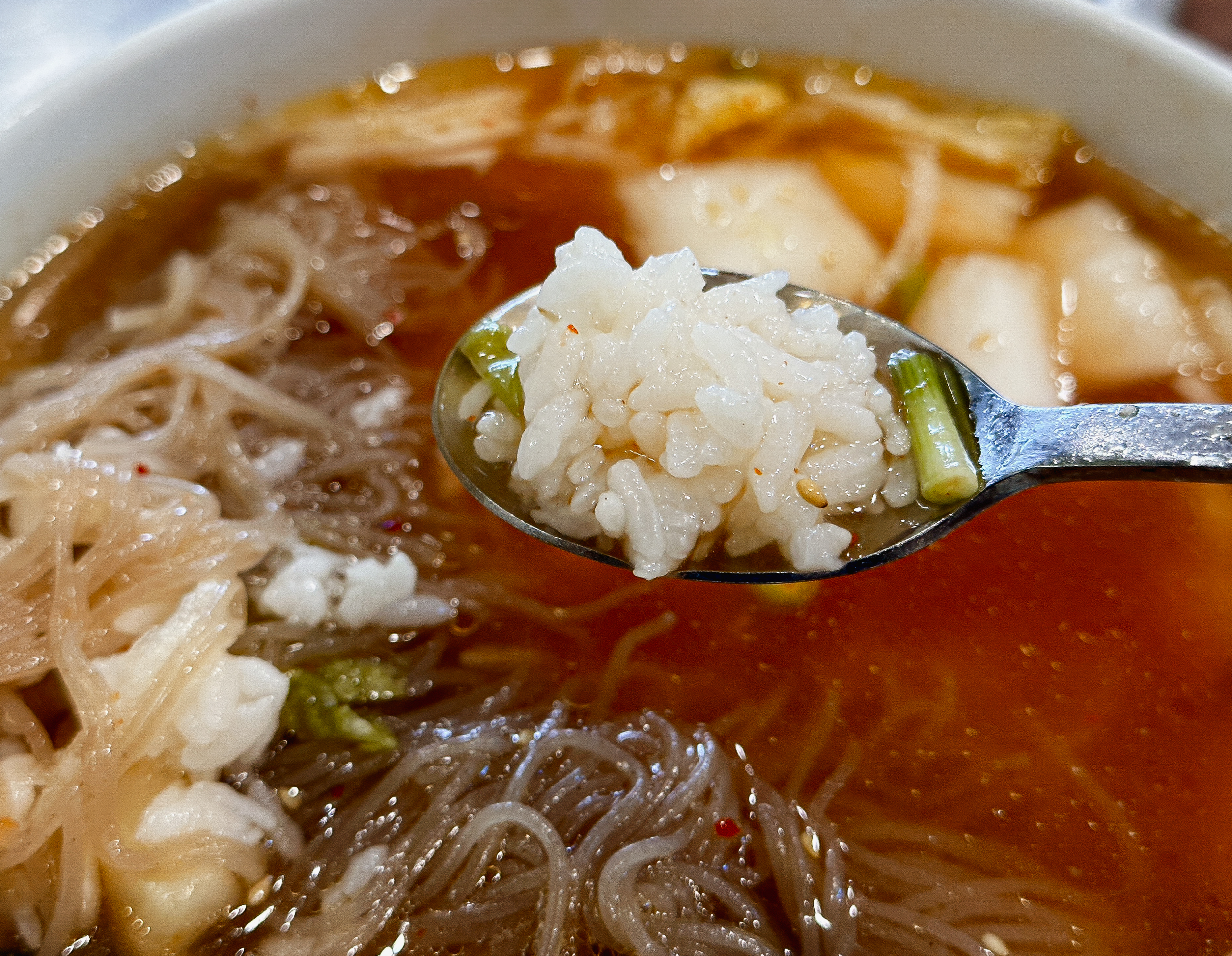 을지로 평양냉면 맛집 우래옥에서 파는 밥 말아주는 냉면인 '김치말이냉면'은 육향 나는 깊고 구수한 국물에 김치를 곁들여 느끼한 맛은 줄였고, 미지근하게 식은 밥을 국물 안에 넣어 냉면의 본질적인 부분인 차가운 성질은 그대로 유지해 냉면 본연의 맛은 해치지 않고 좋았습니다. 생각보다 곰탕에 김치 넣고 밥 말아먹는 느낌이라 맛이 궁금하신 분들께 추천해드리고 싶은 메뉴입니다.