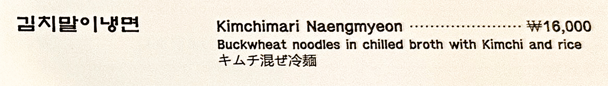 메뉴 중에 제가 앞에서 언급하였던 밥을 말아주는 냉면은 바로 우래옥의 '김치말이냉면'인데 이 메뉴는 시원한 국물에 김치와 밥을 곁들인 메밀국수(Buckwheat noodles in chilled broth with kimchi and rice) 라고 영어로도 안내가 되어있었습니다. 과연 밥 말아서 나오는 냉면은 어떤 모습일지 궁금하더라고요.