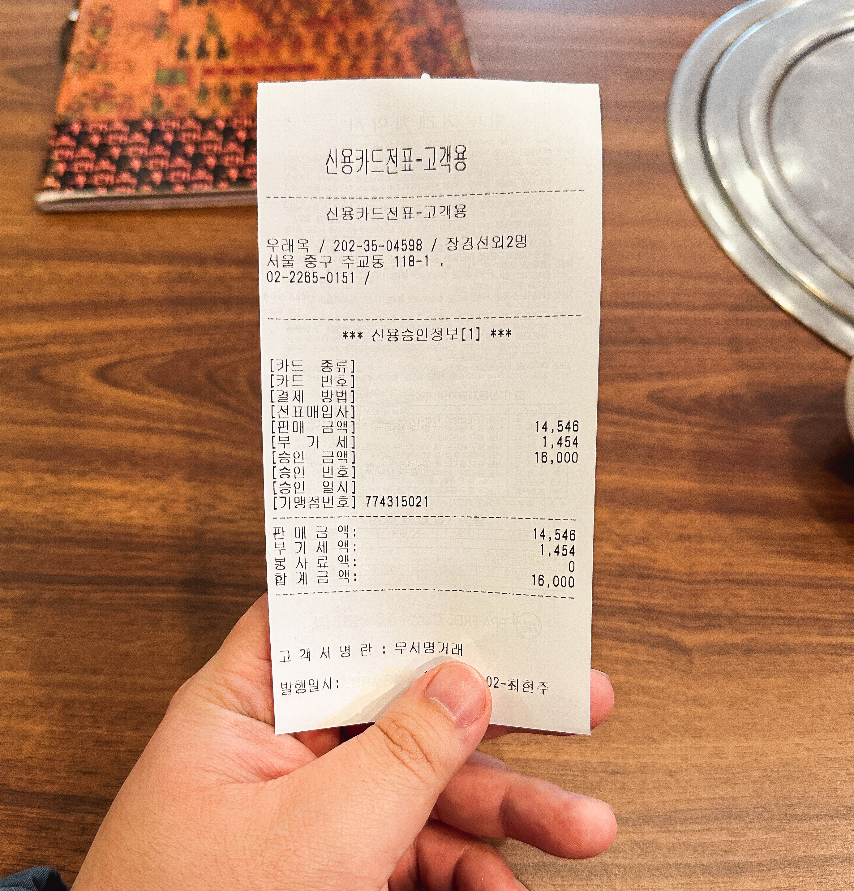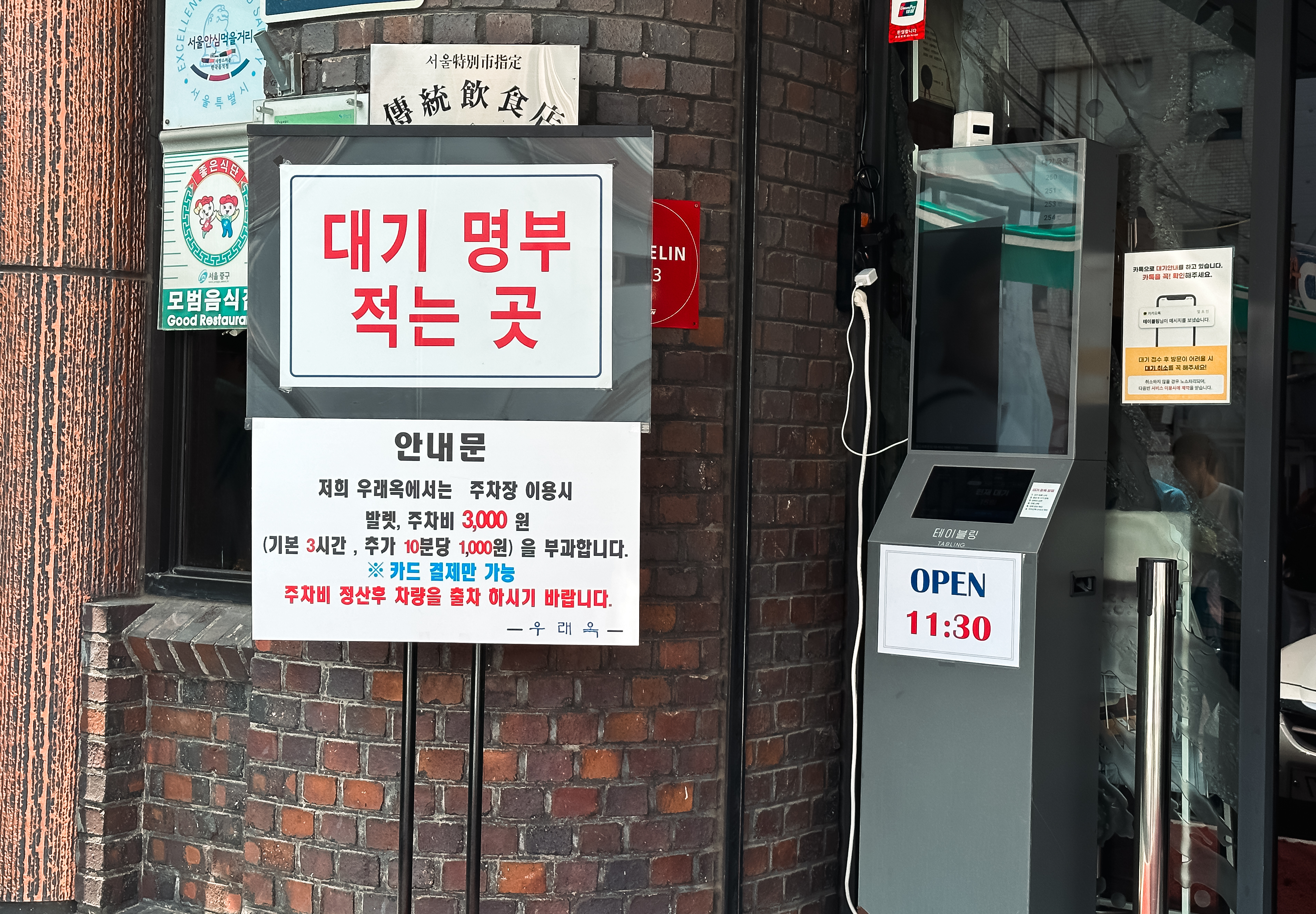 우래옥의 위치는 서울 중구 주교동 118-1 에 위치해 있으며, 손님이 정말 많은 평양냉면 맛집이기에 주차도 힘이 들지만 대기도 많이 해야 했습니다. 저는 자가용을 이용하였기 때문에 가게 내에서 운영하고 있는 주차장에 발렛 주차를 맡겼고, 테이블링이라는 대기 앱을 통해 대기명부를 작성한 뒤 기다렸습니다.