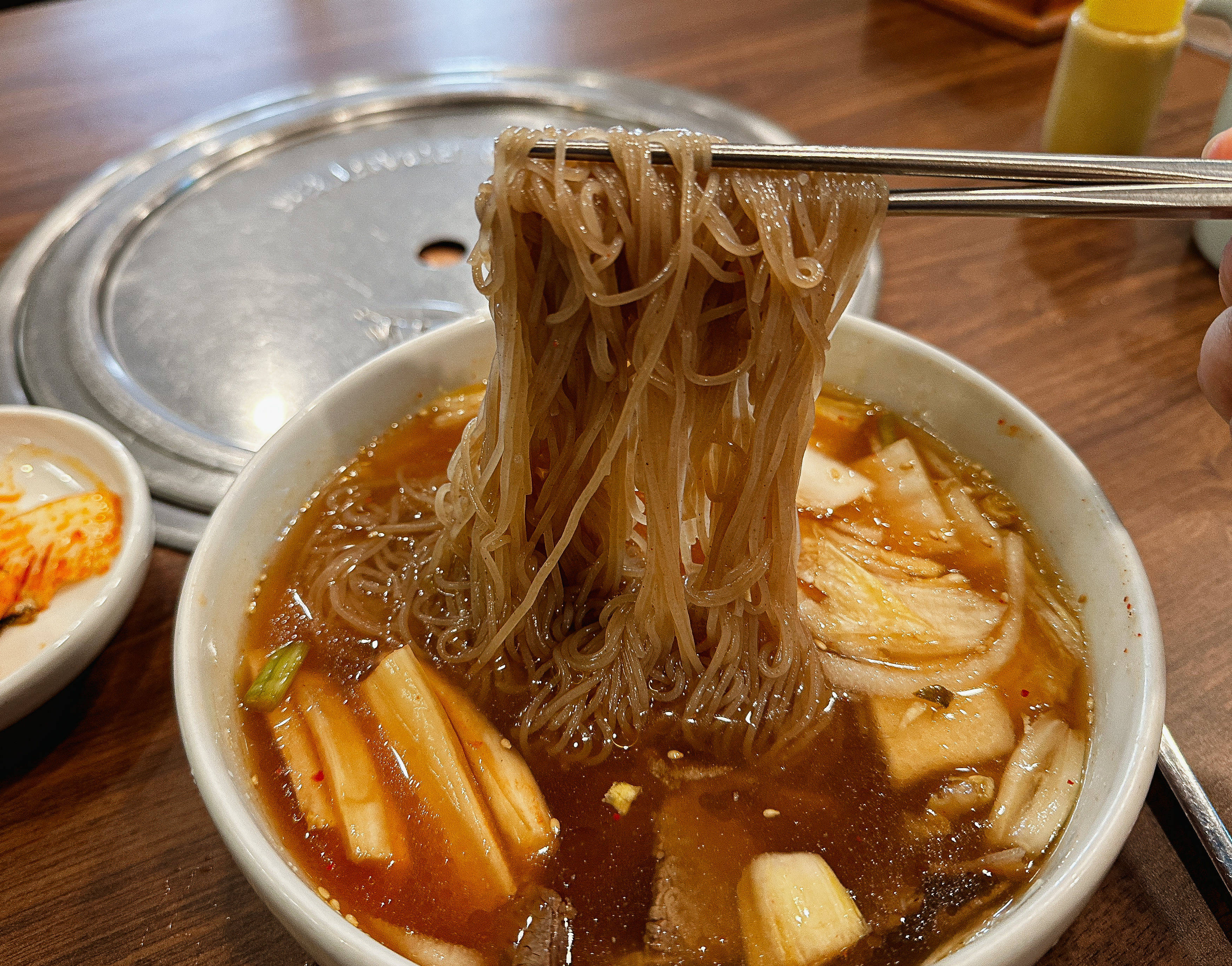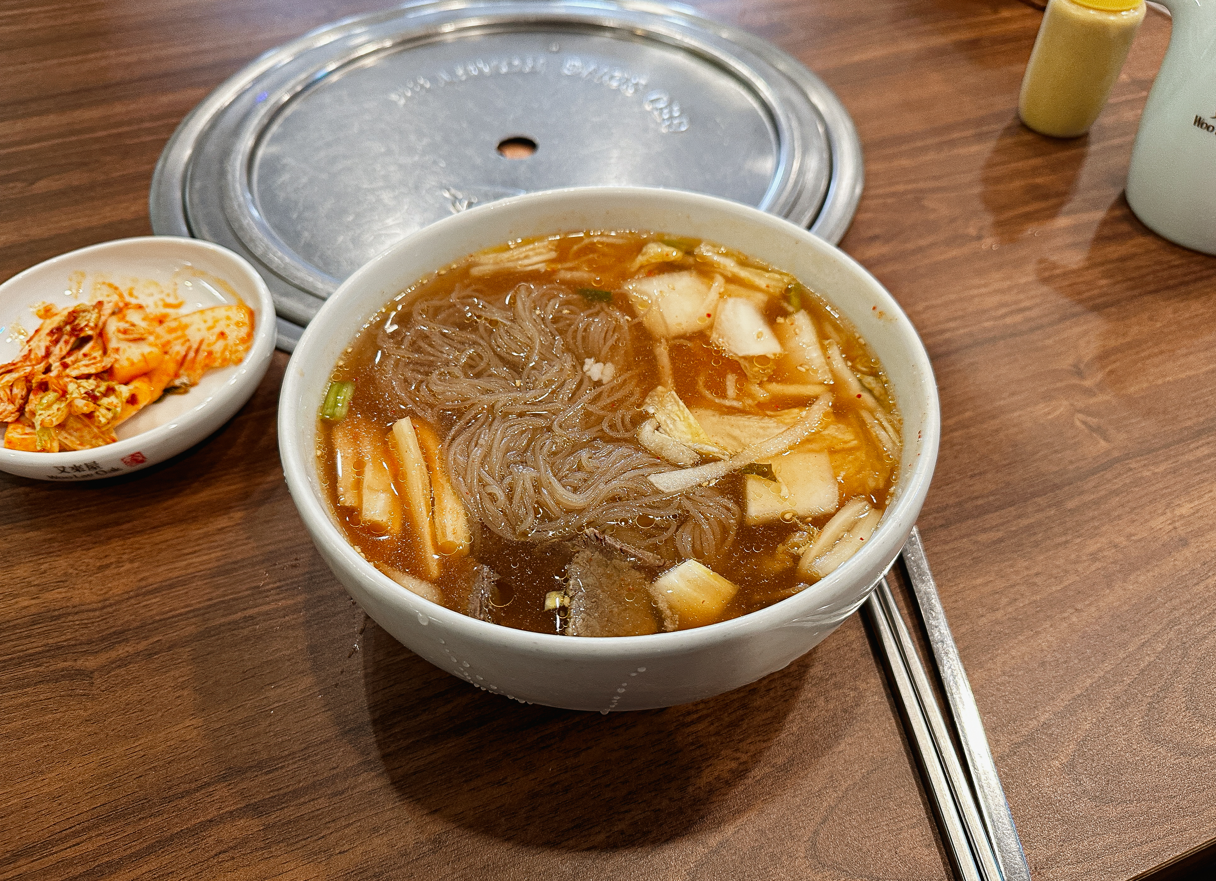 평양냉면에 물김치와 밥을 곁들이는 메뉴인 우래옥 김치말이냉면은 일단 냉면에 밥을 말아준다는 것에 놀랐었는데, 생각보다 의외로 국물과 밥의 조합이 잘 어울려서 맛있게 먹었습니다. 육향이 강하게 나는 국물과 물김치가 들어간 냉면은 면으로 먹어도 좋았지만, 차갑게 식힌 밥을 넣어 냉면의 본질인 차가운 성질은 그대로 유지해 주었고, 곰탕(?)에 밥을 말아먹는 것 같은 기분이 드는 게 잘 어울렸습니다.