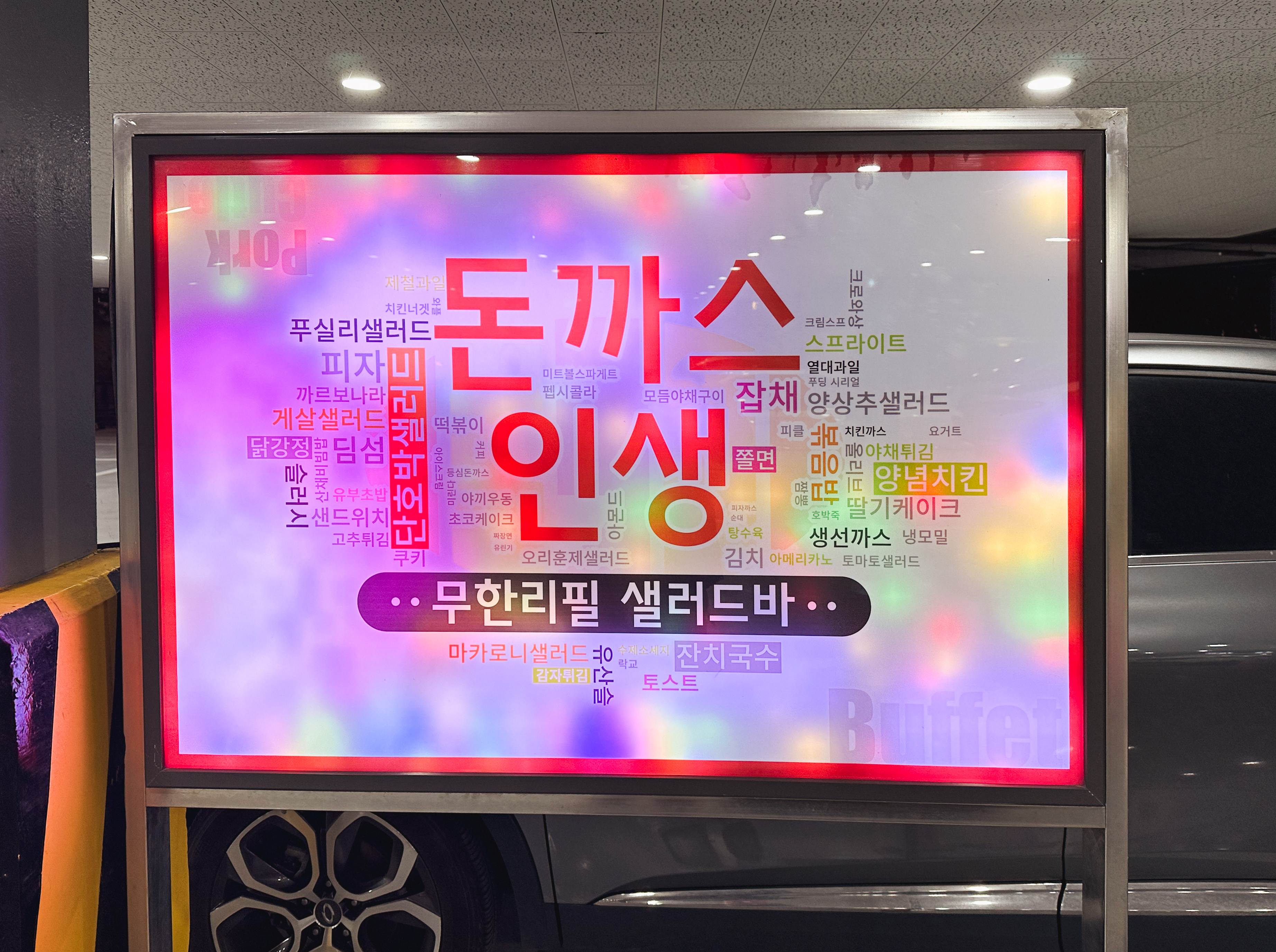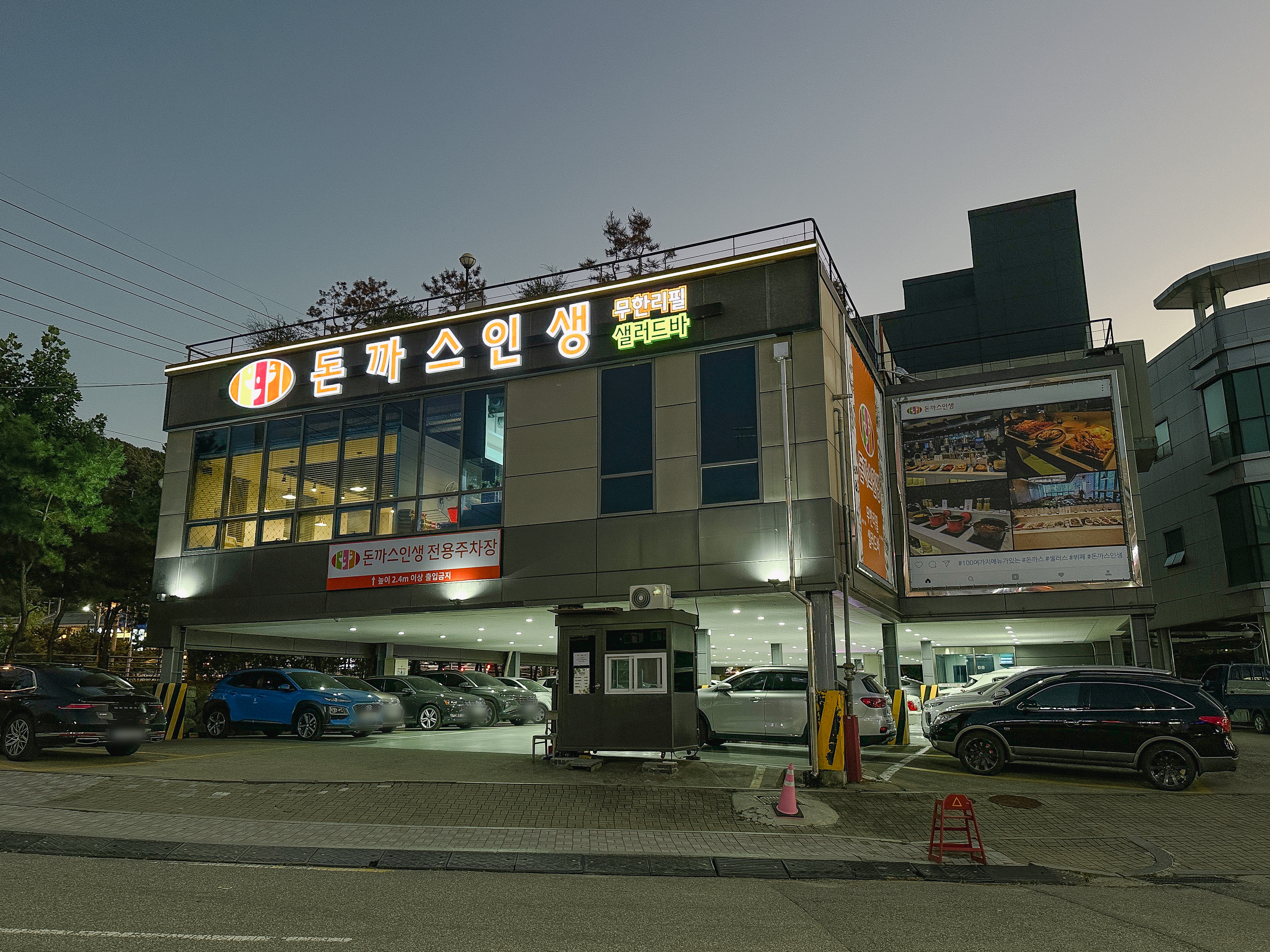 돈까스인생의 위치는 경기 광명시 하안동 883-8, 2층에 위치한 가게입니다. 돈까스인생은 무한리필 샐러드바 형태로 운영되고 있었고, 가족단위 식사손님이 많기 때문에 널찍한 주차장과 더불어 주차안내를 도와주는 직원분도 따로 있었습니다. 주차를 마친 뒤 가게로 올라갔습니다.