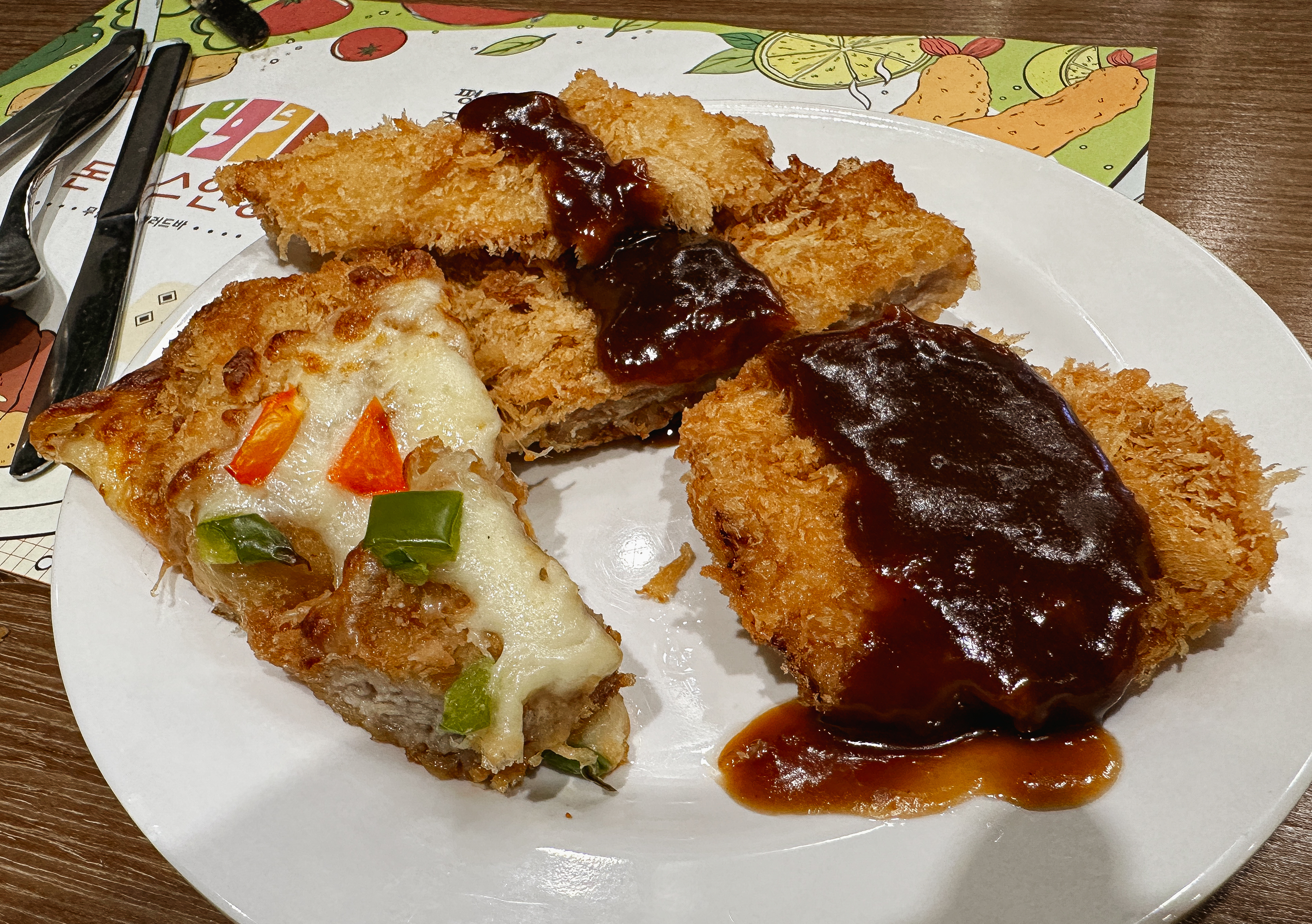 돈까스인생은 가게의 메인 메뉴인 돈까스를 비롯해 다양한 메뉴를 고를 수 있는 샐러드바를 운영 중입니다. 돈까스는 두툼한 등심돈까스, 치킨까스, 생선까스, 피자까스 등이 있었고, 소스 또한 다양해서 원하는 메뉴를 입맛대로 골라서 먹을 수 있었습니다.