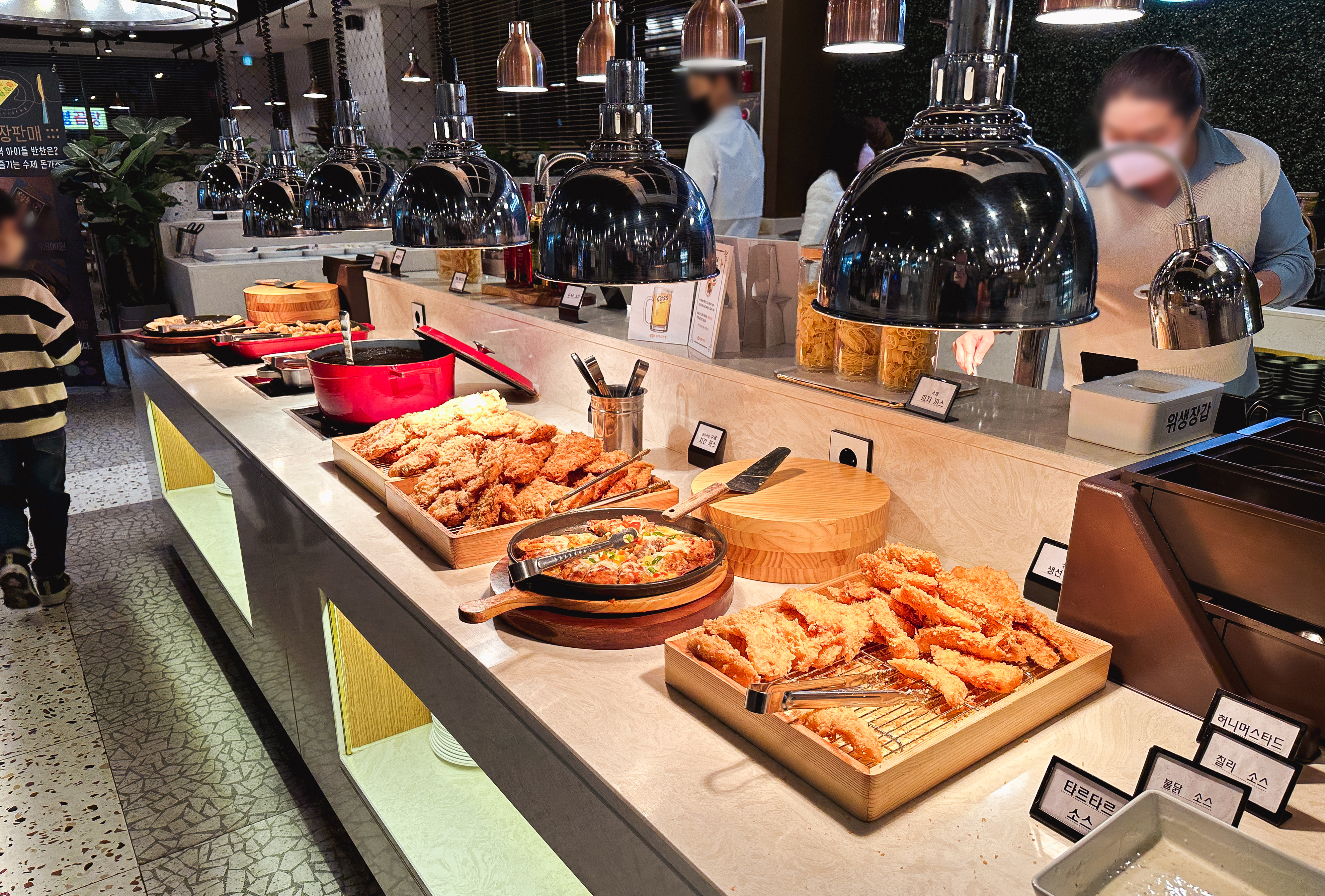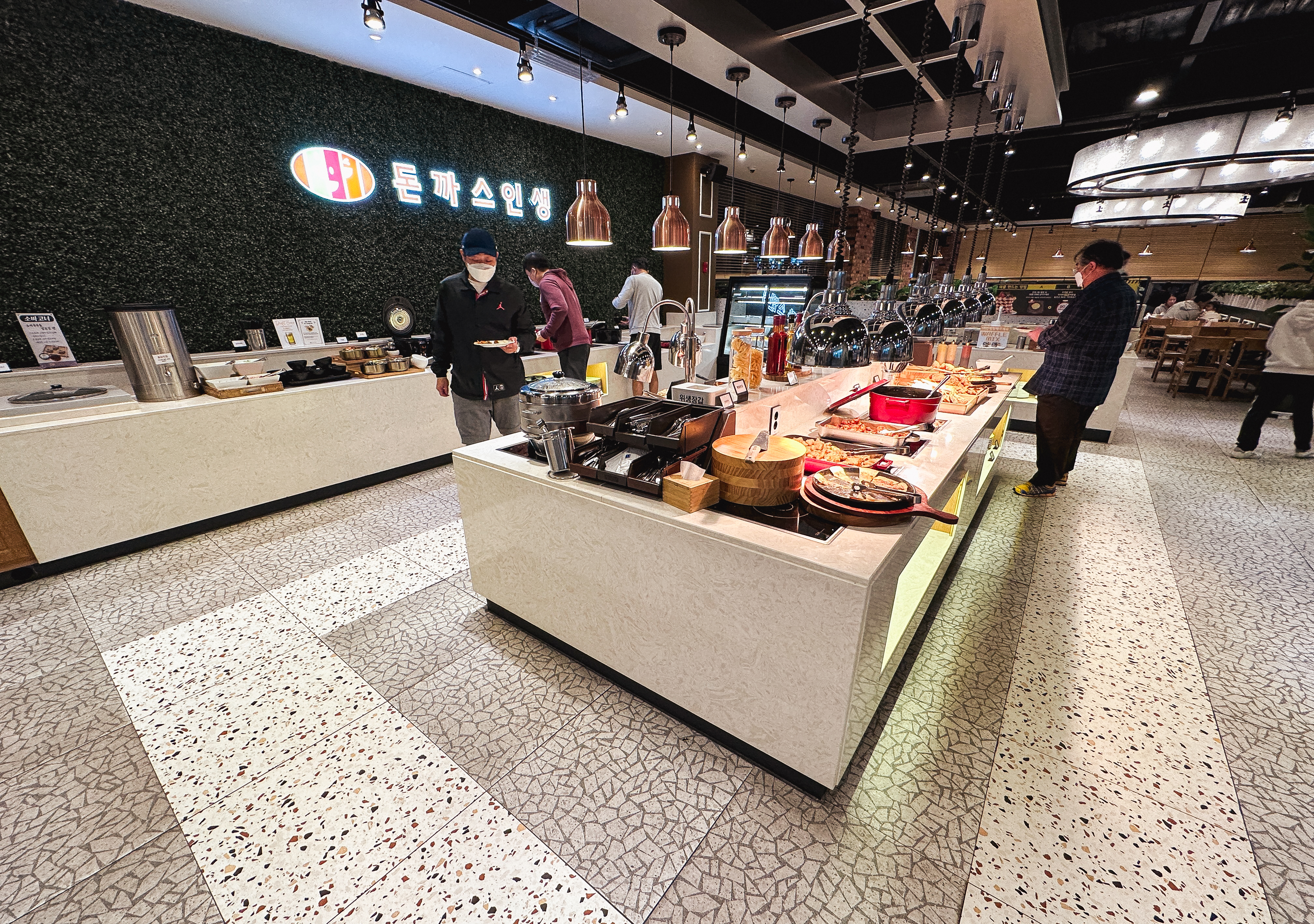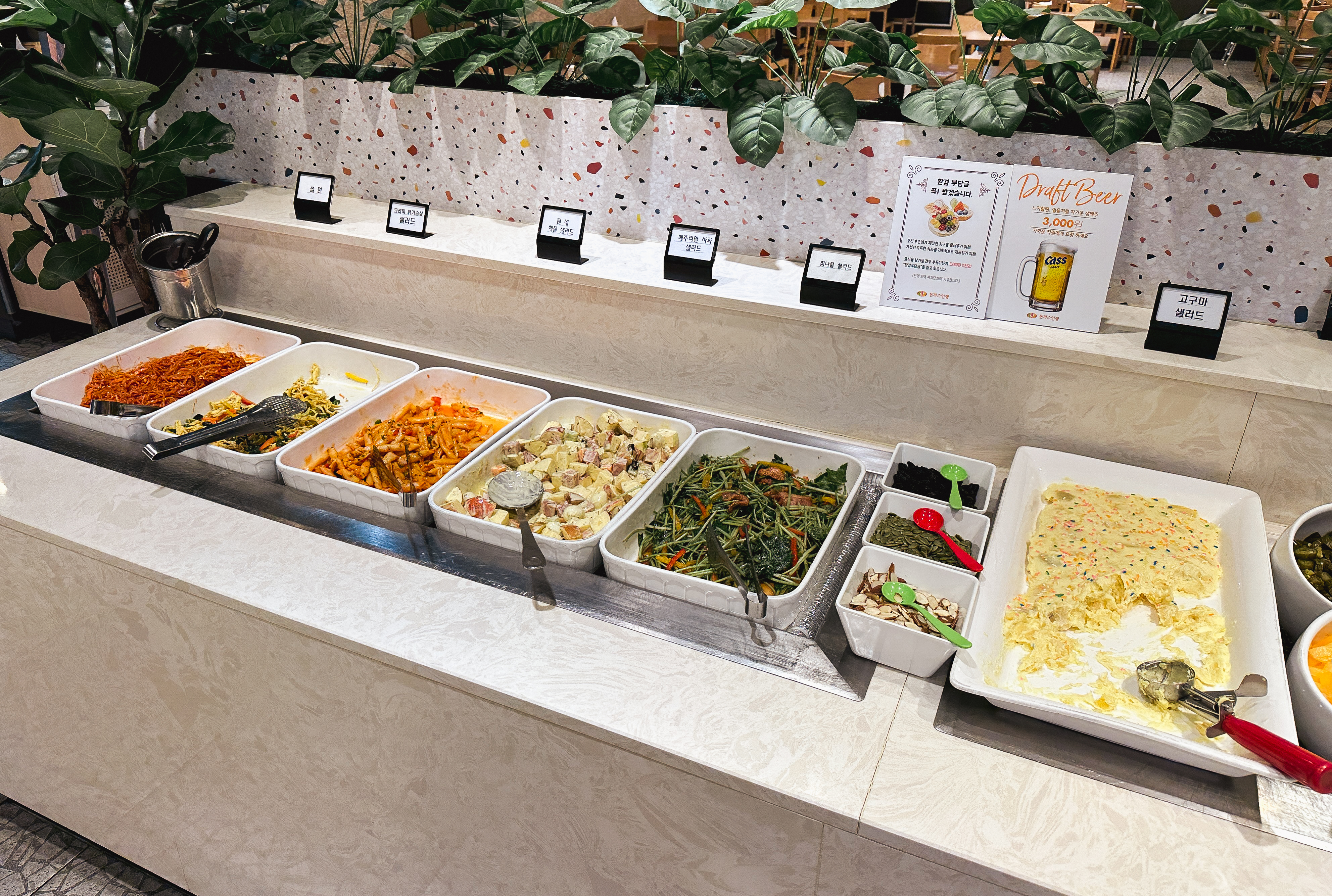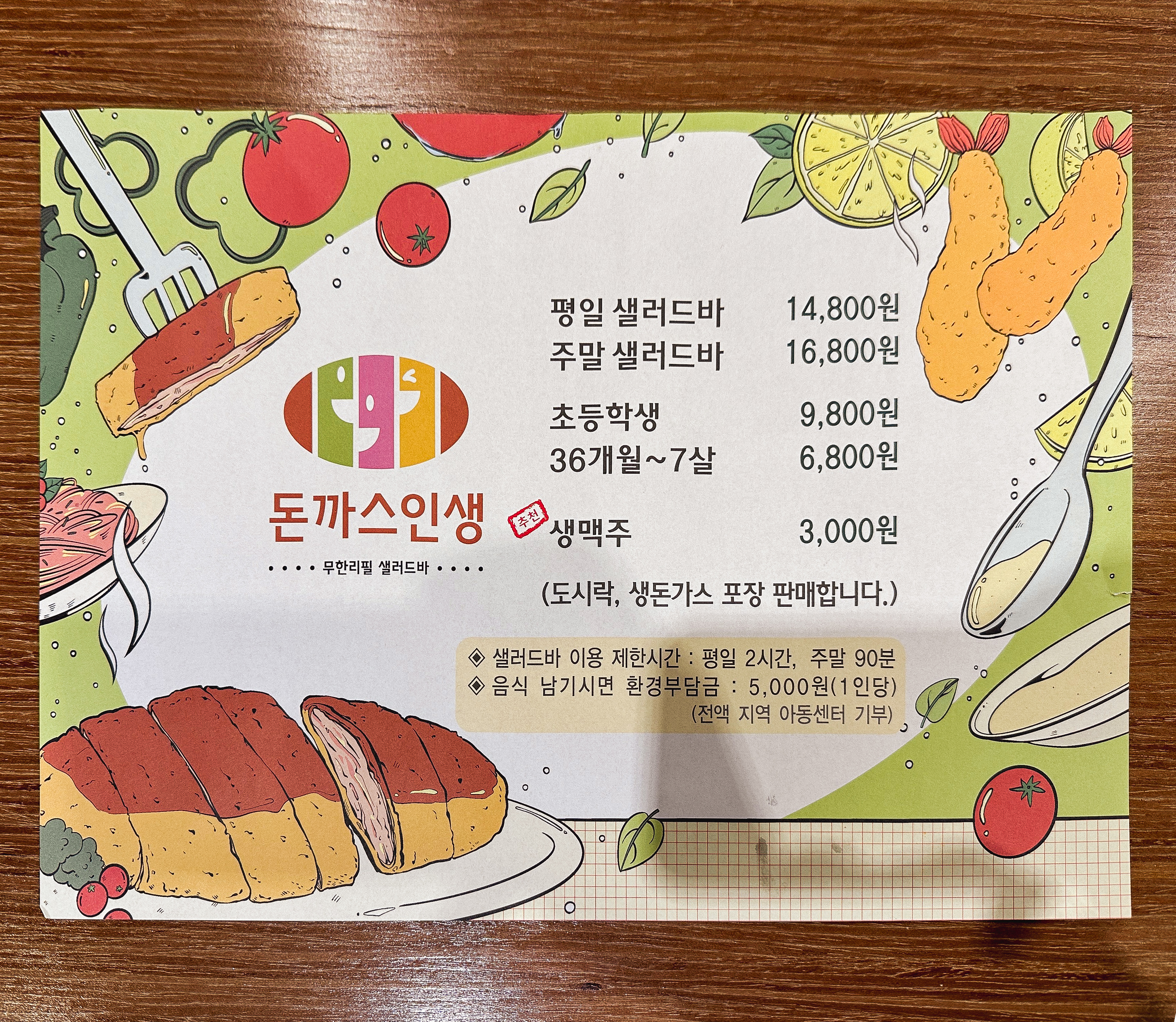 하안동 돈까스인생의 메뉴는 평일 14,800원, 주말 16,800원, 초등학생 9,800원, 36개월~7살 6,800원의 이용료를 받고 있었습니다. 요즘 돈까스 1인분 가격이 1만 원 대라는 점을 감안하면, 조금만 더 보태서 평일기준 14,800원 에 식사할 수 있다는 점이 참 좋았습니다. 돈까스 무한리필 뷔페를 여러 군데 다녀봤는데, 대부분 기대했던 것보다는 별로였는데 과연 돈까스인생은 어떤 차이점이 있기에 이렇게 큰 규모로 운영하는지 함께 살펴보도록 하시죠.