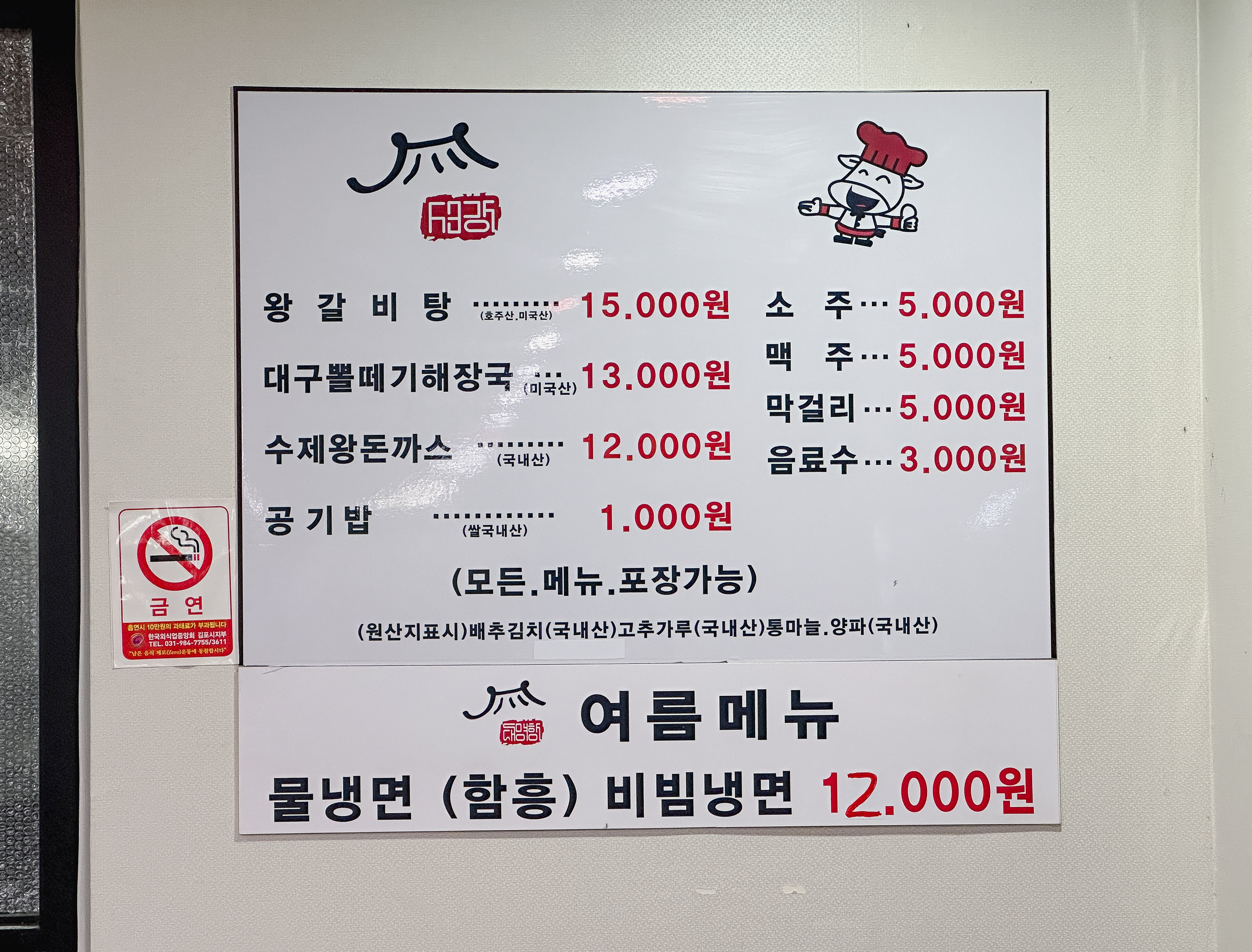 김포 대명항왕갈비탕의 메뉴는 왕갈비탕, 대구뽈떼기해장국, 수제왕돈까스, 물냉면・비빔냉면으로 메뉴의 종류는 많지 않았습니다. 저는 오히려 이렇게 메뉴의 가짓수가 적은 곳이 더 좋더라고요. 그중에서도 왕갈비탕은 이 가게의 대표메뉴인만큼 맛있을 것 같더라고요.