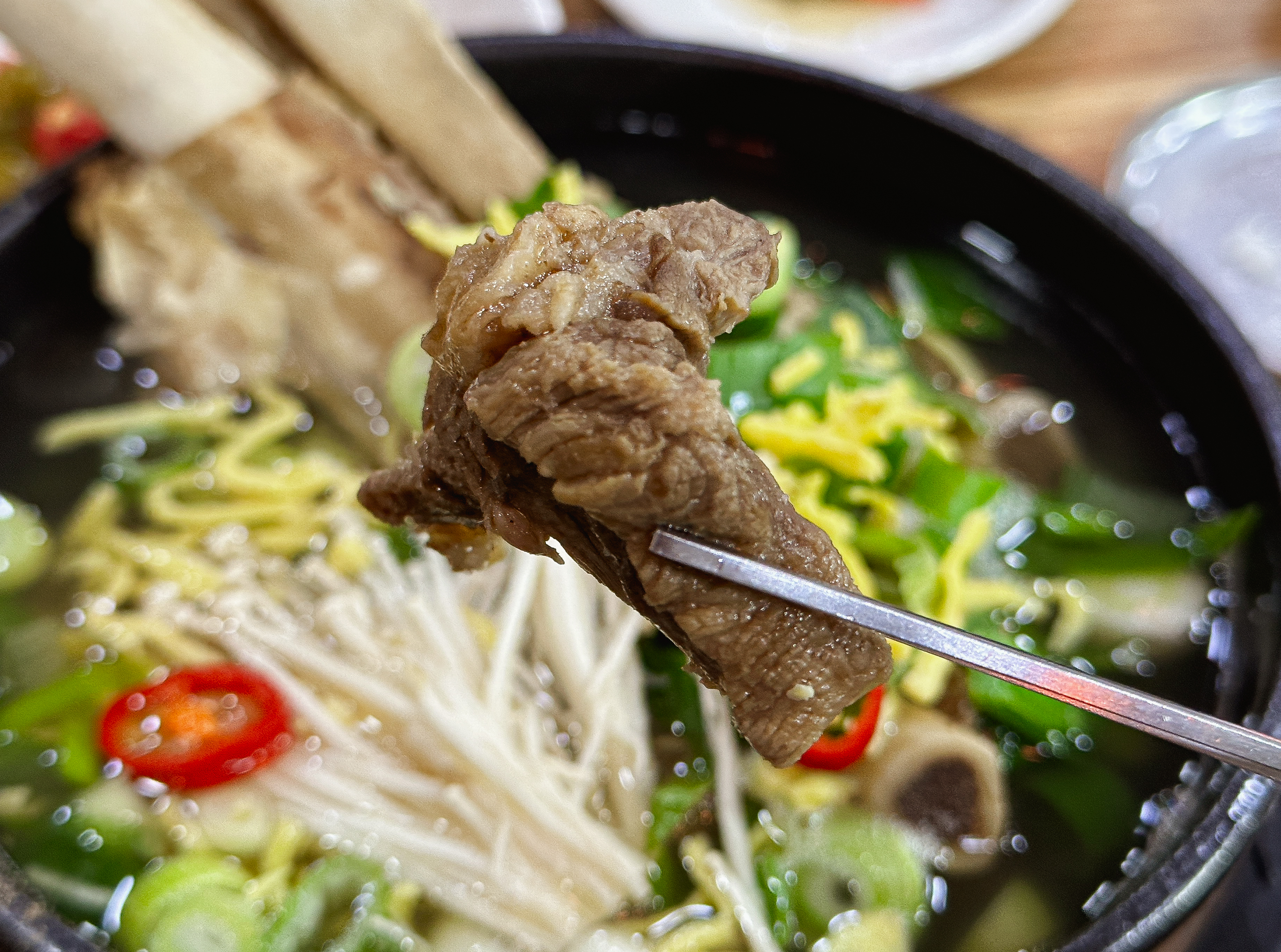 갈비탕의 고기는 뼈랑 살코기가 잘 분리되어 먹기 편했고, 고기 또한 부드러워서 맛있었습니다. 국물은 우리가 흔히 아는 갈비탕 국물이었고, 계란지단, 대추, 인삼 등 재료를 넣어 더 고급스러워 보이더라고요. 가격은 15,000원이었는데, 적당한 수준이었고 맛도 괜찮아서 만족스럽게 식사했습니다.