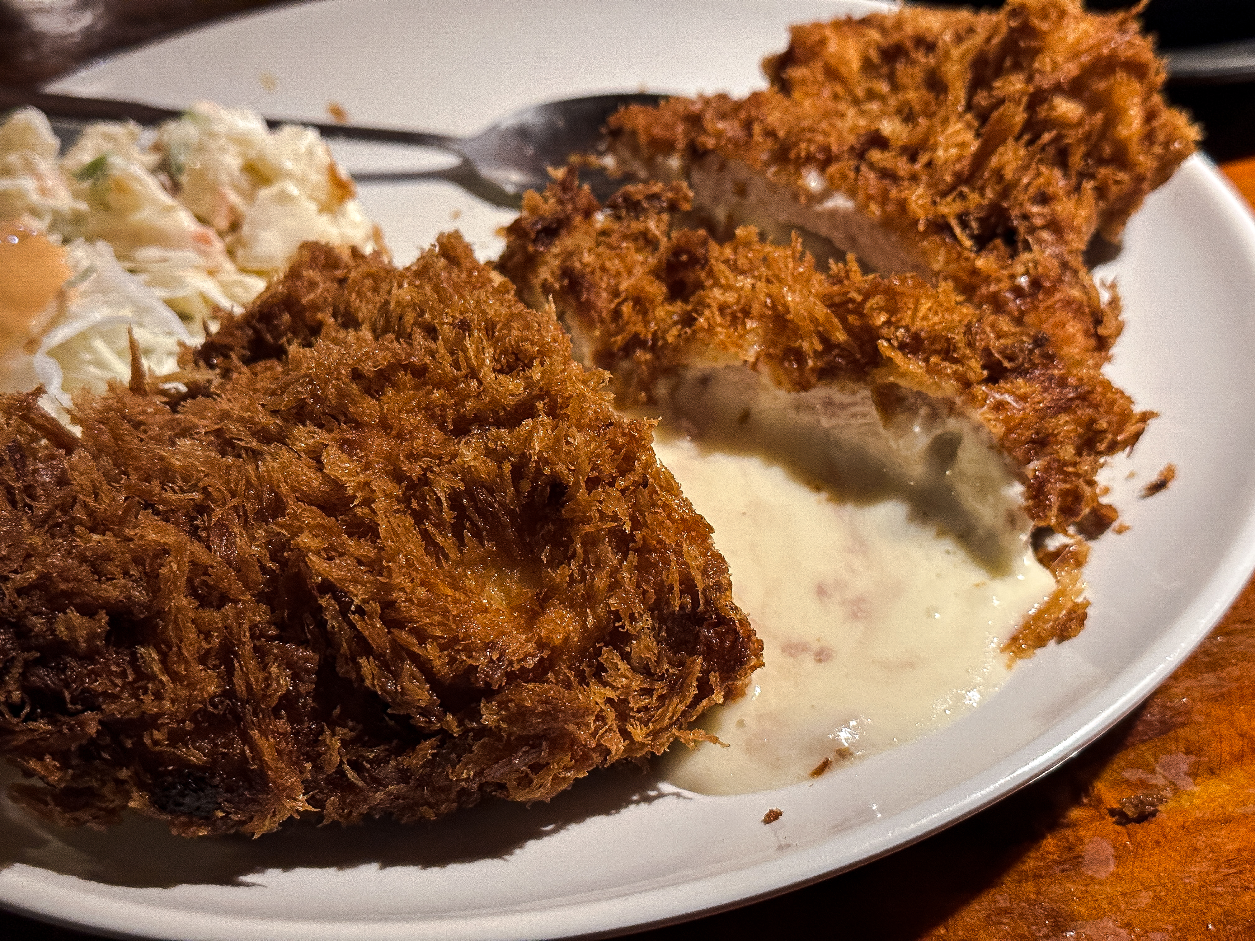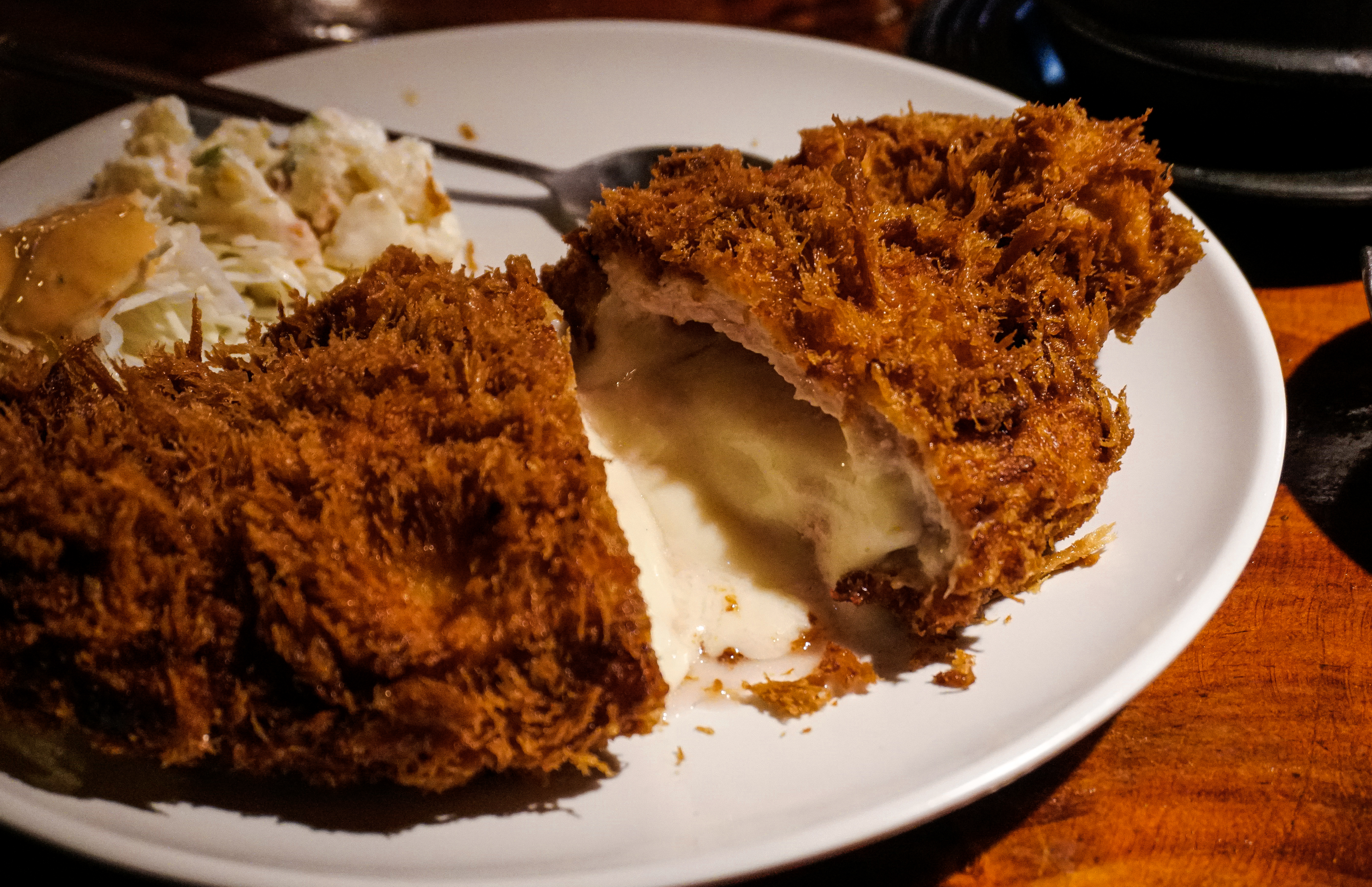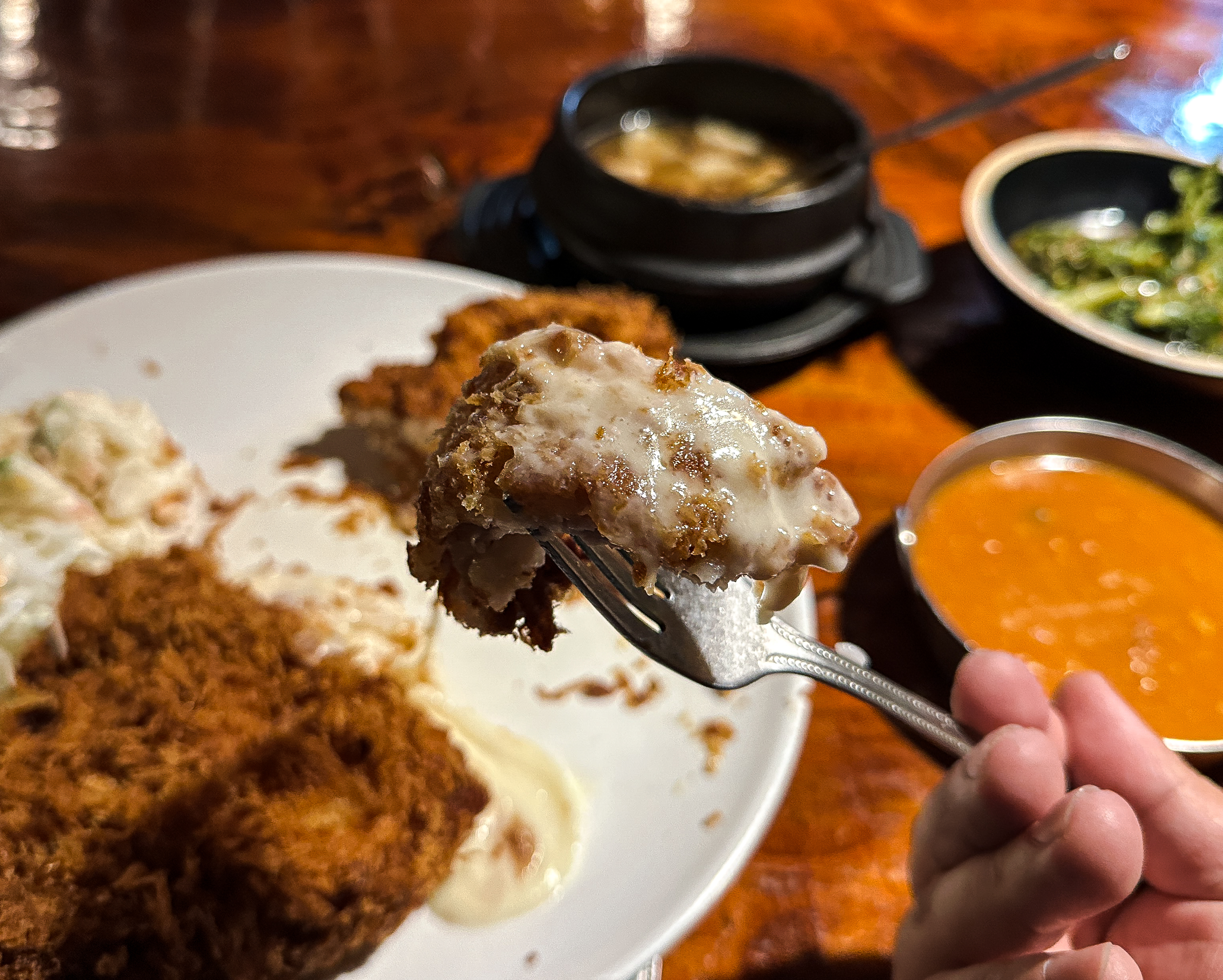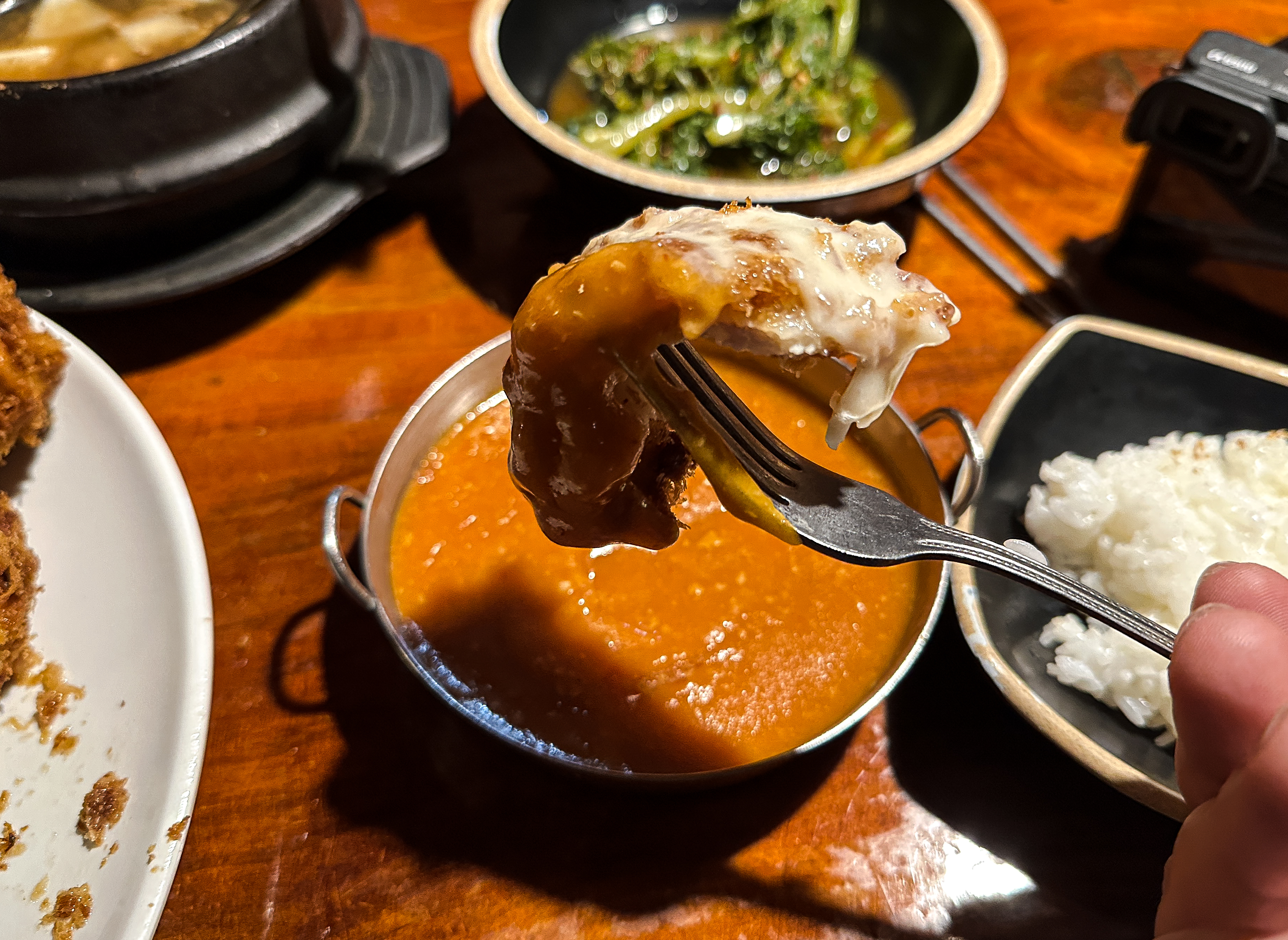 동촌의 치즈돈까스에는 치즈가 정말 많이 들어있는데, 돈까스를 반으로 갈라 보면 치즈가 주르륵 흘러나오는 것을 볼 수 있었습니다. 바삭한 식감의 튀김옷에 고기 또한 두꺼워서 씹는 식감도 괜찮았고 양도 제법 많은 편이라 배불리 식사할 수 있었습니다. 소스는 채소와 오이피클(?)이 들어간 새콤한 맛인데 튀김과 잘 어울리니 지금까지 생각나는 것이겠죠?