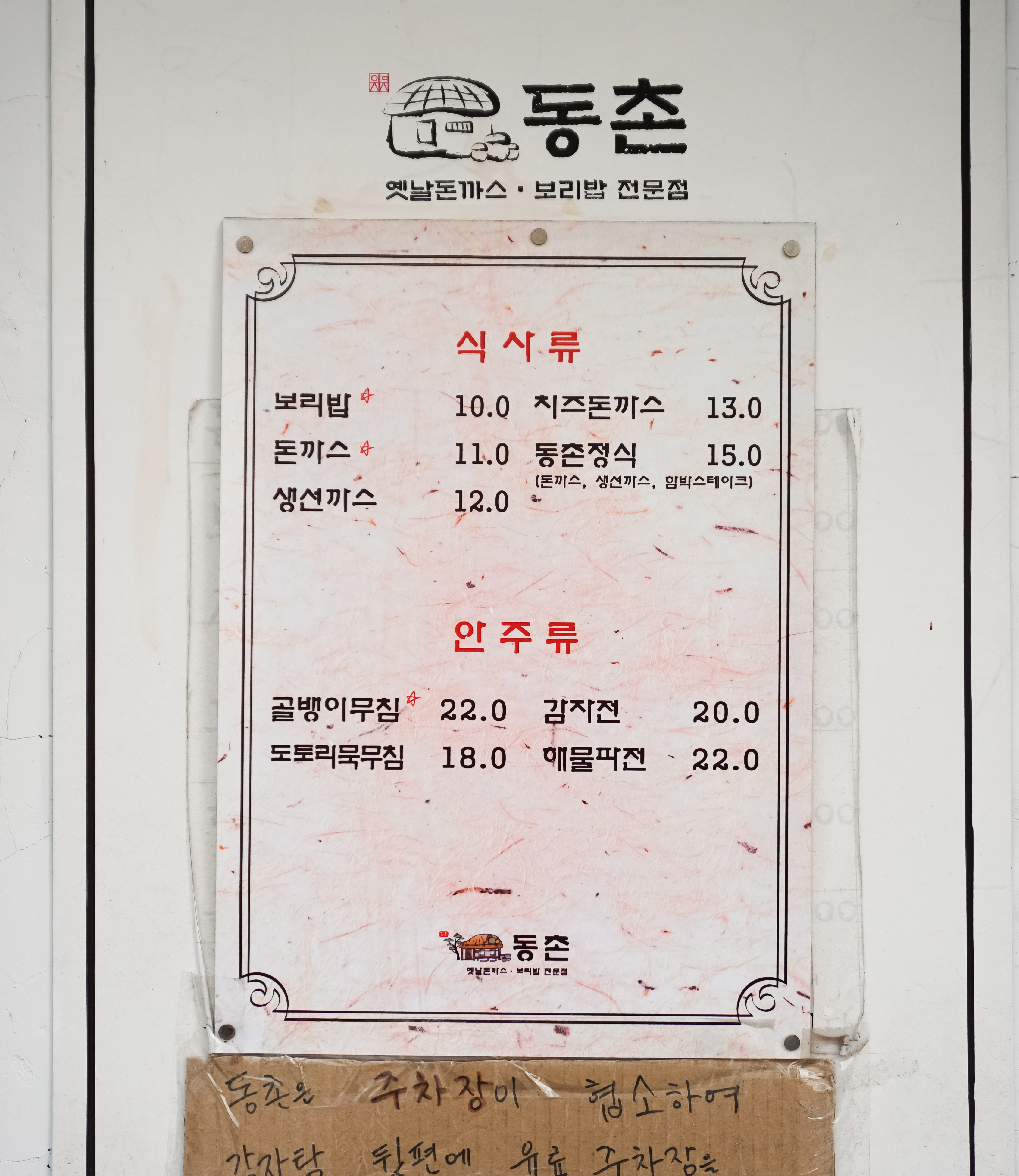 거여동 동촌의 메뉴는 위와 같습니다. 보리밥, 돈까스, 생선까스, 치즈돈까스, 동촌정식, 골뱅이무침, 도토리묵무침, 감자전, 해물파전 등이 있었습니다. 오랫동안 이용하면서 가장 큰 변화는 이전에는 서비스였던 부분이 요즘엔 전부 추가요금을 받고 제공한다는 점이었습니다. 그래도 어쩌겠나요 다시 생각나니 방문했죠.