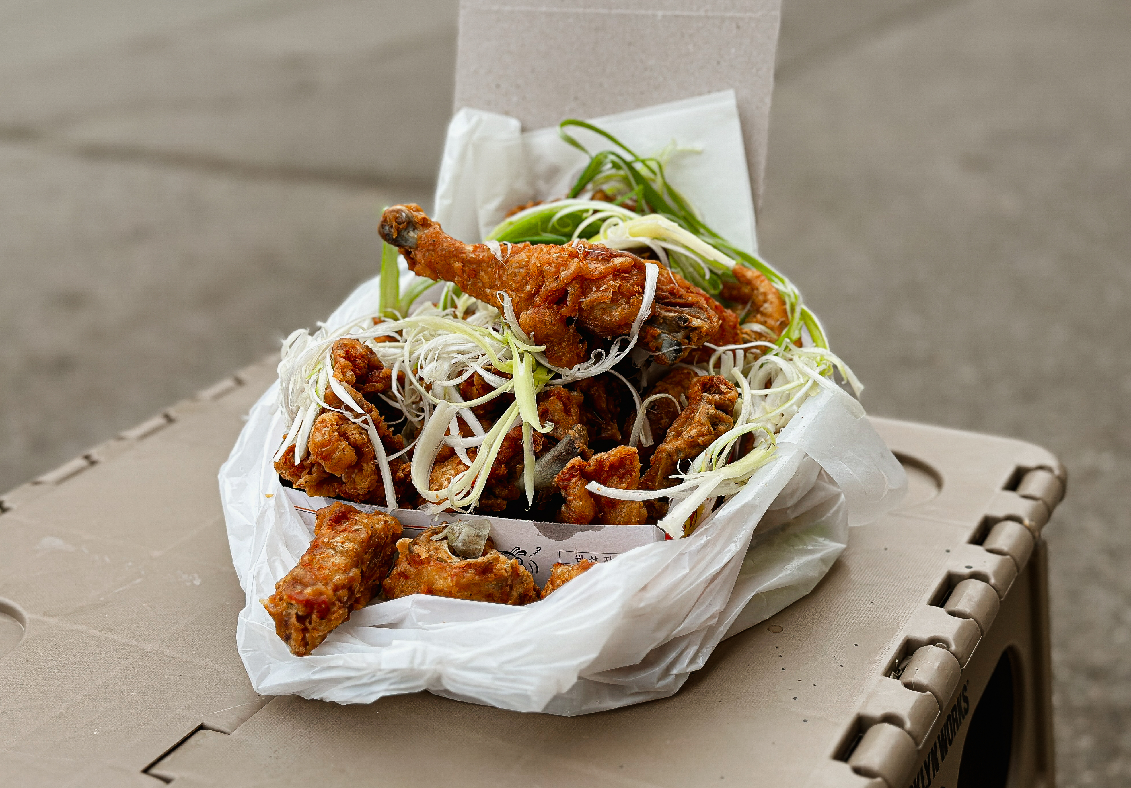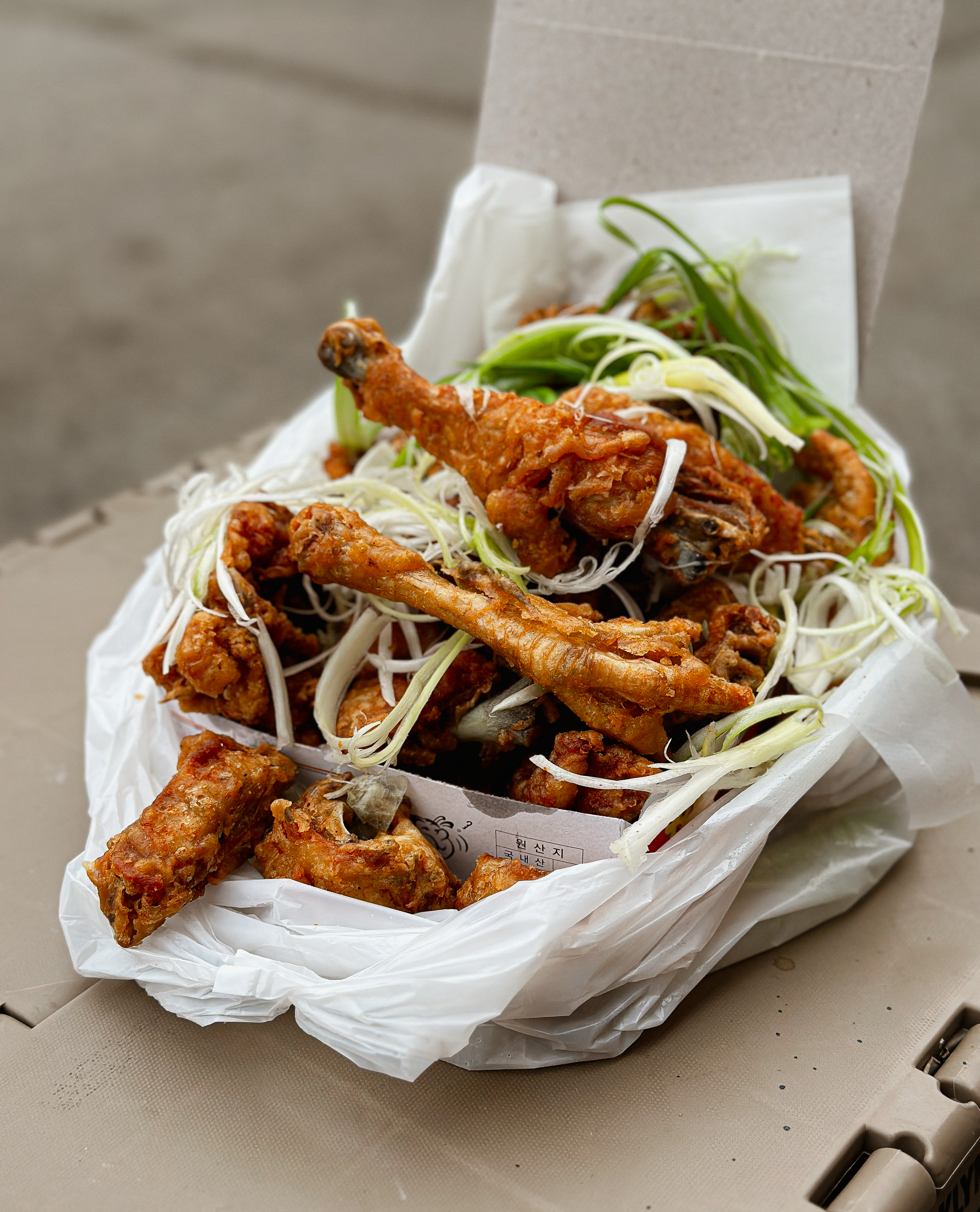 아주머니께서 직접 닭을 염지하고 미리 손질해둔 닭을 튀겨주셨는데, 시장통닭이라 그런지 모습은 좀 요즘 치킨들처럼 세련되어 보이진 않지만, 노란 빛깔의 통닭은 생각보다 맛있어 보이더라고요. 추가로 사장님께 요구하면 파도 직접 채 썰어 주시는데, 저희는 파채까지 올려 먹기로 했기 때문에 파채도 요청드렸습니다.