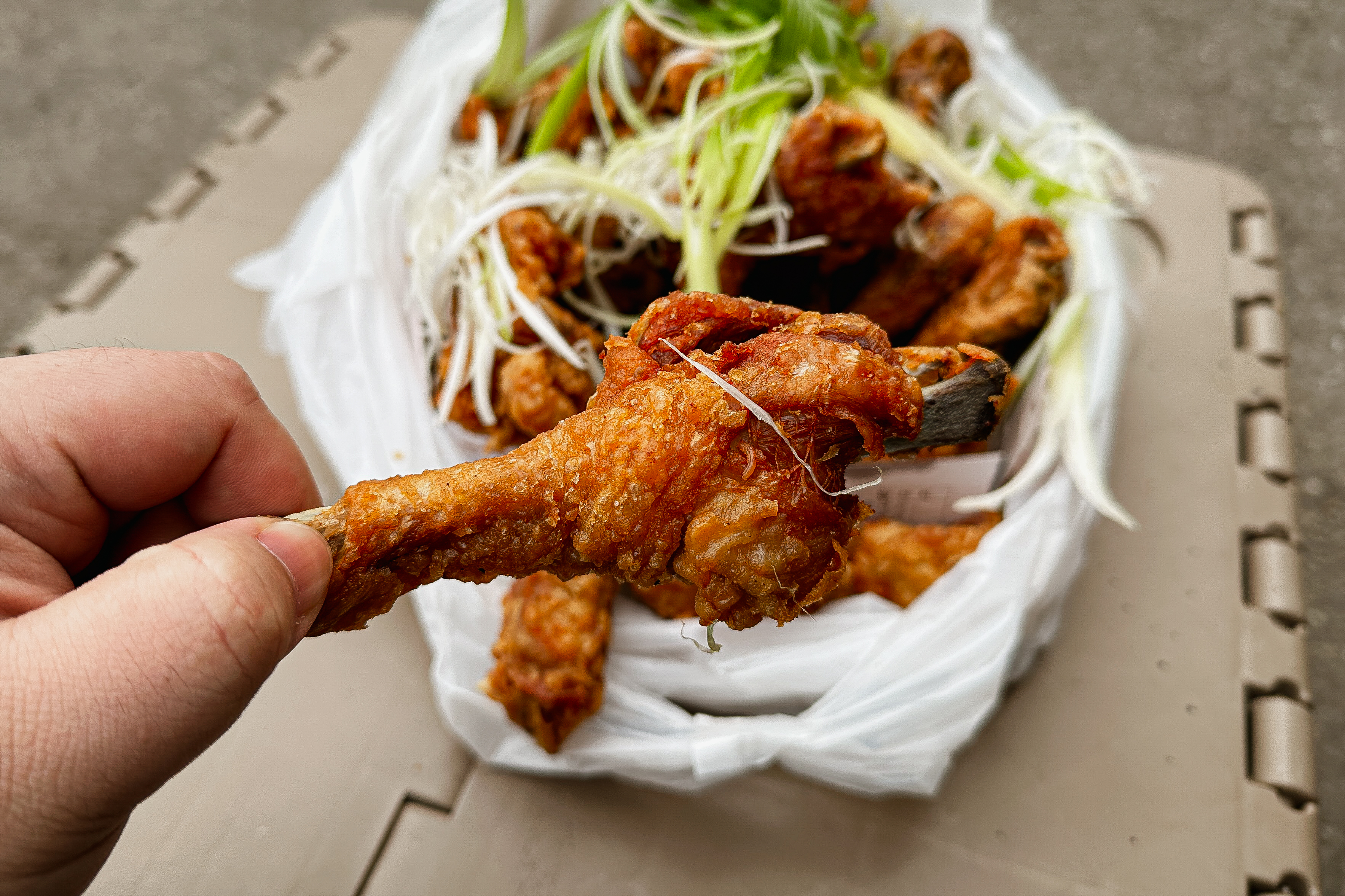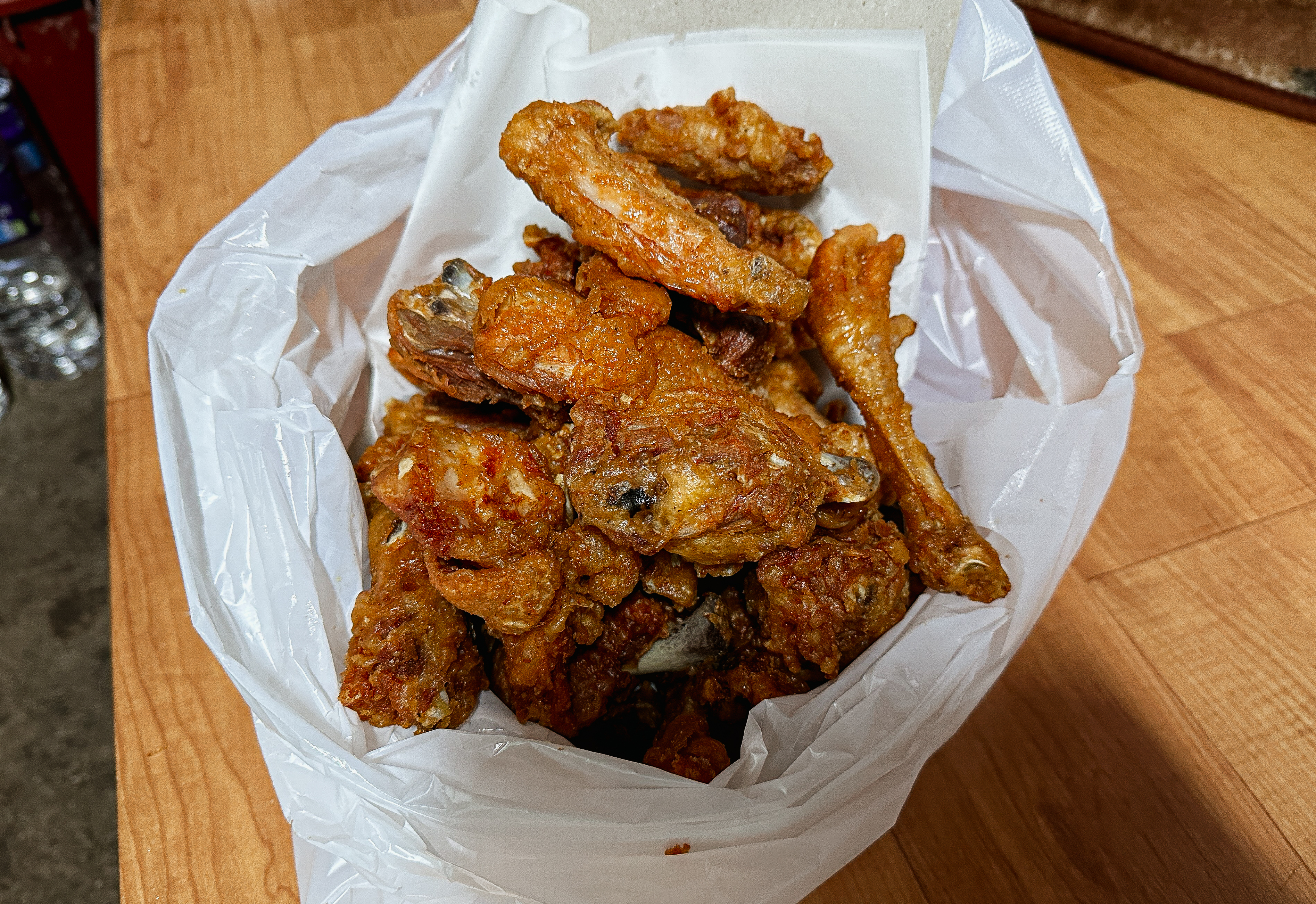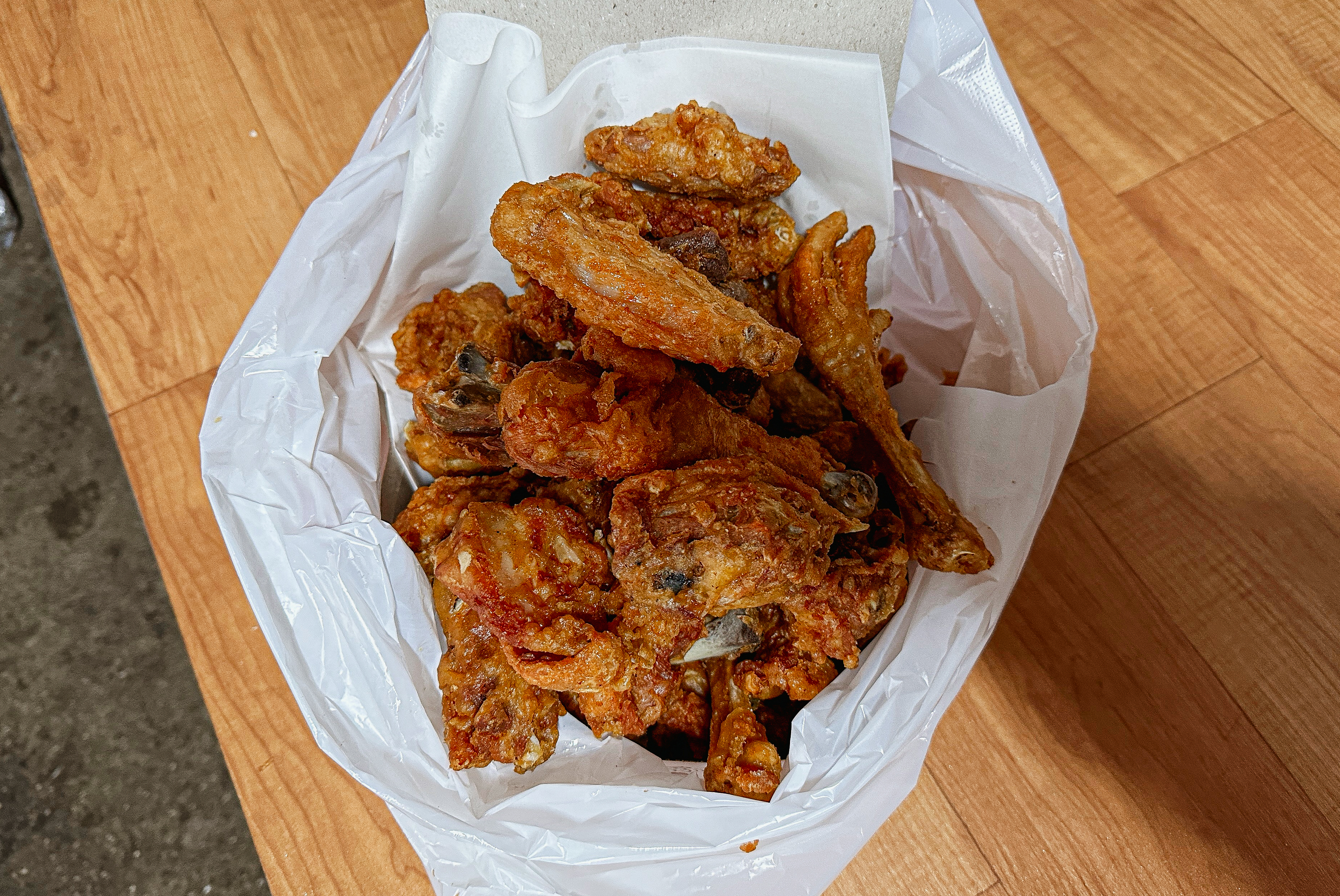 문백닭집의 치킨은 바삭하면서도 맛이 괜찮았습니다. 사실, 시골에 위치한 시장 통닭이다 보니 큰 기대 없이 집어 들었는데, 이게 생각보다 간도 잘 배어있고 맛있더라고요. 특이한 것은 보통 치킨에서 보기 힘든 닭발도 있고 크기가 토종닭이라 크다는 점이었습니다.