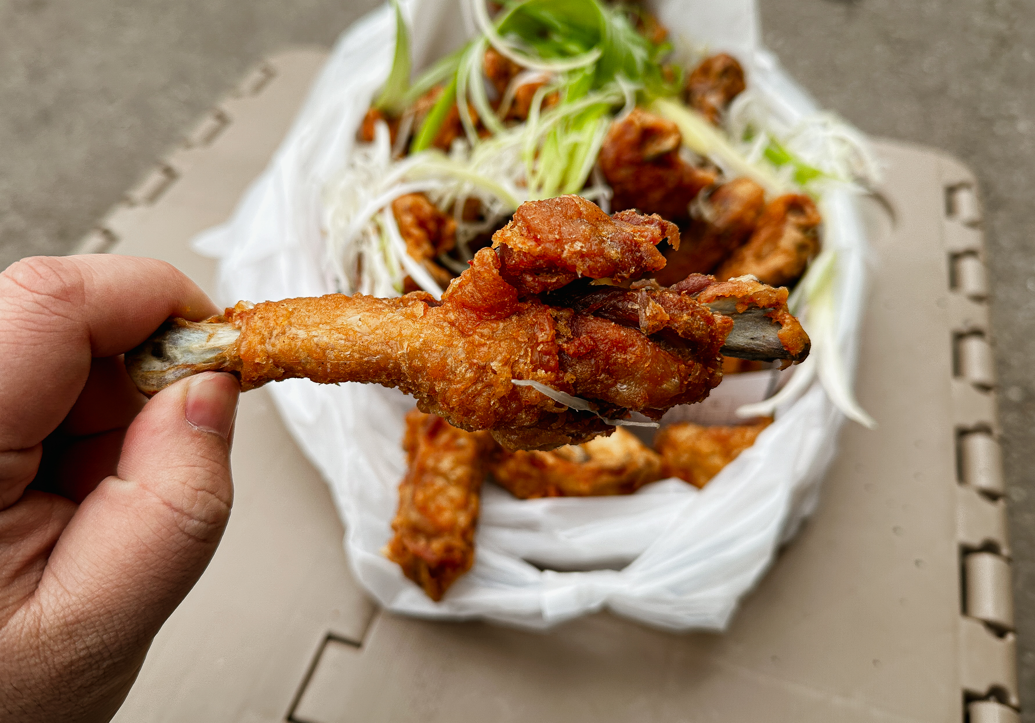 아주머니께서 직접 닭을 염지하고 미리 손질해둔 닭을 튀겨주셨는데, 시장통닭이라 그런지 모습은 좀 요즘 치킨들처럼 세련되어 보이진 않지만, 노란 빛깔의 통닭은 생각보다 맛있어 보이더라고요. 추가로 사장님께 요구하면 파도 직접 채 썰어 주시는데, 저희는 파채까지 올려 먹기로 했기 때문에 파채도 요청드렸습니다.