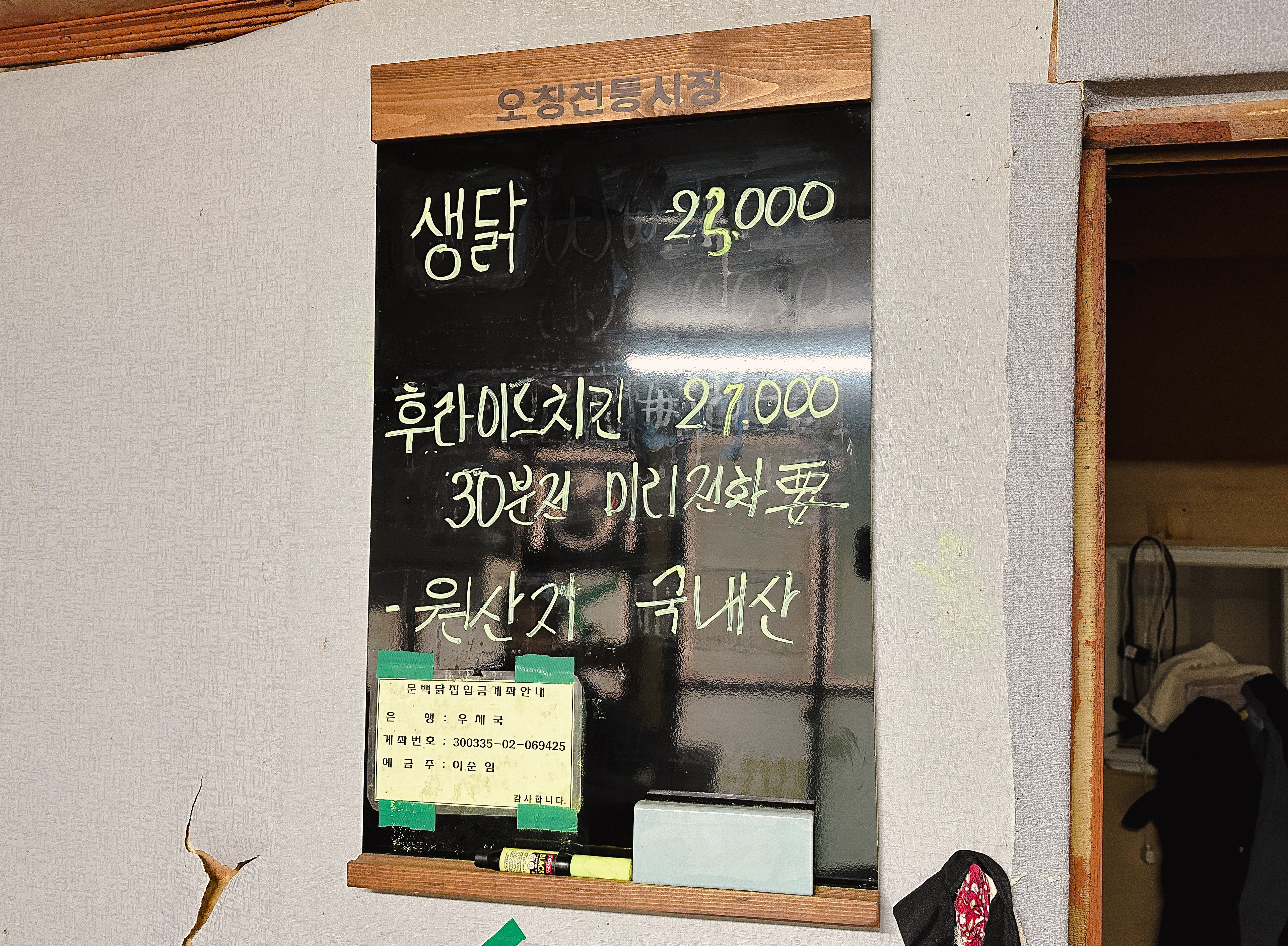 오창 문백닭집의 메뉴는 위와 같습니다. 생닭 23,000원, 후라이드치킨 27,000원 이었습니다. 원산지는 국내산이었고, 후라이드치킨의 가격만 놓고 보면 비싼 듯했지만, 토종닭 요리가 대부분 4~5만 원대라는 것을 생각하면 또 비싸지만도 않은 것 같았습니다.