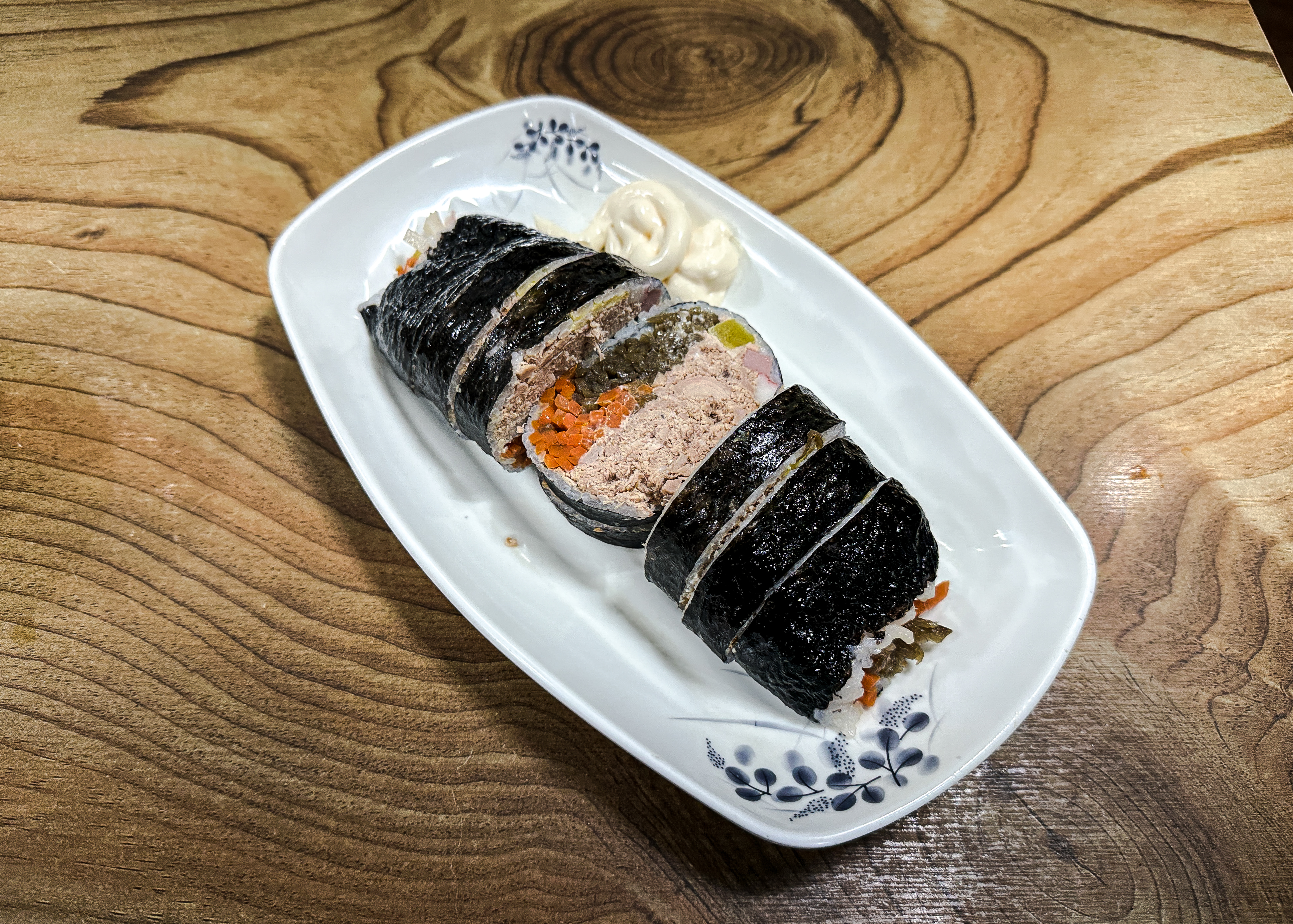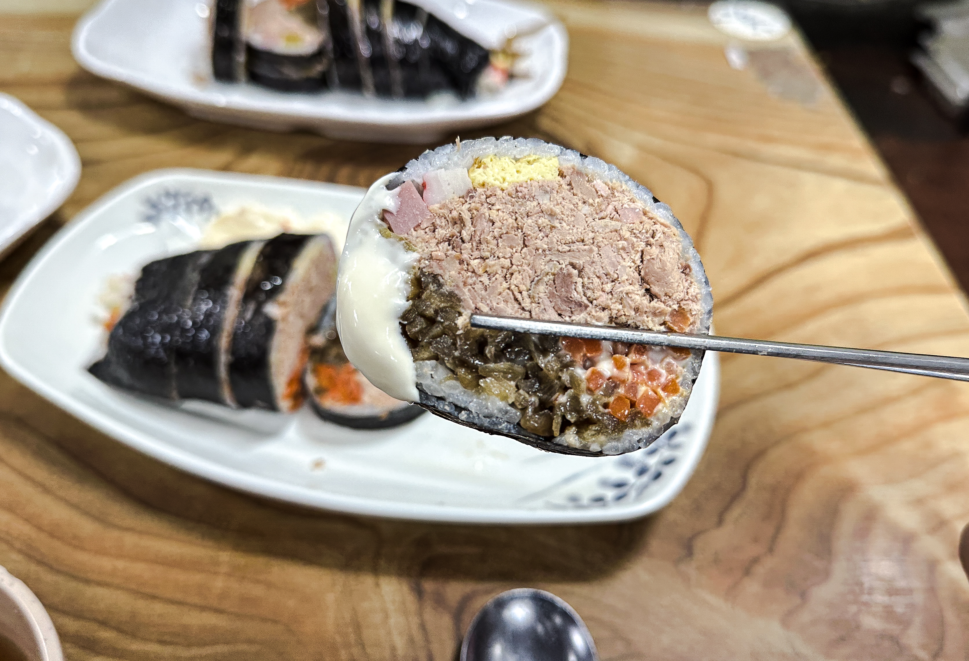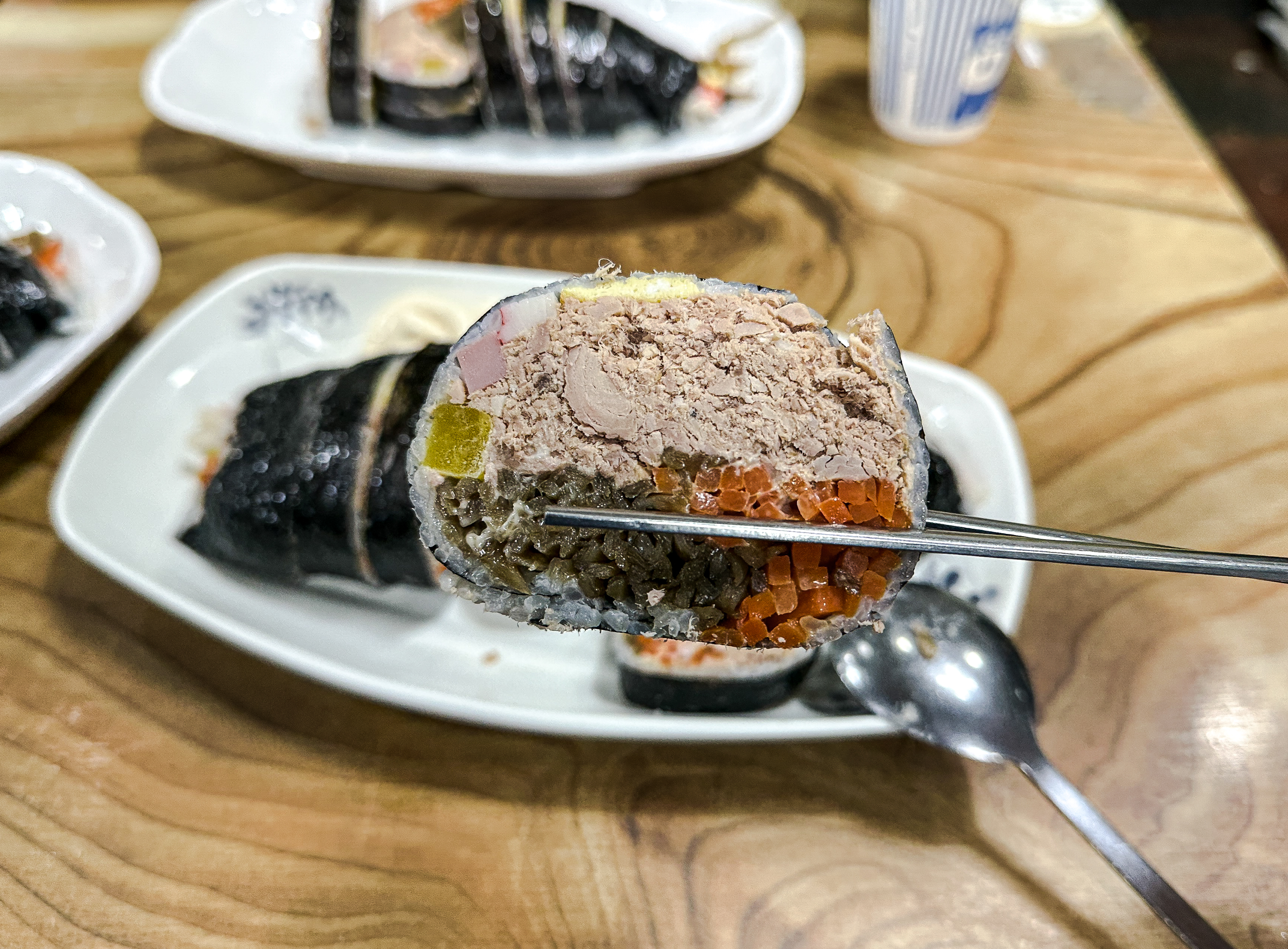 참치폭탄김밥 만드는 과정이 궁금해서 사장님께 양해를 구하고 사진을 찍어보았습니다. 참치폭탄김밥에는 달걀지단, 맛살, 햄, 단무지, 우엉, 당근이 들어갔고 참치를 수북하게 쌓아 올려주었고, 제육김밥도 비슷한 구성이었습니다. 전체적으로 김밥의 가격은 학교 근처여서 그런지 크게 부담스럽지는 않았고, 김밥 두께도 꽤 두꺼운 편이었습니다.