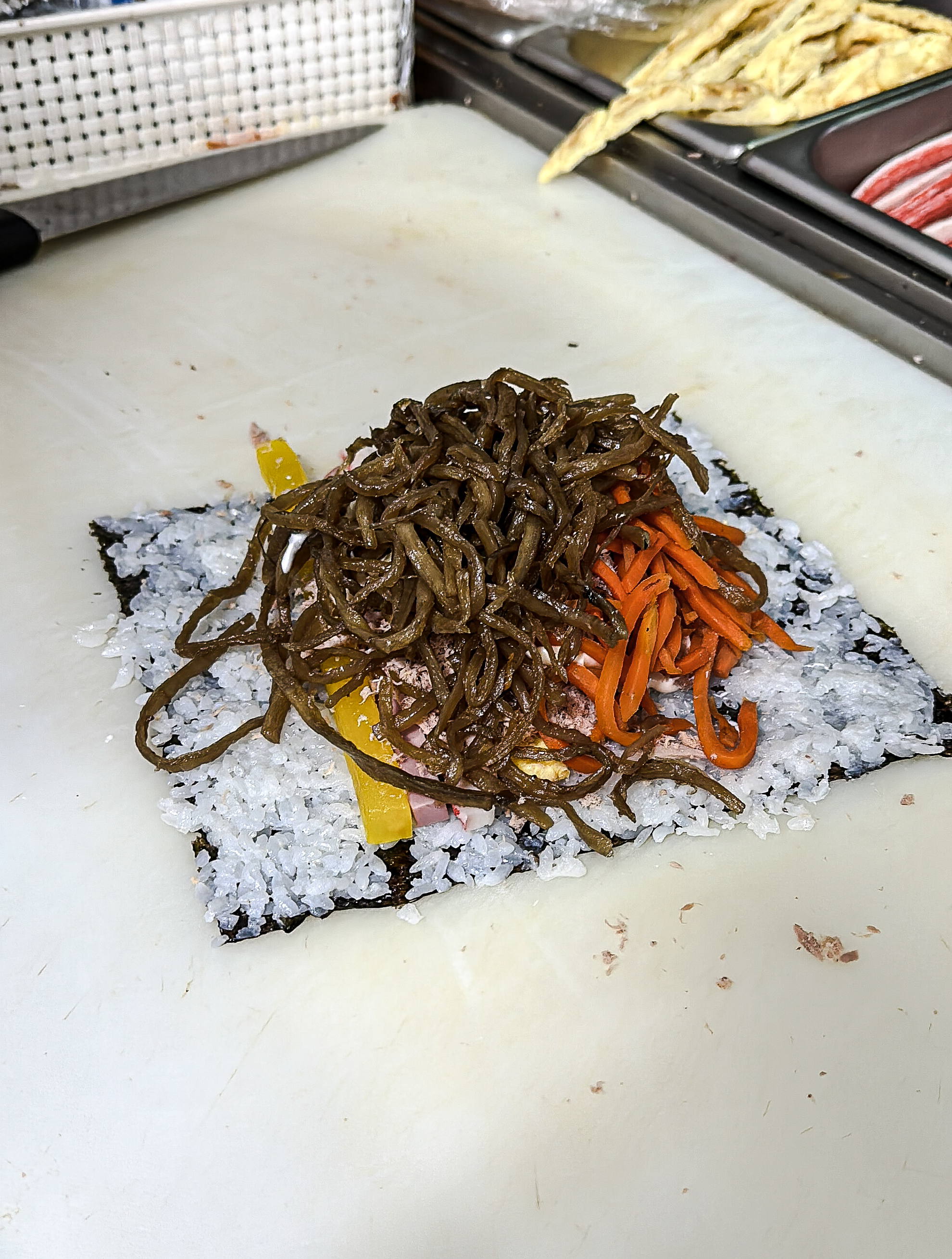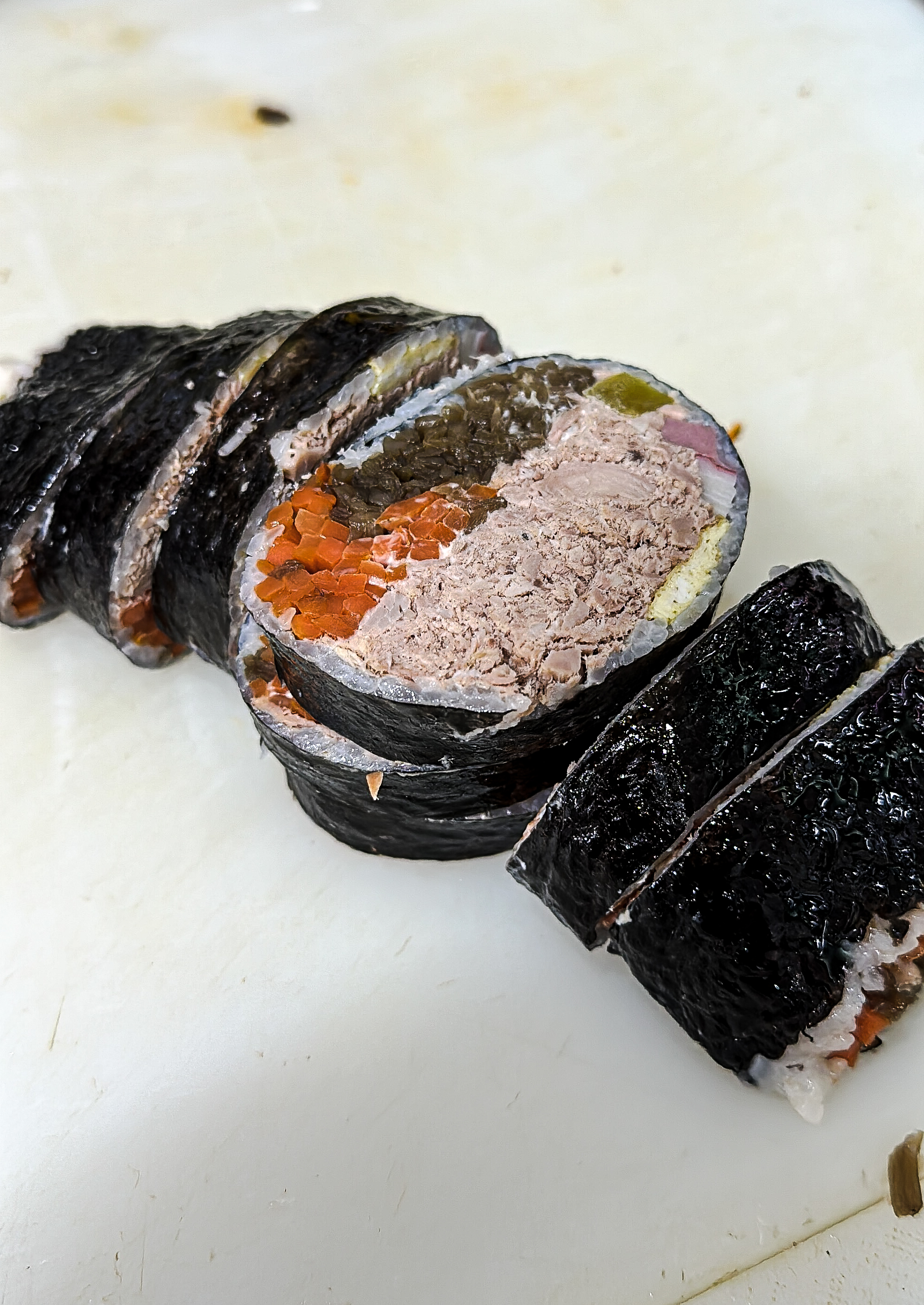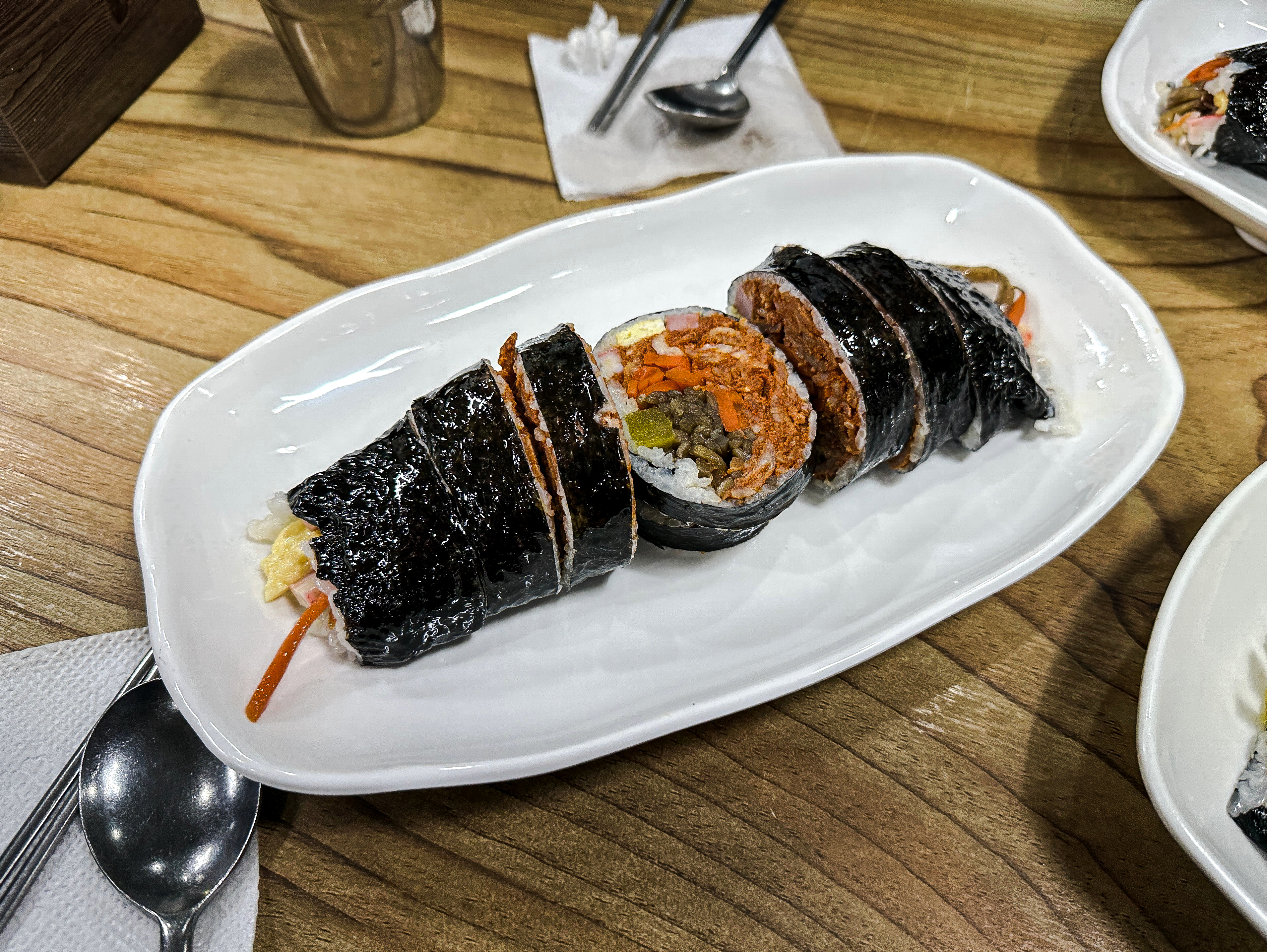 참치폭탄김밥 만드는 과정이 궁금해서 사장님께 양해를 구하고 사진을 찍어보았습니다. 참치폭탄김밥에는 달걀지단, 맛살, 햄, 단무지, 우엉, 당근이 들어갔고 참치를 수북하게 쌓아 올려주었고, 제육김밥도 비슷한 구성이었습니다. 전체적으로 김밥의 가격은 학교 근처여서 그런지 크게 부담스럽지는 않았고, 김밥 두께도 꽤 두꺼운 편이었습니다.