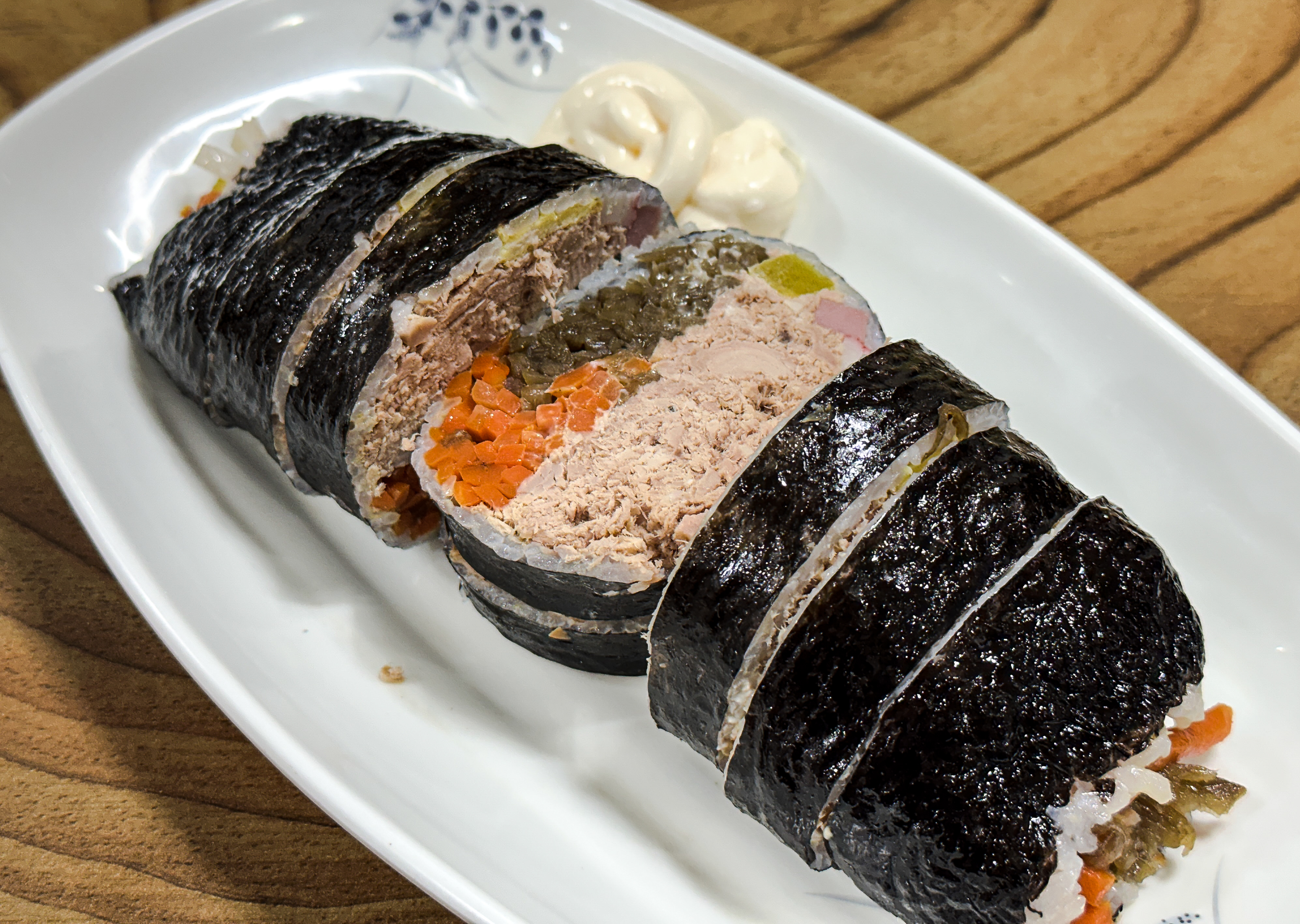 이공김밥의 참치폭탄김밥은 두께가 두꺼운 만큼 참치가 정말 많이 들어있었습니다. 다만 아쉬운 점은 일반적인 김밥집의 참치김밥은 깻잎이 들어가는데, 이곳의 참치김밥은 참치와 마요네즈만 들어간다는 점이었습니다. 김밥은 마요네즈를 찍어먹을 수 있도록 별도로 제공하고 있었습니다. 참치가 많아서 좋았지만, 먹다 보니 살짝 목이 메더라고요. 제육김밥 또한 재료가 넉넉하게 들어가는 편이었고, 살짝 매콤해서 맛이 더 좋았습니다.