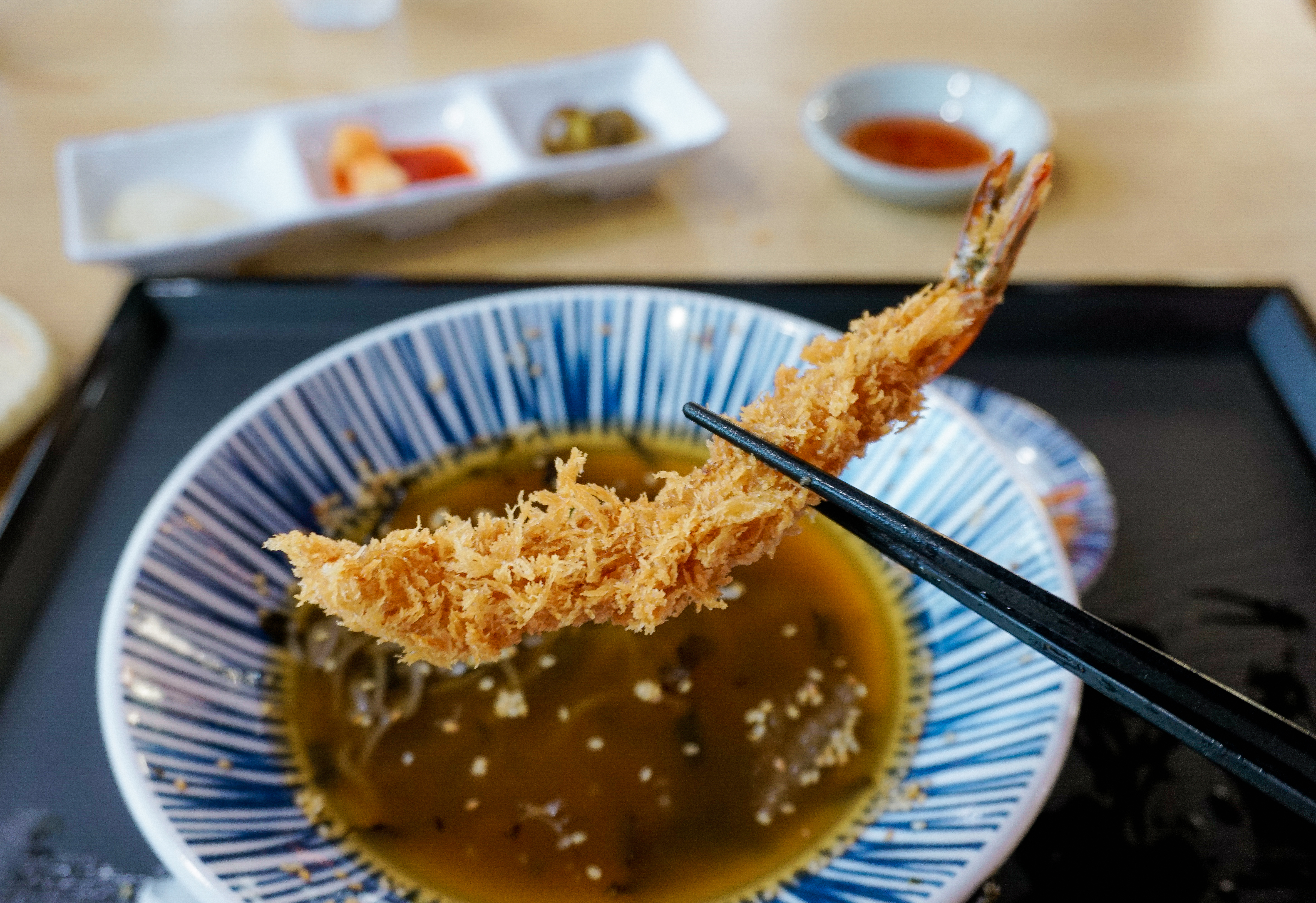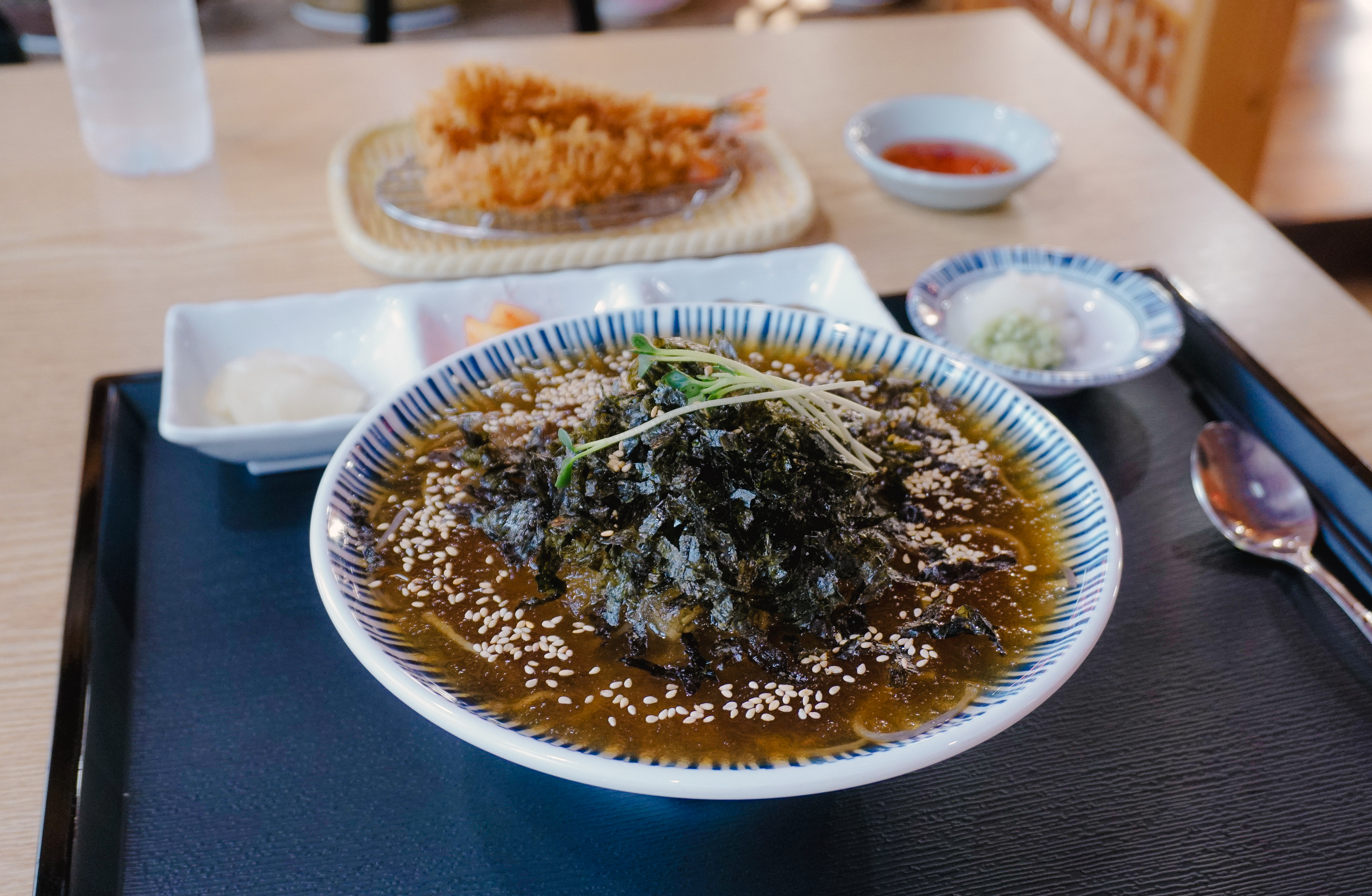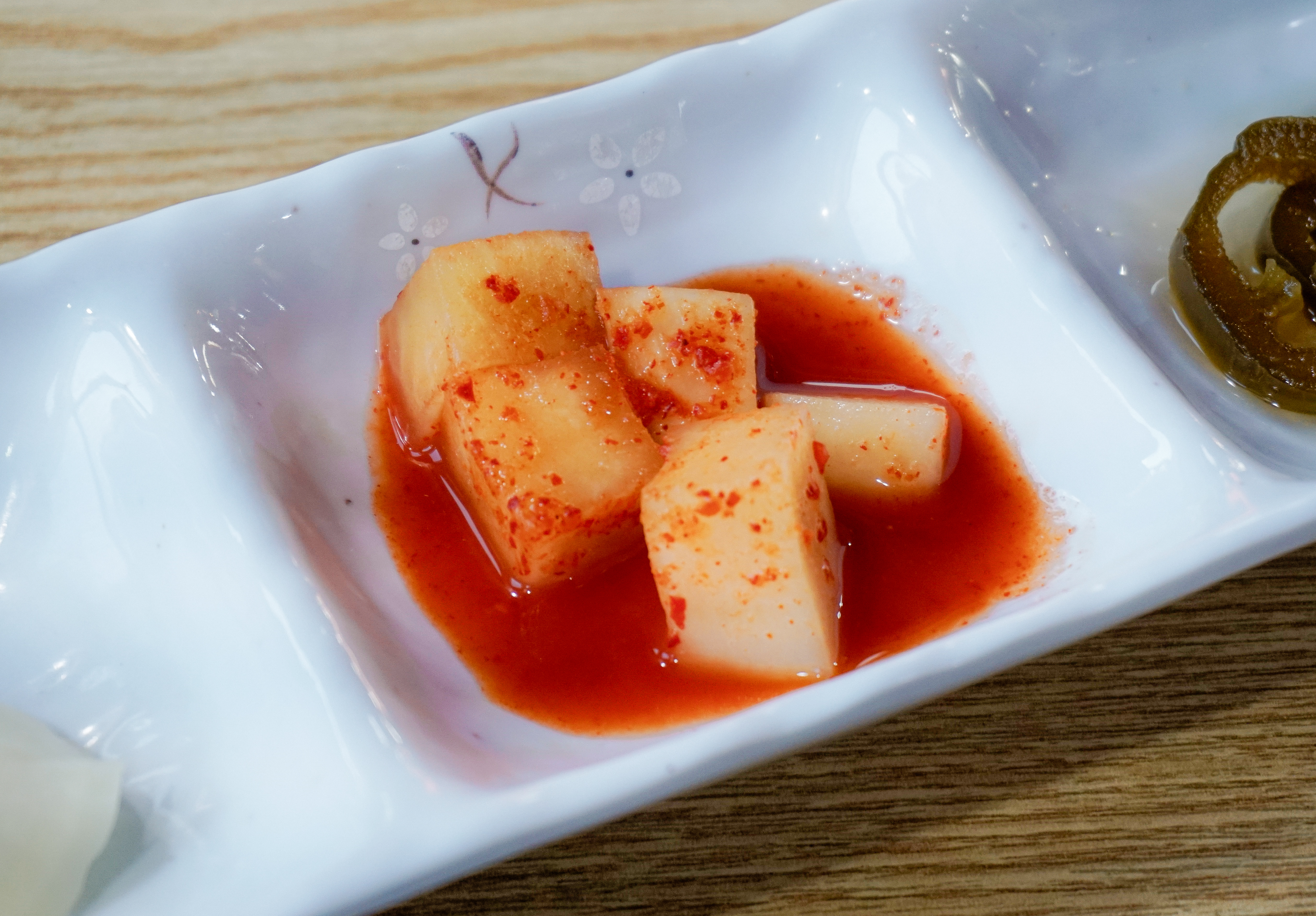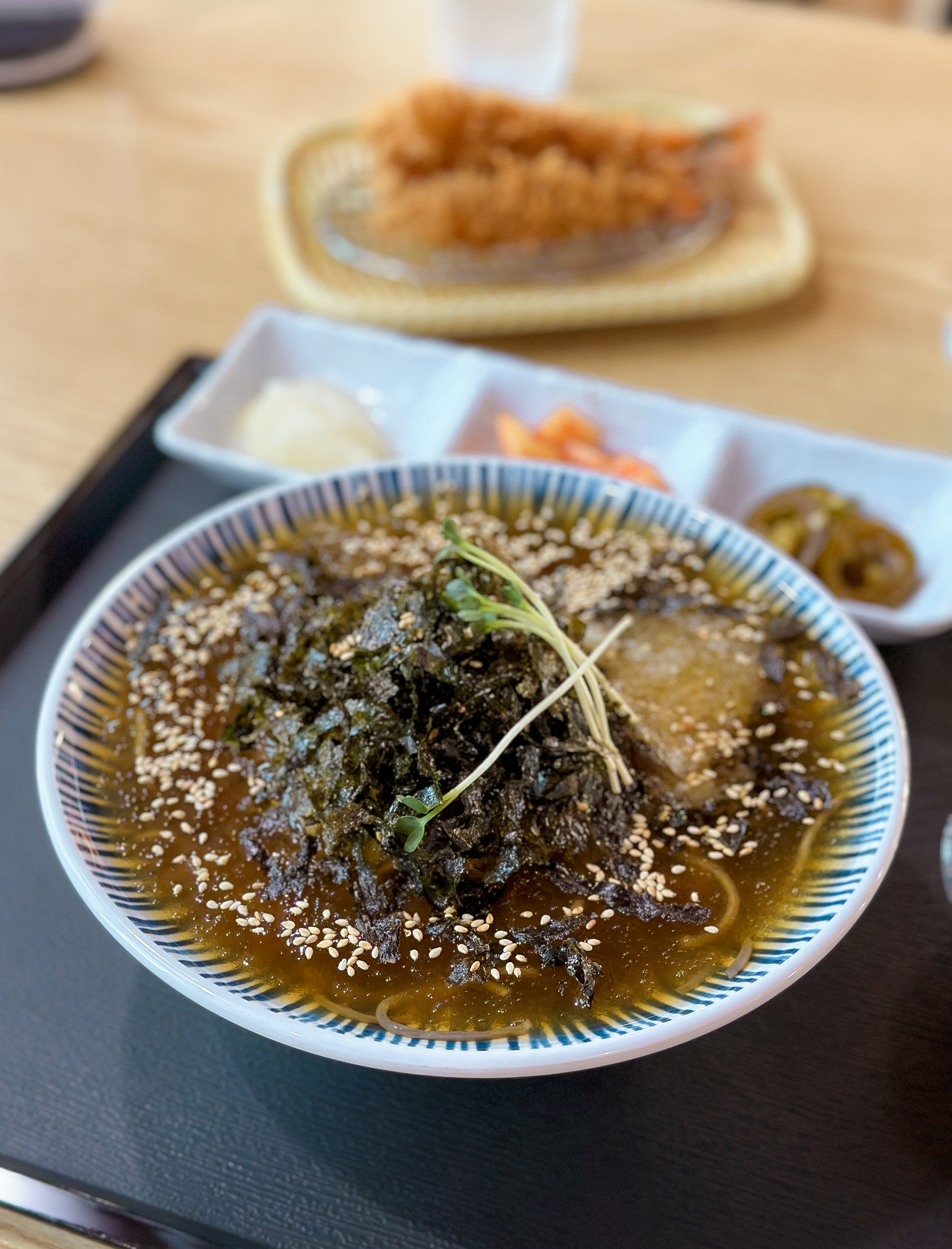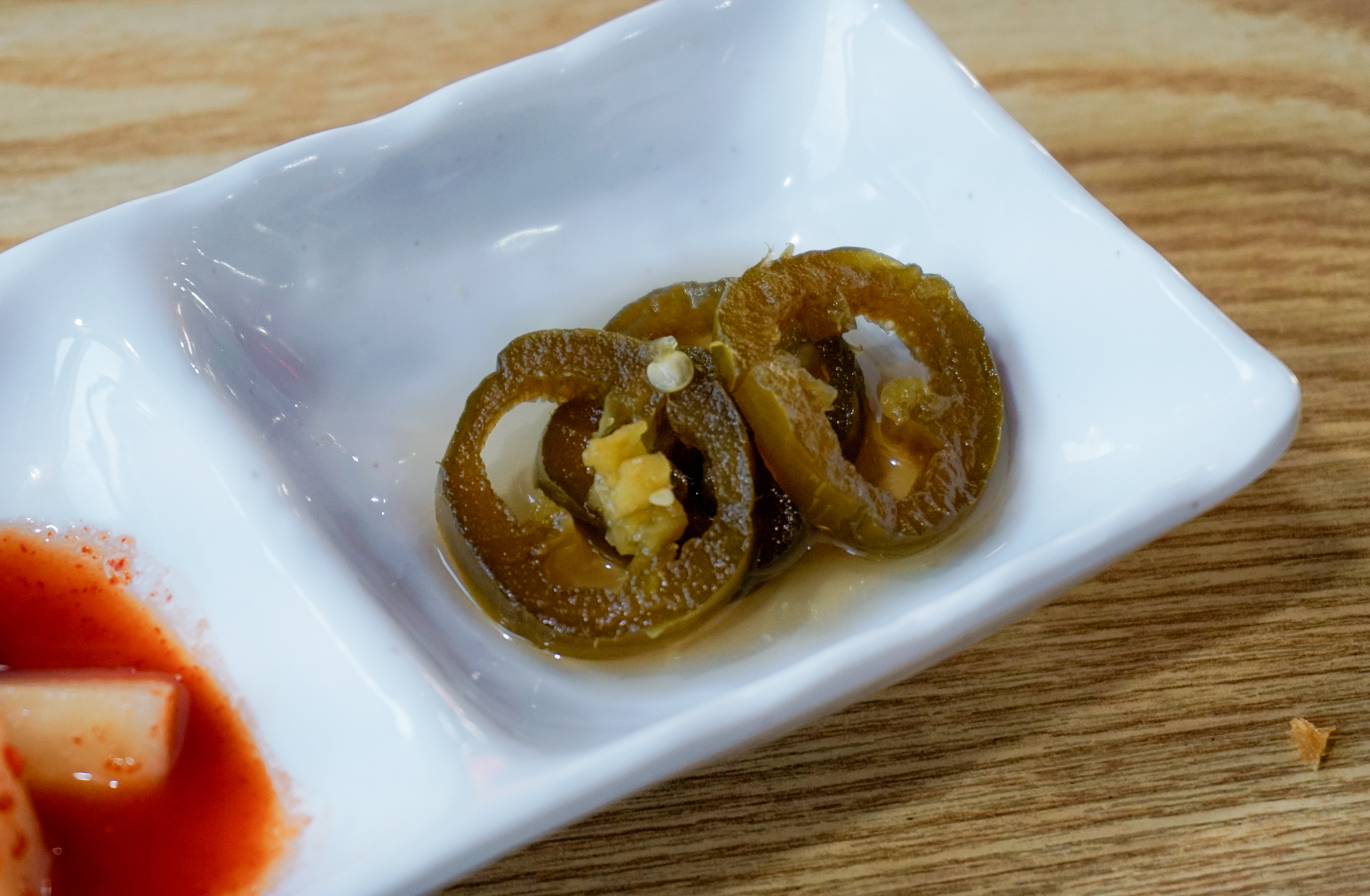 냉모밀과 새우튀김이 나왔습니다. 냉모밀은 2020년(링크)에 한 번 소개해드린 적이 있었죠. 2020년과 비교해 구성은 비슷해 보였지만, 오이향을 싫어하는 분들이 계셔서 그랬는지, 오이가 빠져있더라고요. 마니온의 밑반찬은 조금씩 바뀌는데 이번엔 유자향이 은은하게 나는 단무지와 깍두기, 할라피뇨가 나왔습니다.