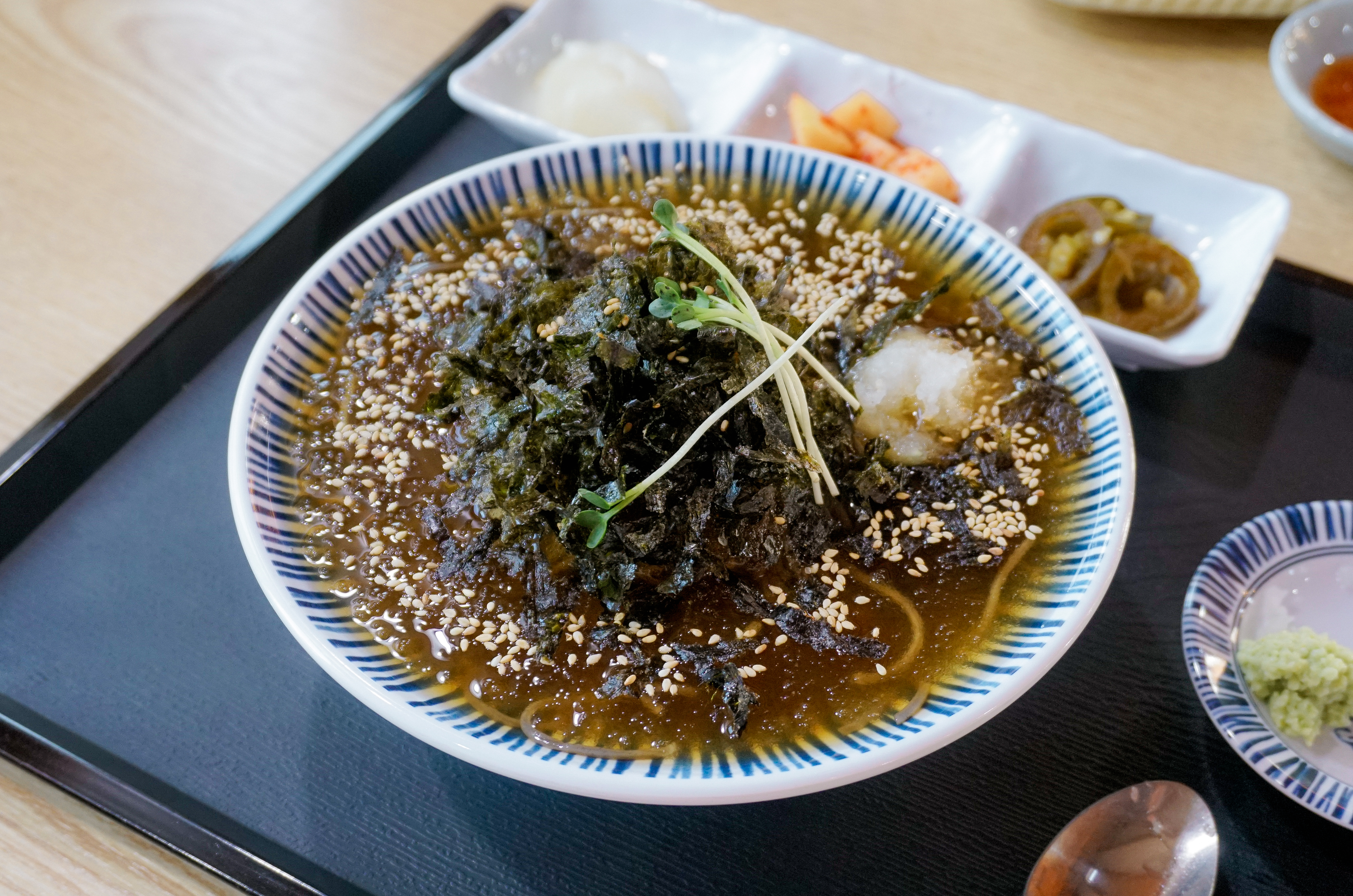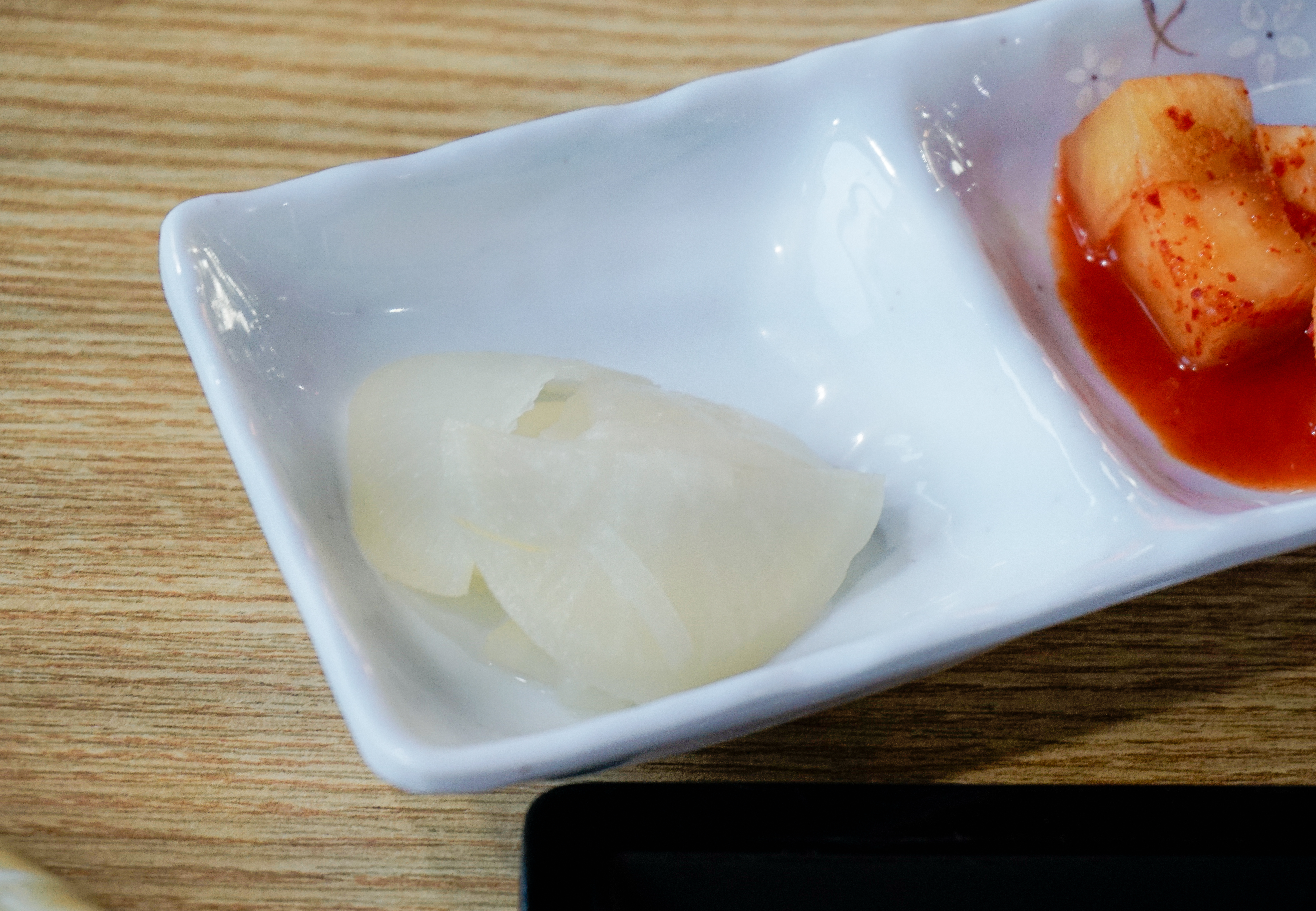 냉모밀과 새우튀김이 나왔습니다. 냉모밀은 2020년(링크)에 한 번 소개해드린 적이 있었죠. 2020년과 비교해 구성은 비슷해 보였지만, 오이향을 싫어하는 분들이 계셔서 그랬는지, 오이가 빠져있더라고요. 마니온의 밑반찬은 조금씩 바뀌는데 이번엔 유자향이 은은하게 나는 단무지와 깍두기, 할라피뇨가 나왔습니다.
