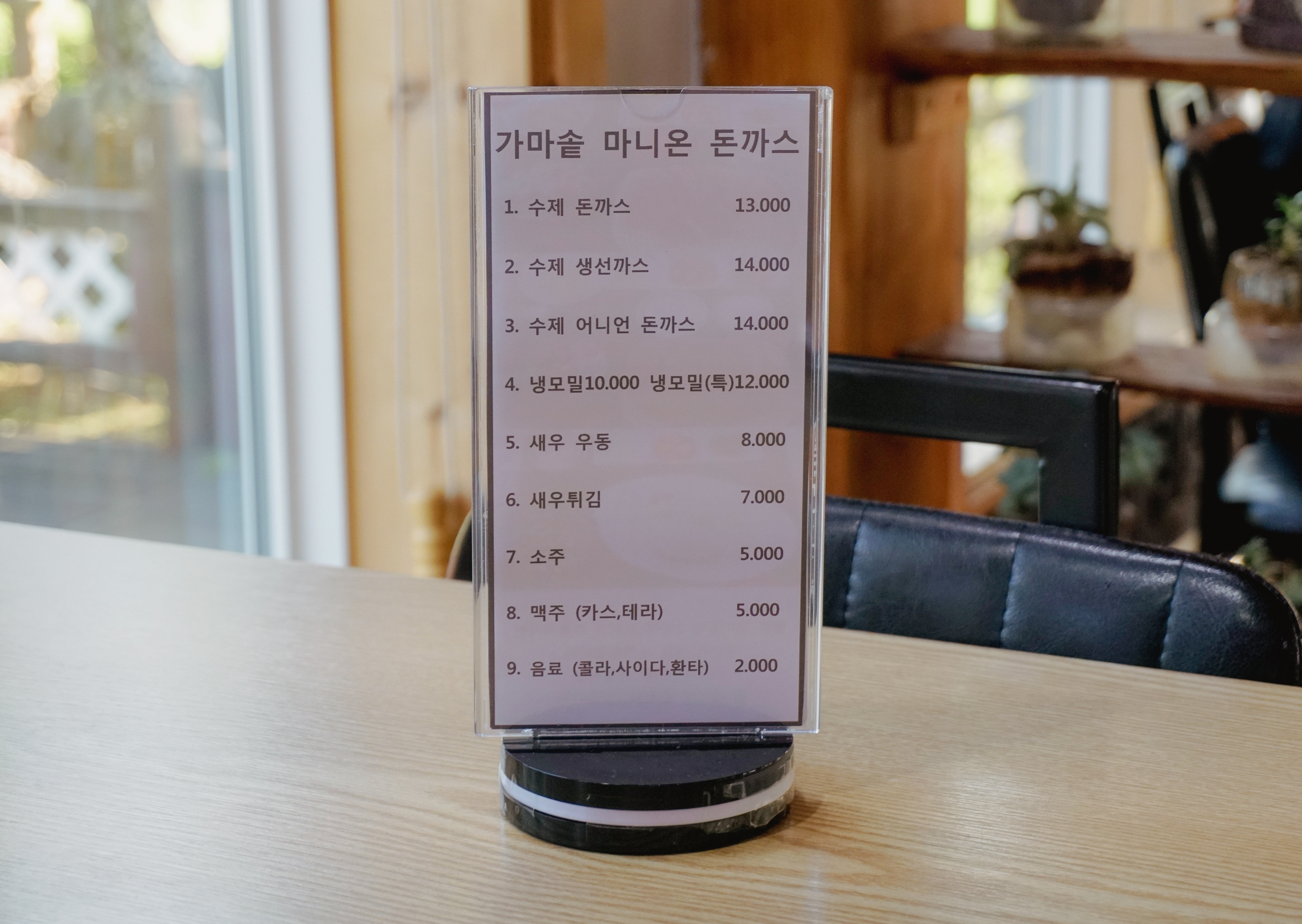 강화 마니온의 메뉴는 수제돈까스, 수제생선까스, 수제어니언돈까스, 냉모밀, 새우우동, 새우튀김 등이 있었습니다. 김치나베우동이라는 메뉴가 아무래도 겨울메뉴여서 그런지 냉모밀로 대체되었다는 것을 제외하고, 가격은 이전과 동일했습니다. 메뉴 주문은 1인 1메뉴로 하도록 되어있었습니다.