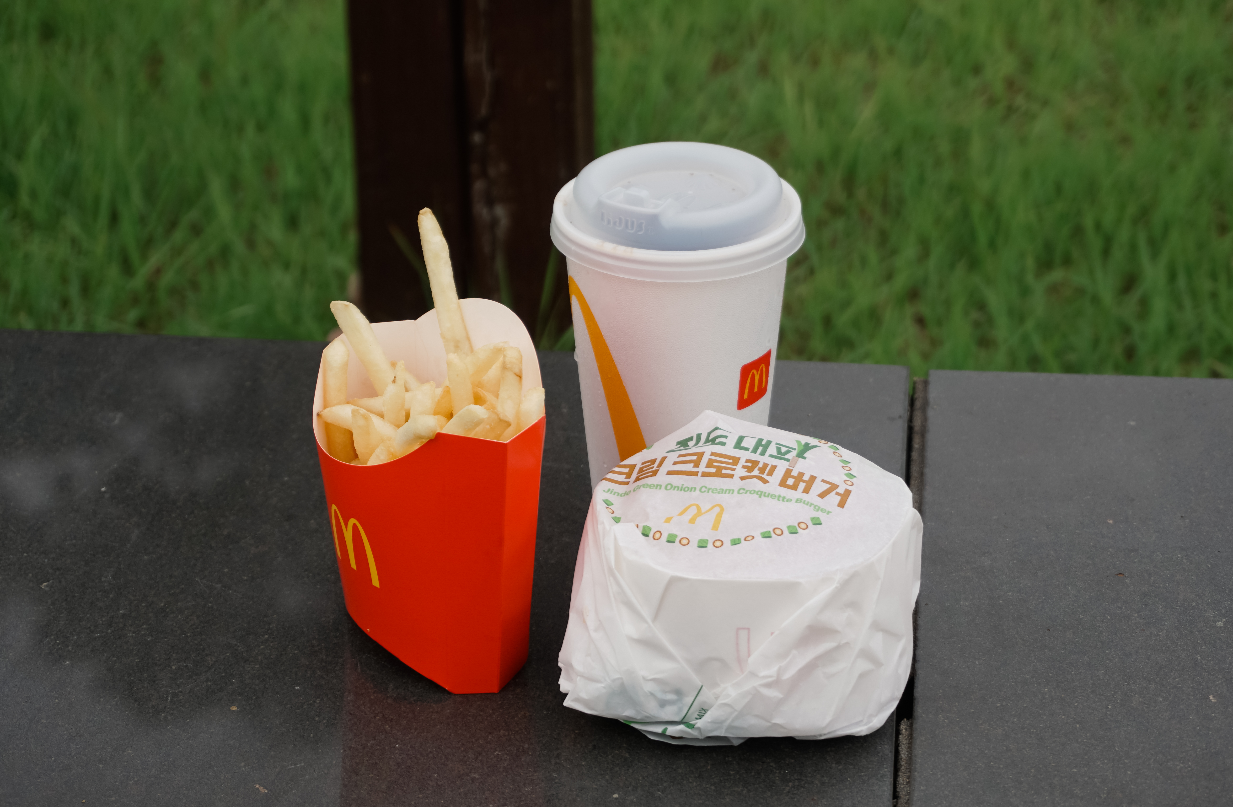 맥도날드의 진도대파 크림크로켓버거의 세트 구성은 진도 대파 크림 크로켓 버거와 감자튀김, 콜라로 구성되어 있었습니다. 그리고 추가금액을 지불하면 맥쉐이커 '허니버터 인절미후라이'와 '7곡 쉐이크'도 선택하여 먹을 수 있었습니다.