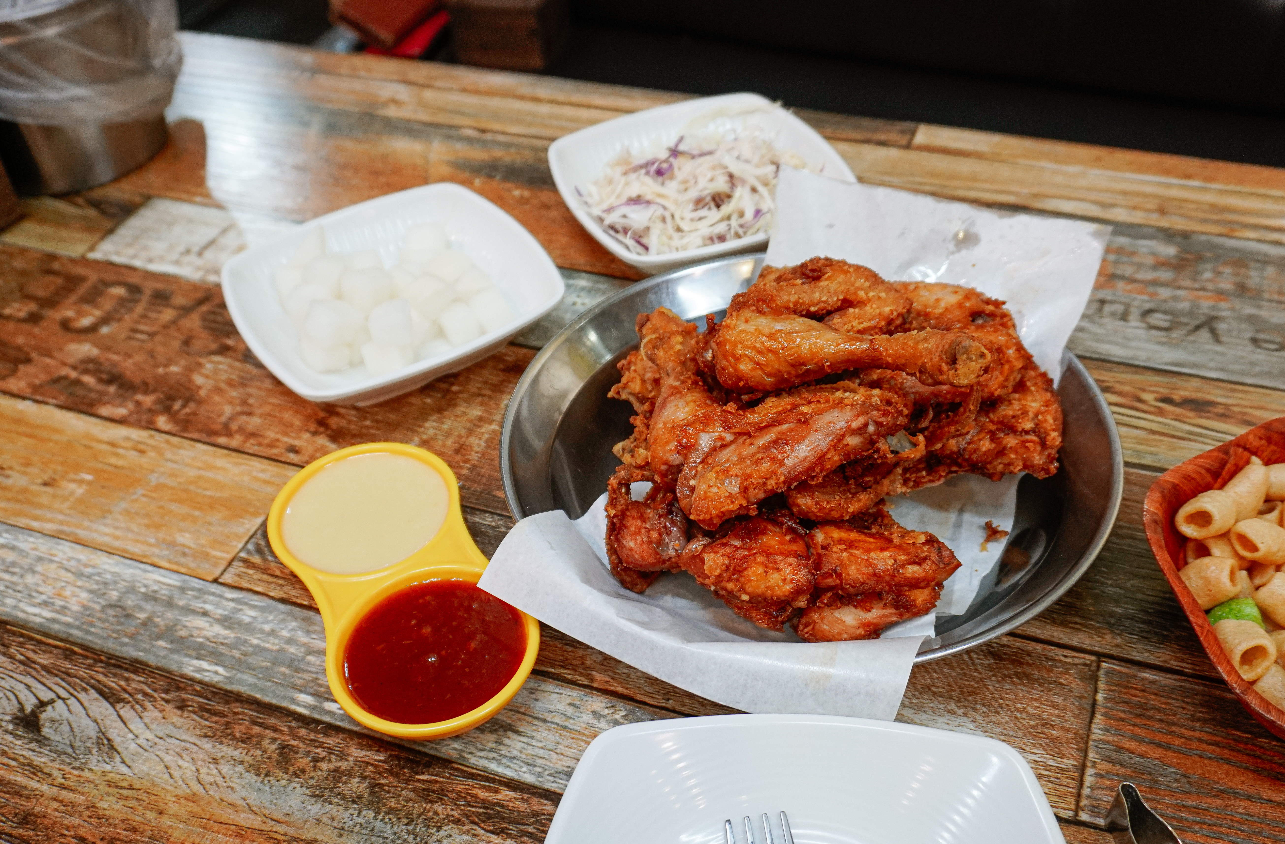 보드람치킨의 오리지날치킨이 나왔습니다. 치킨은 뻥튀기와 치킨무, 양배추샐러드, 소스와 함께 나왔습니다. 과연 이곳의 치킨도 한 마리 반이 나올 것인지 닭을 부위별로 분류해 보겠습니다.