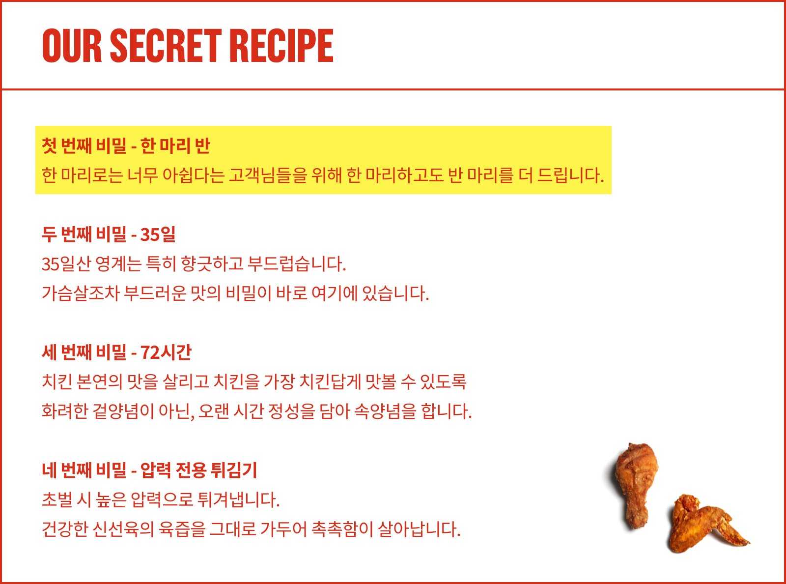 내용인 즉, '한 마리로는 너무 아쉽다는 고객님들을 위해 한 마리하고도 반 마리를 더 주게 되었다' 라고 합니다.