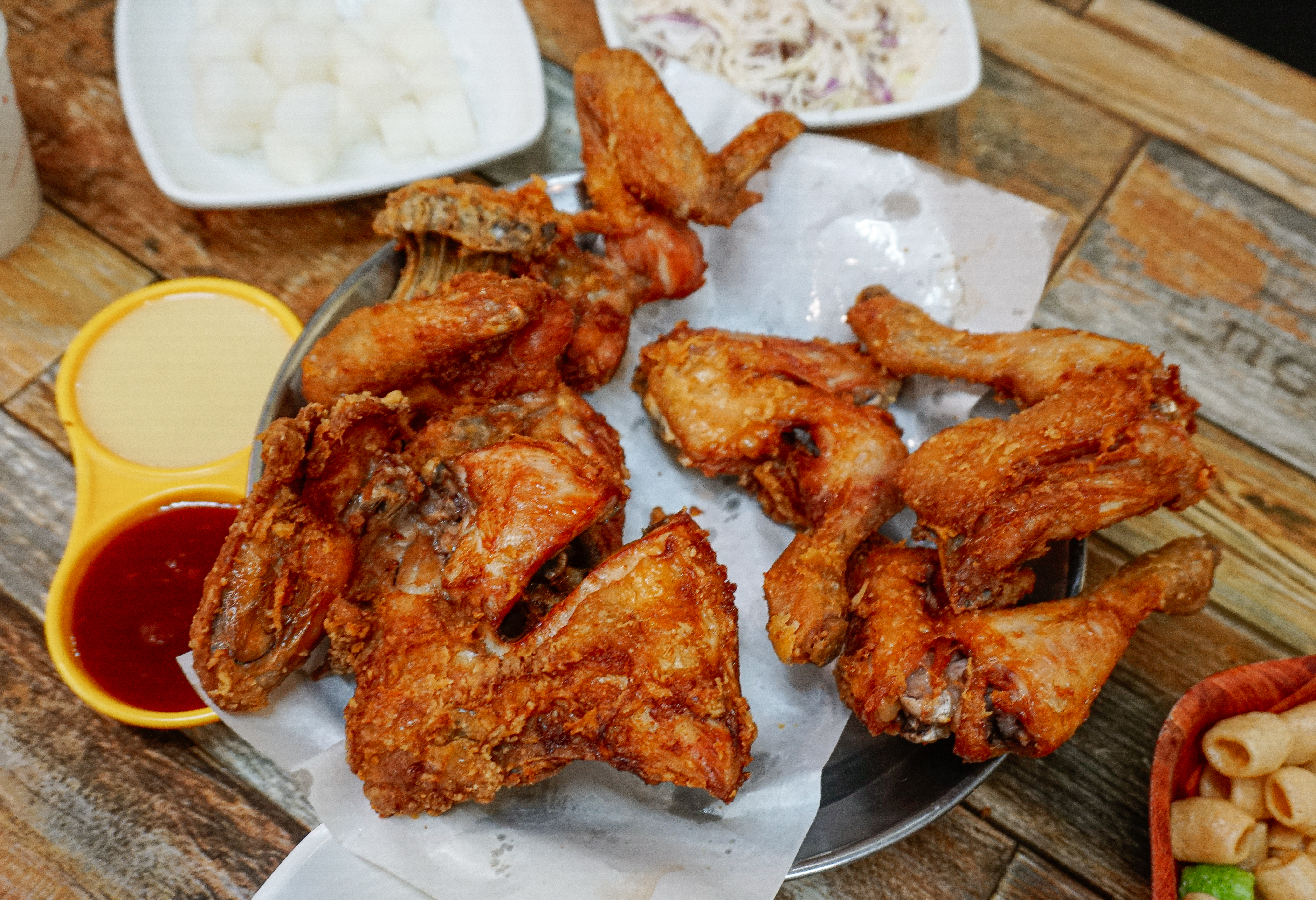 보드람치킨의 오리지날치킨이 나왔습니다. 치킨은 뻥튀기와 치킨무, 양배추샐러드, 소스와 함께 나왔습니다. 과연 이곳의 치킨도 한 마리 반이 나올 것인지 닭을 부위별로 분류해 보겠습니다.