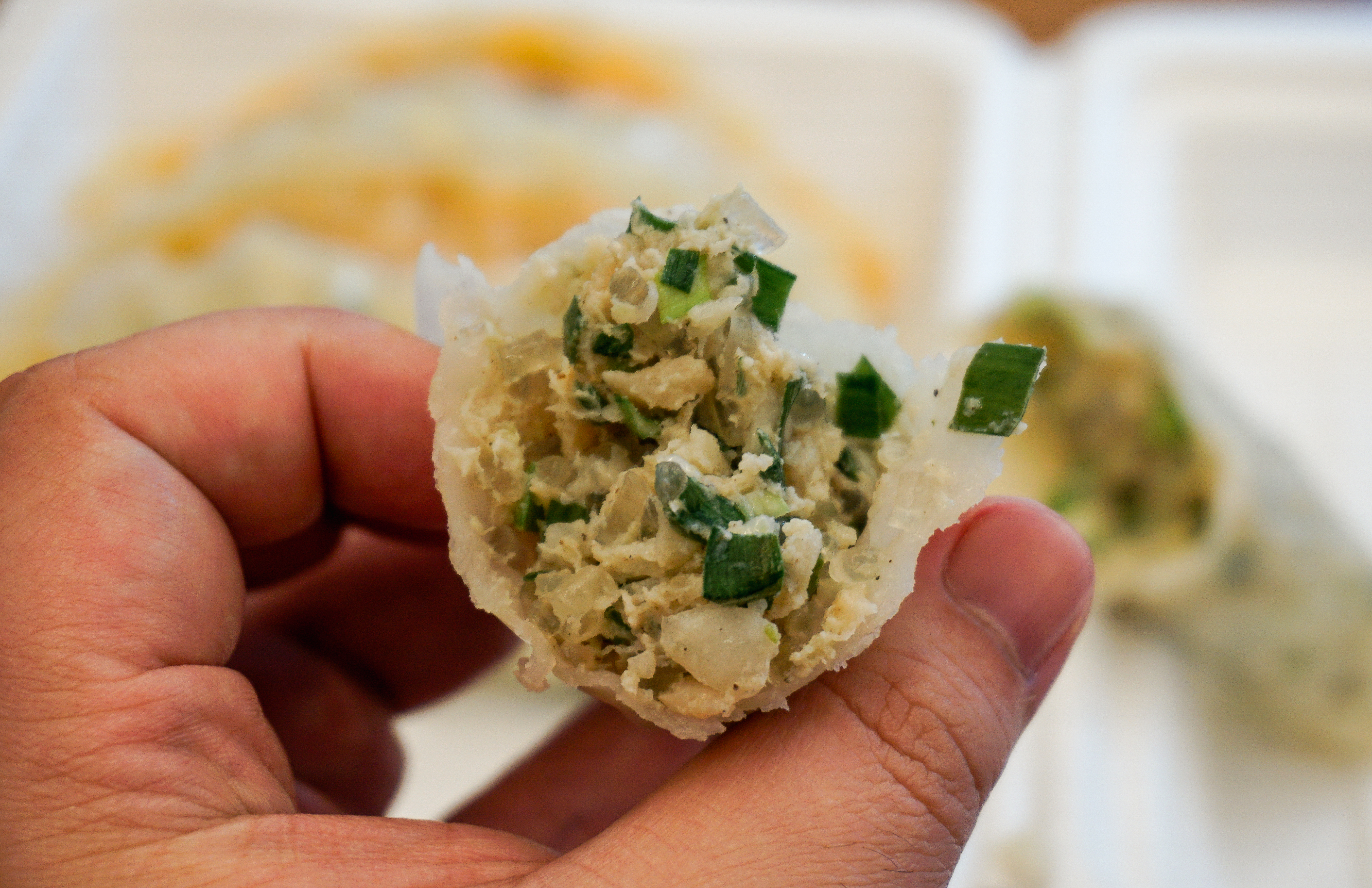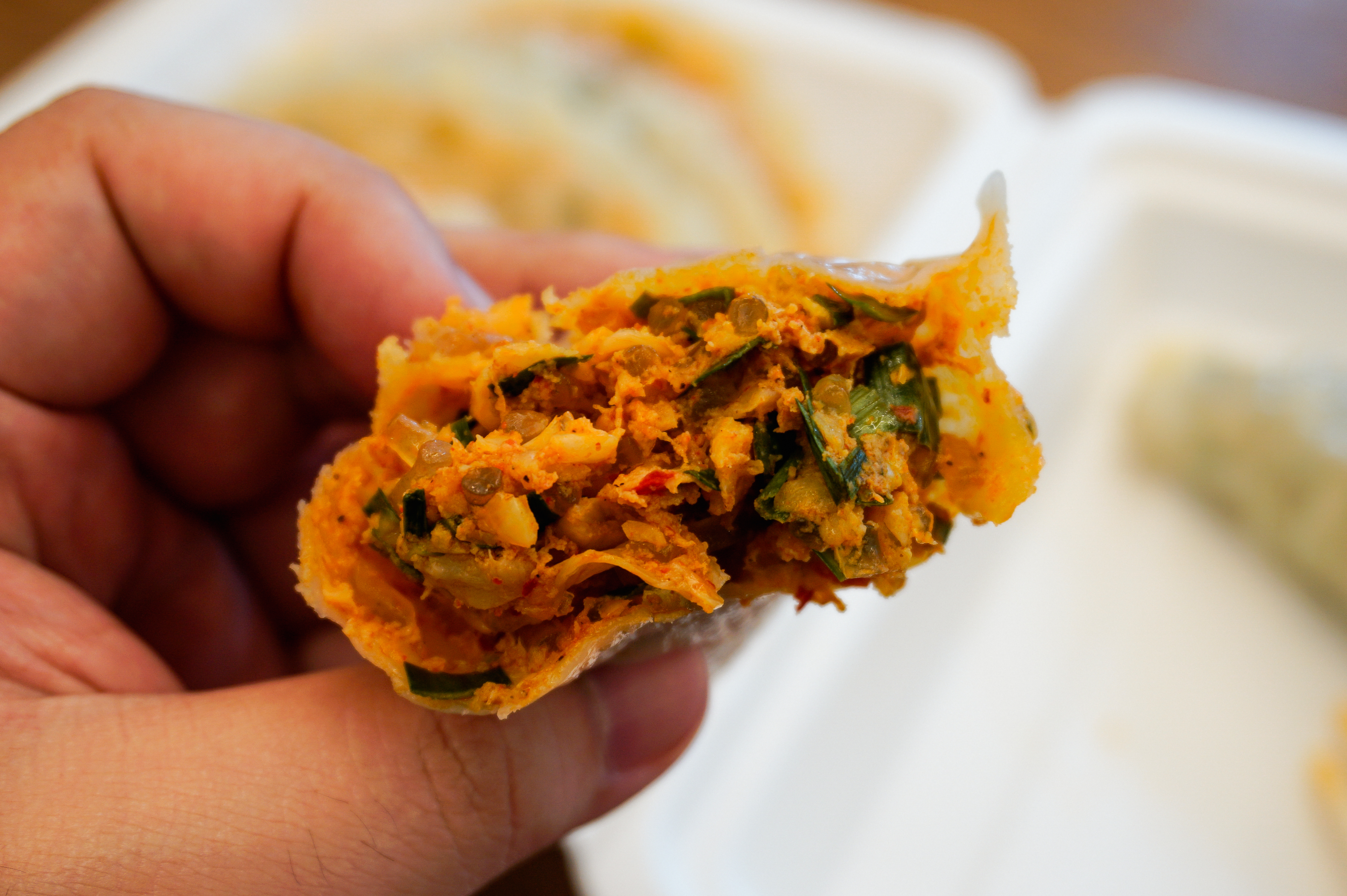 고기만두와 김치만두를 각각 손으로 찢어보았습니다. 만두소는 당면과 채소 고기가 들어가 있었고, 김치만두는 매콤한 양념의 김치가 추가로 들어있었습니다. 보통 만두 먹을 때 마늘(?) 같은 재료들 때문에 먹고 나서 트림(?)을 하면 고약한 냄새가 나는데, 수경왕만두찐빵의 만두는 그런 게 덜 하고 담백한 느낌이었습니다. 저는 좀 더 진한 맛을 좋아하는데, 만두에 육즙도 좀 적은 것 같고 맛이 굉장히 단조롭더라고요.