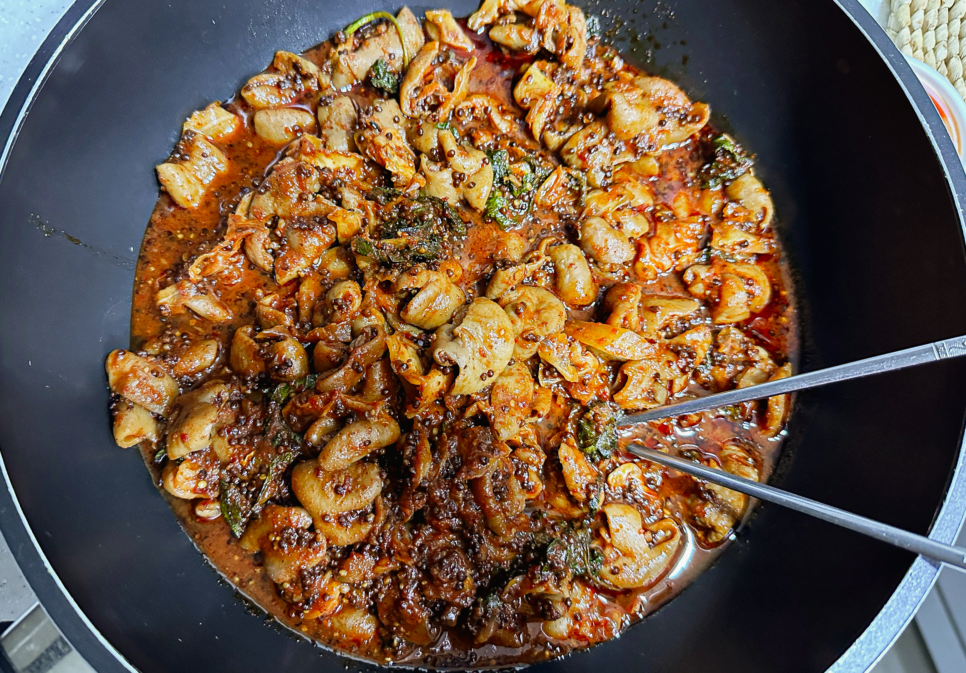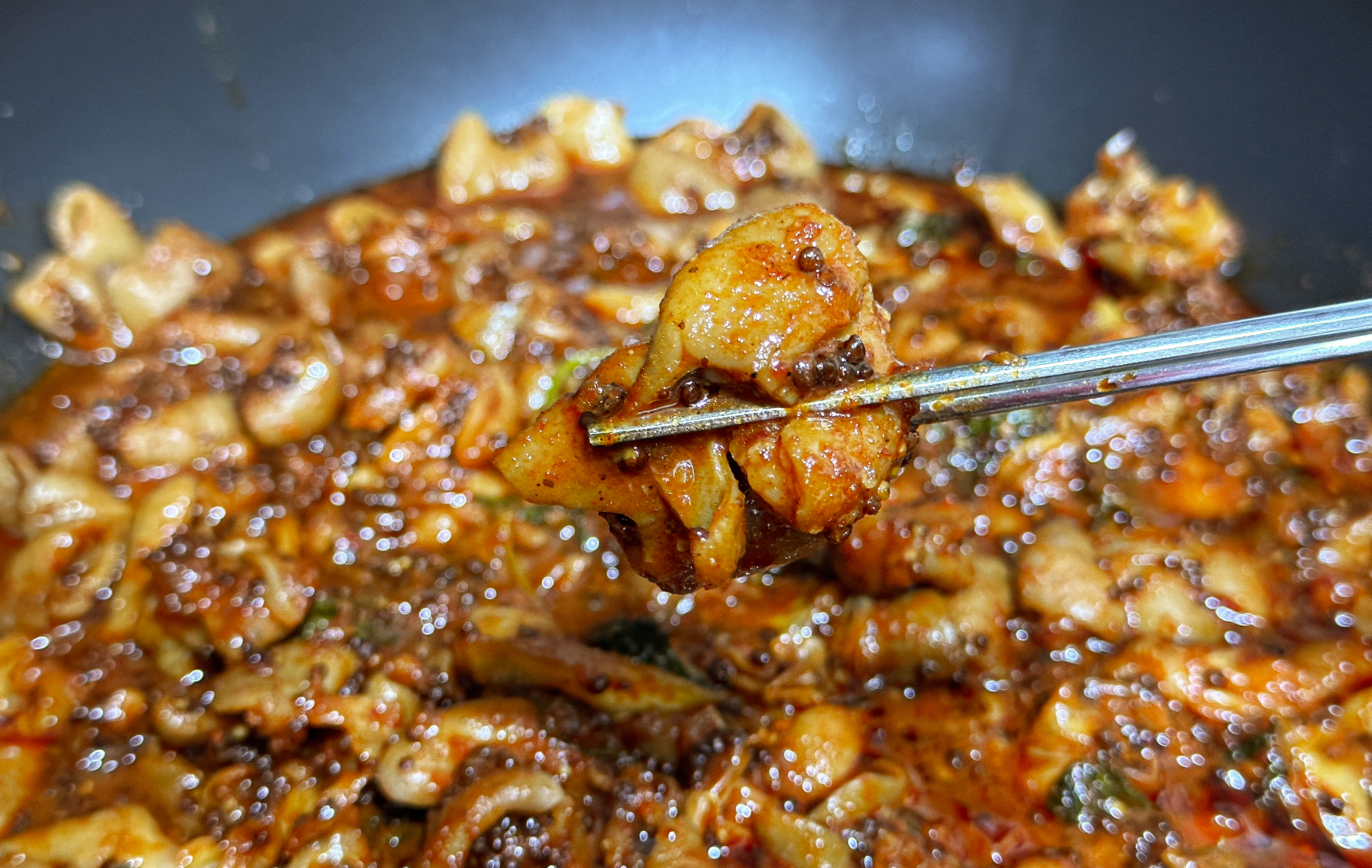 포장해 온 곱창의 모습입니다. 갓 볶아줄 때보다는 아무래도 맛이 덜하겠지만 집에서 편한 차림으로 먹으면 더 좋지요. 푸지미곱창의 양념도 맛있고, 양배추와 깻잎 통들깨가 들어가 식감도 좋고 향도 좋았습니다. 곱창도 큼직해서 씹는 맛이 좋았고, 무엇보다도 양이 푸짐해서 여럿이서 먹기에 좋았습니다. 따로 가져온 당면은 집에서 웍에다 볶아서 먹으면 되었습니다.