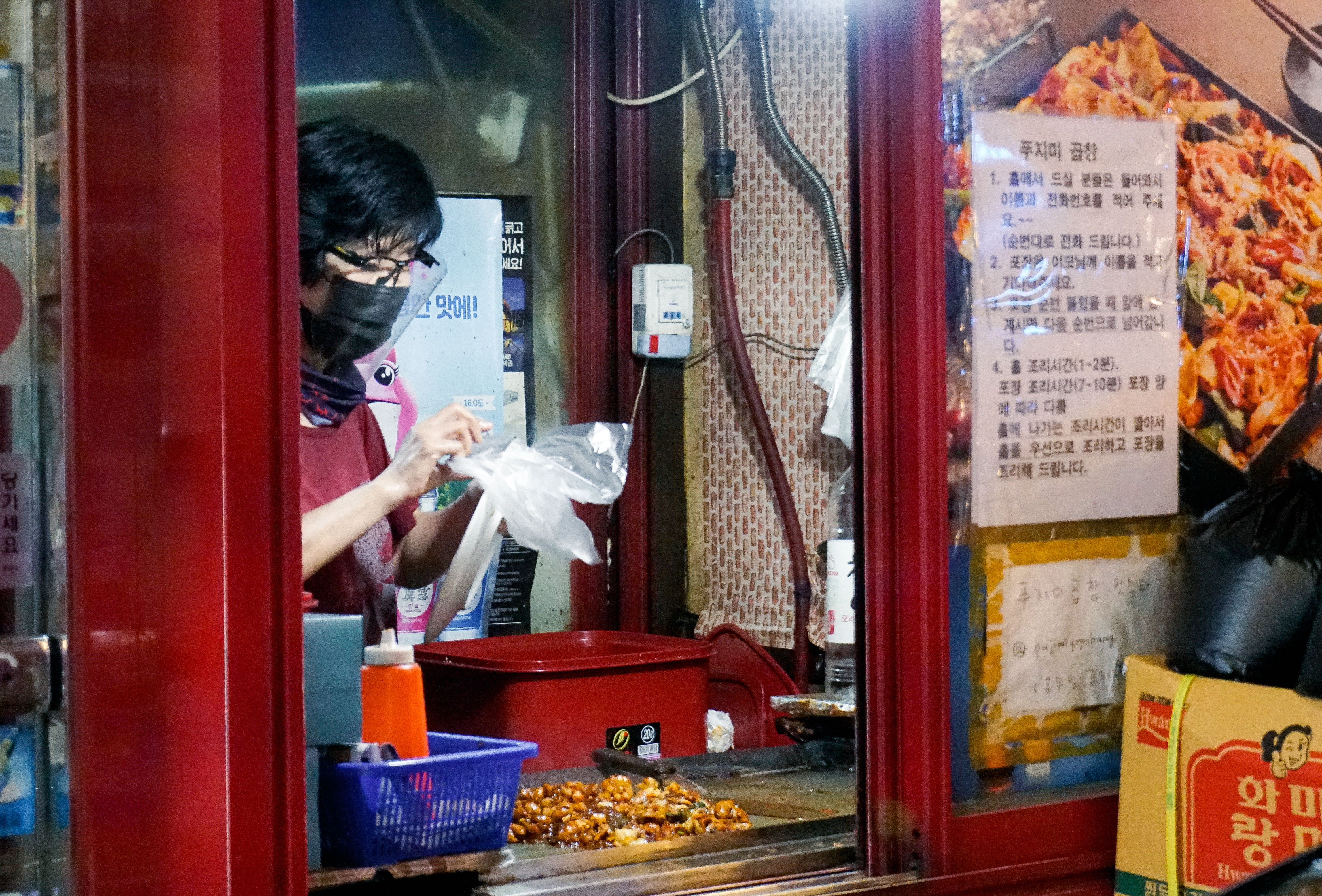 포장주문을 하면 직접 손님이 보는 자리에서 곱창을 볶아주십니다. 기본적으로 곱창도 많이 주시는데, 채소랑 들어가면 양이 더 늘어나서 여럿이서 먹어도 배불리 먹을 수 있더라고요. 당면 좋아하시는 분이라면 넓으면서 쫄깃한 식감의 당면이 들어있으니 더 만족하실 수 있고요.
