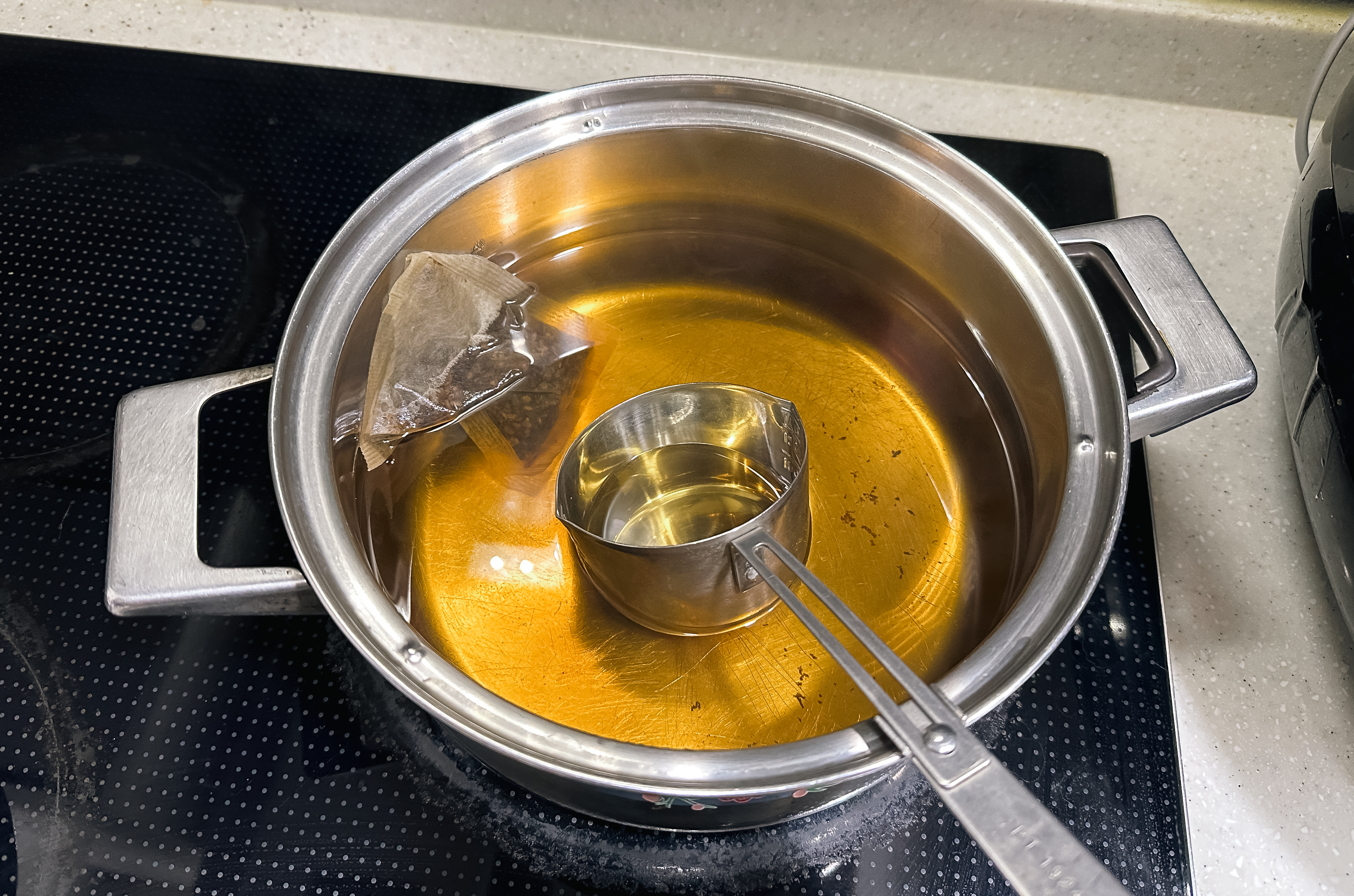 냄비에 보리차를 끓일 물 2L를 넣어준 다음 물을 끓여주고, 보리차를 10분간 우려내주었습니다. 끓여낸 보리차를 담을 주걱이 안 보여서 계량스푼으로 대신 보리차를 병에 옮겨 담았습니다. 예상했던 것보다 진하게 우러나진 않았는데, 병에 담아두니 흐뭇해지더라고요. 참고로 보리차는 시원하게 마셔야 제맛이죠.