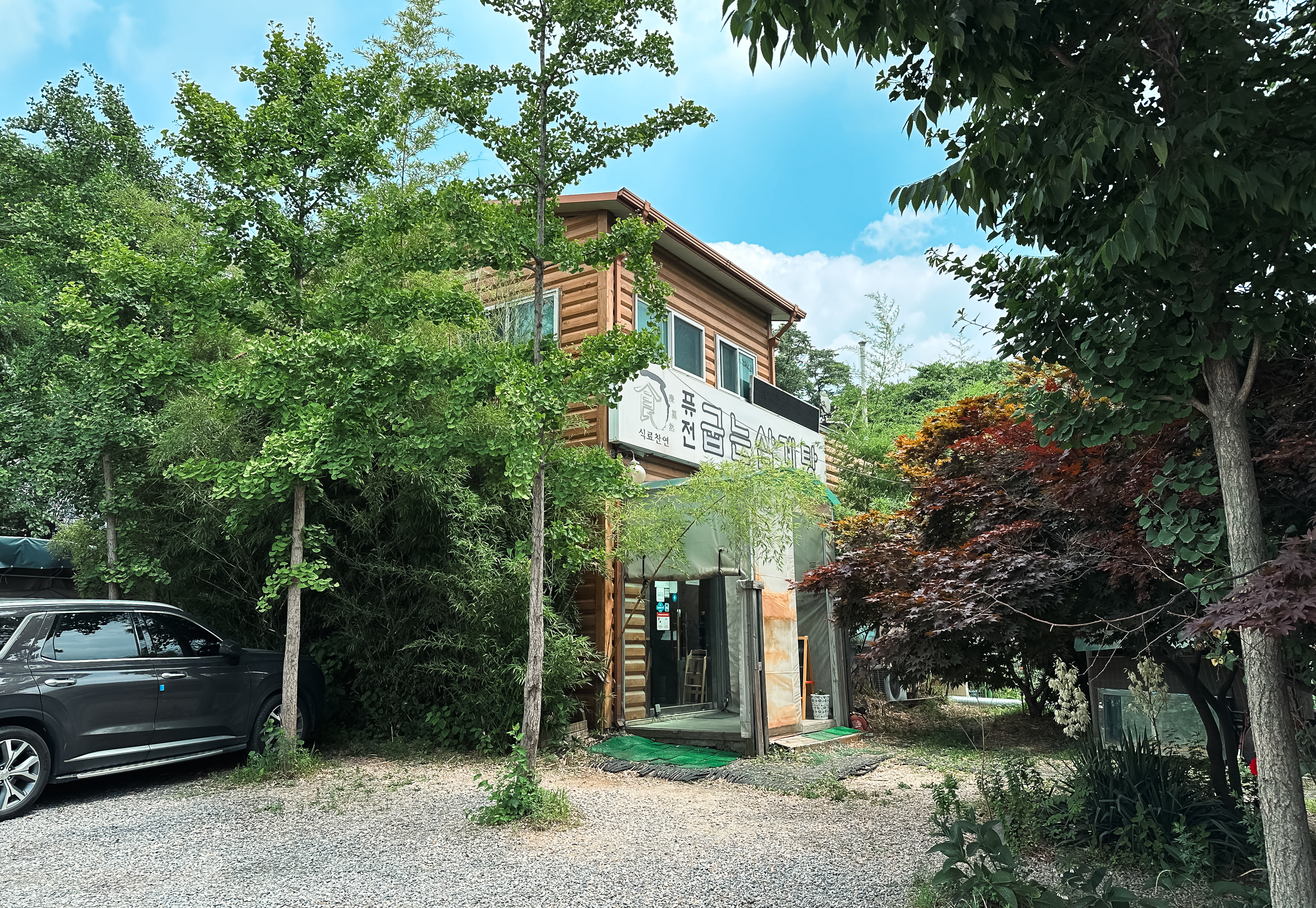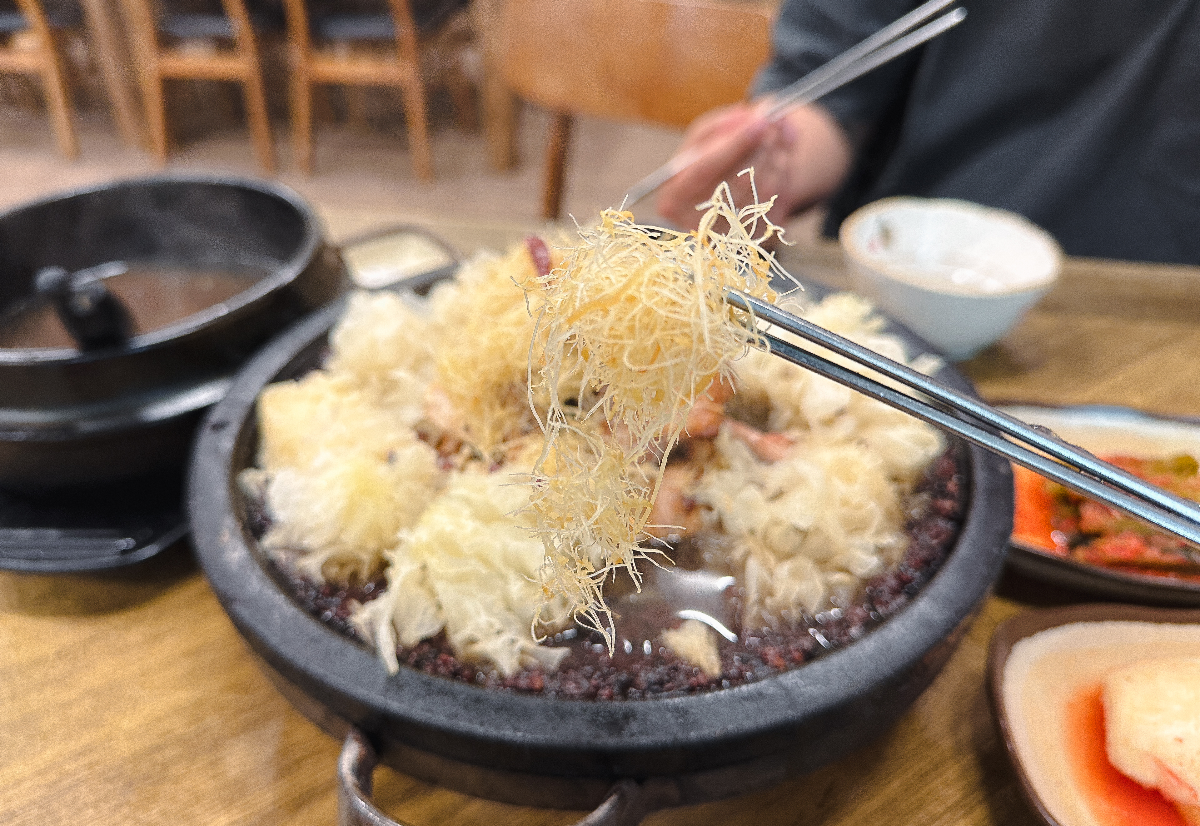 독특한 게 삼계탕의 닭은 숯불구이 바비큐(?) 향이 났는데, 후에 사장님께 물어보니 사장님이 이전에 "숯불구이 바베큐 치킨집을 운영하셨었다" 라고 하시며, 숯불구이 닭과 함께 퓨전으로 만드셨다고 하시더라고요. 돌판 위에 국물은 흑미 그리고 산삼배양근이 들어가 구수하면서도 맛있었고, 은이버섯은 부드러우면서도 쫄깃한 식감이 좋았습니다.