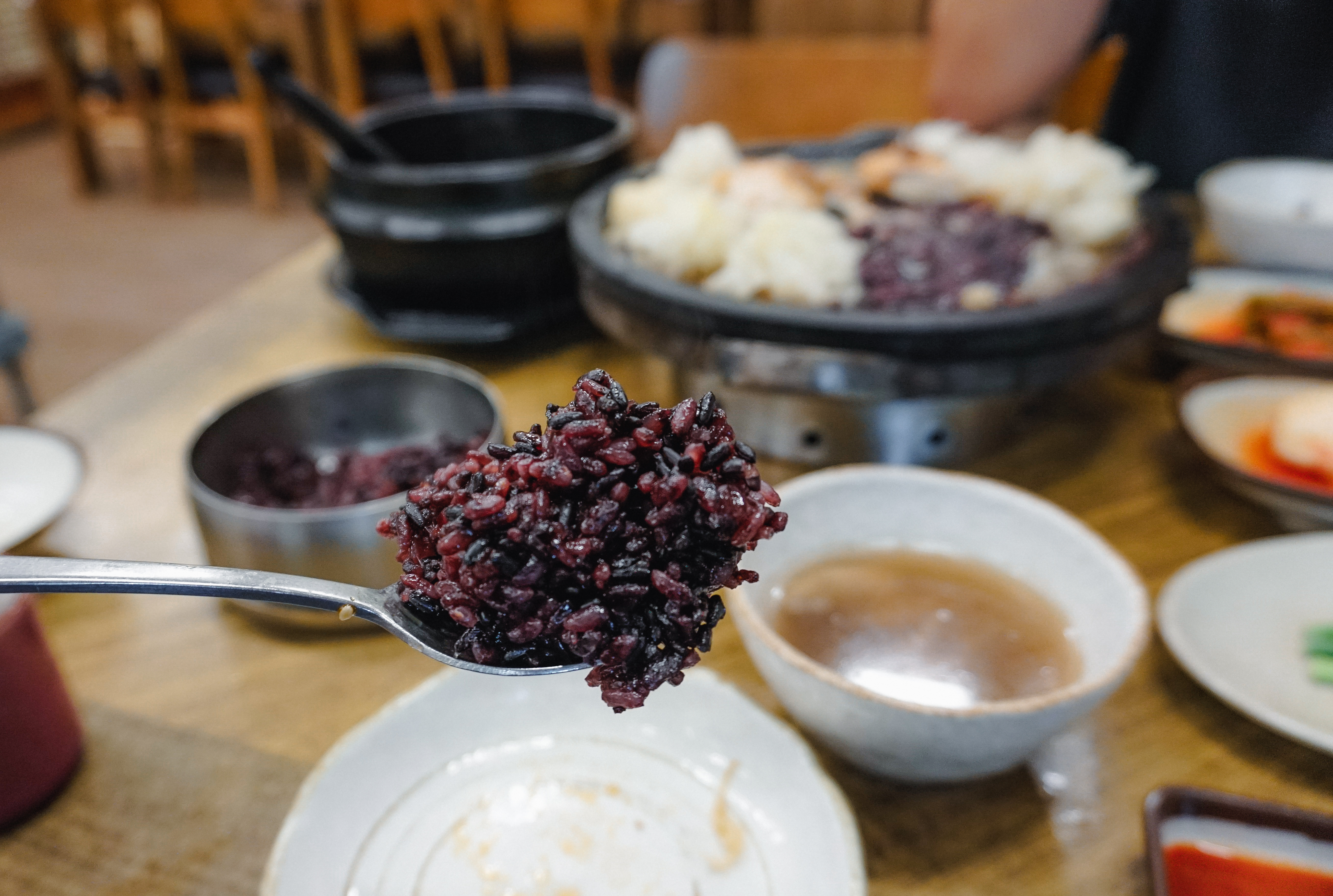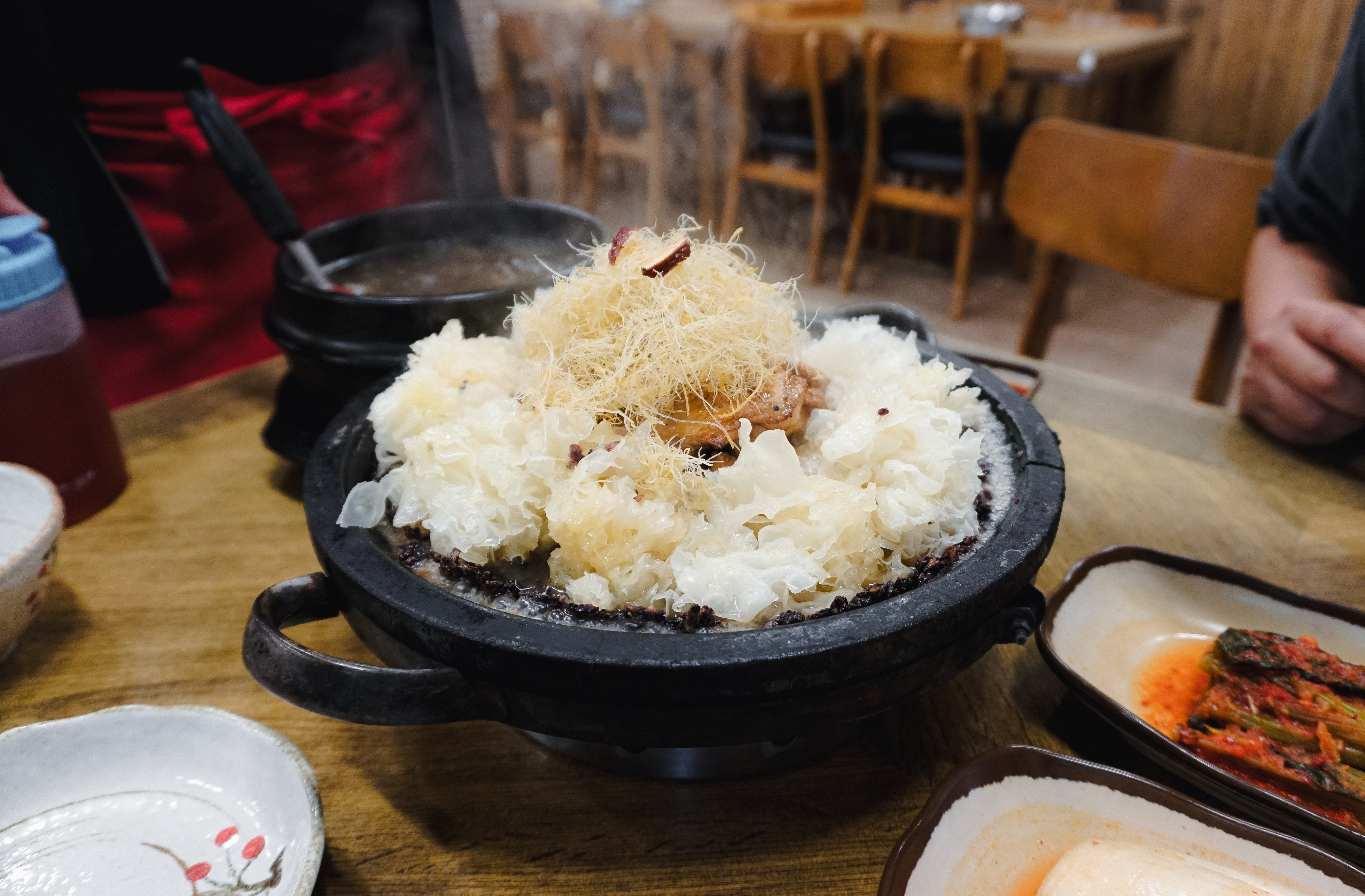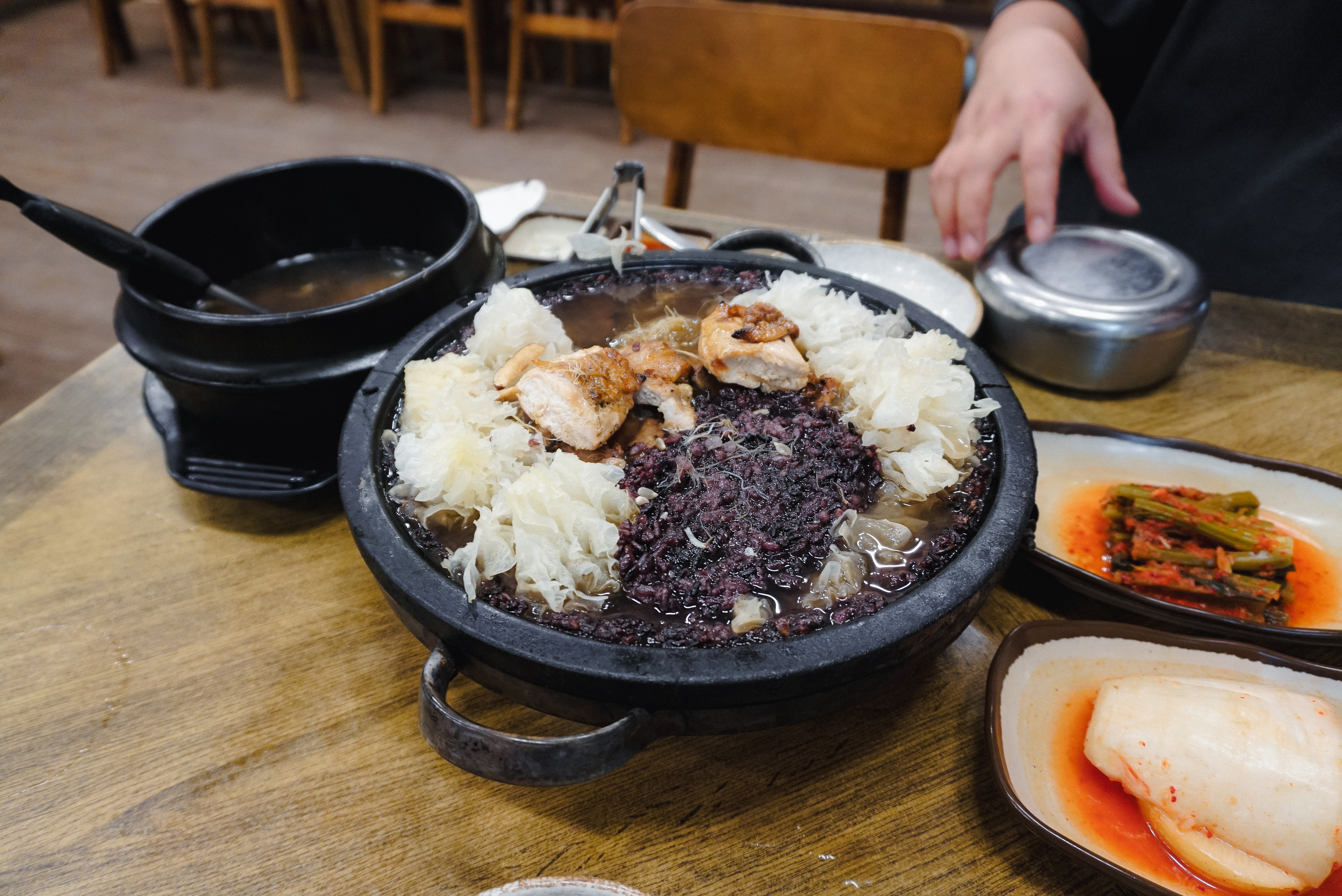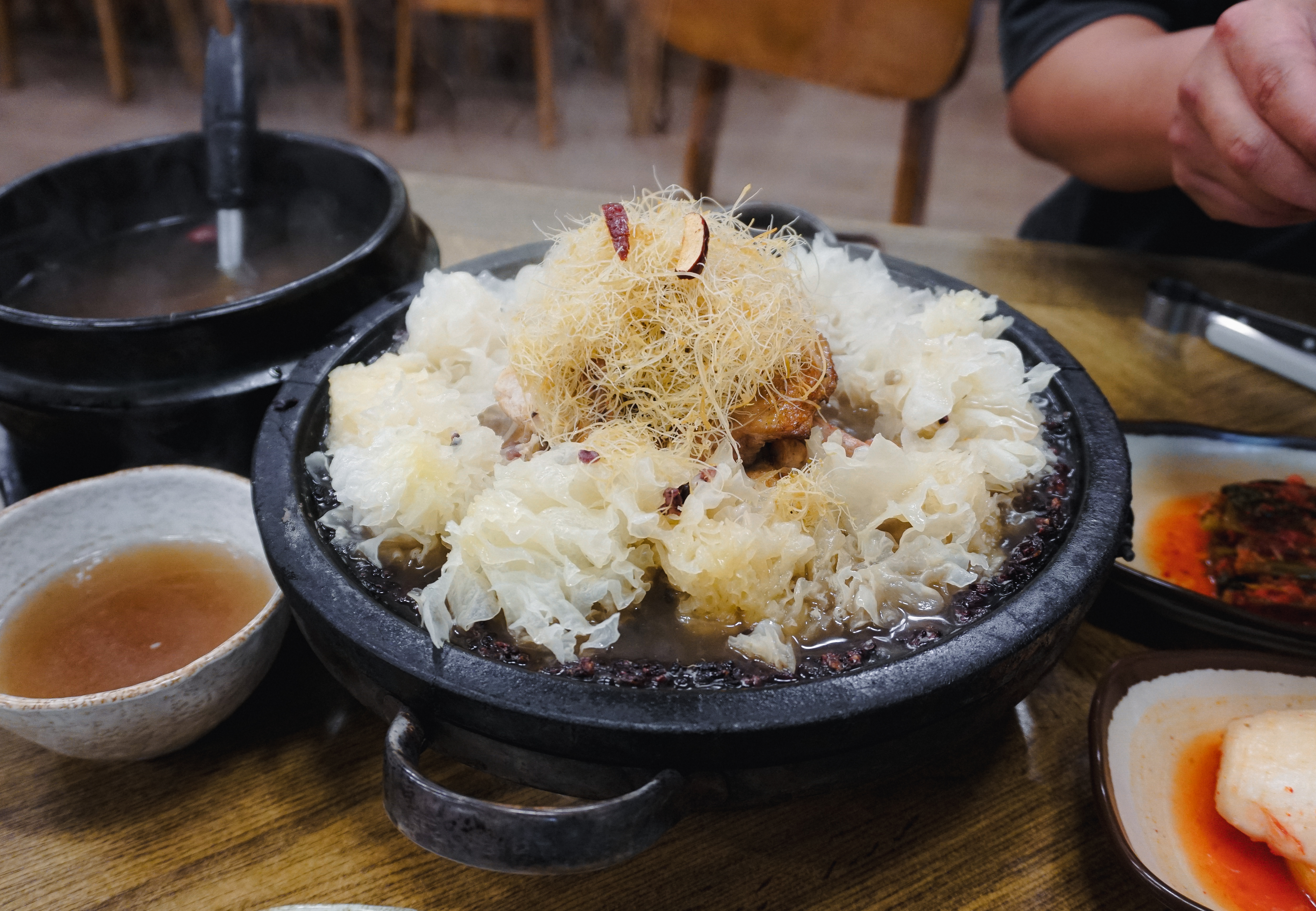 독특한 게 삼계탕의 닭은 숯불구이 바비큐(?) 향이 났는데, 후에 사장님께 물어보니 사장님이 이전에 "숯불구이 바베큐 치킨집을 운영하셨었다" 라고 하시며, 숯불구이 닭과 함께 퓨전으로 만드셨다고 하시더라고요. 돌판 위에 국물은 흑미 그리고 산삼배양근이 들어가 구수하면서도 맛있었고, 은이버섯은 부드러우면서도 쫄깃한 식감이 좋았습니다.