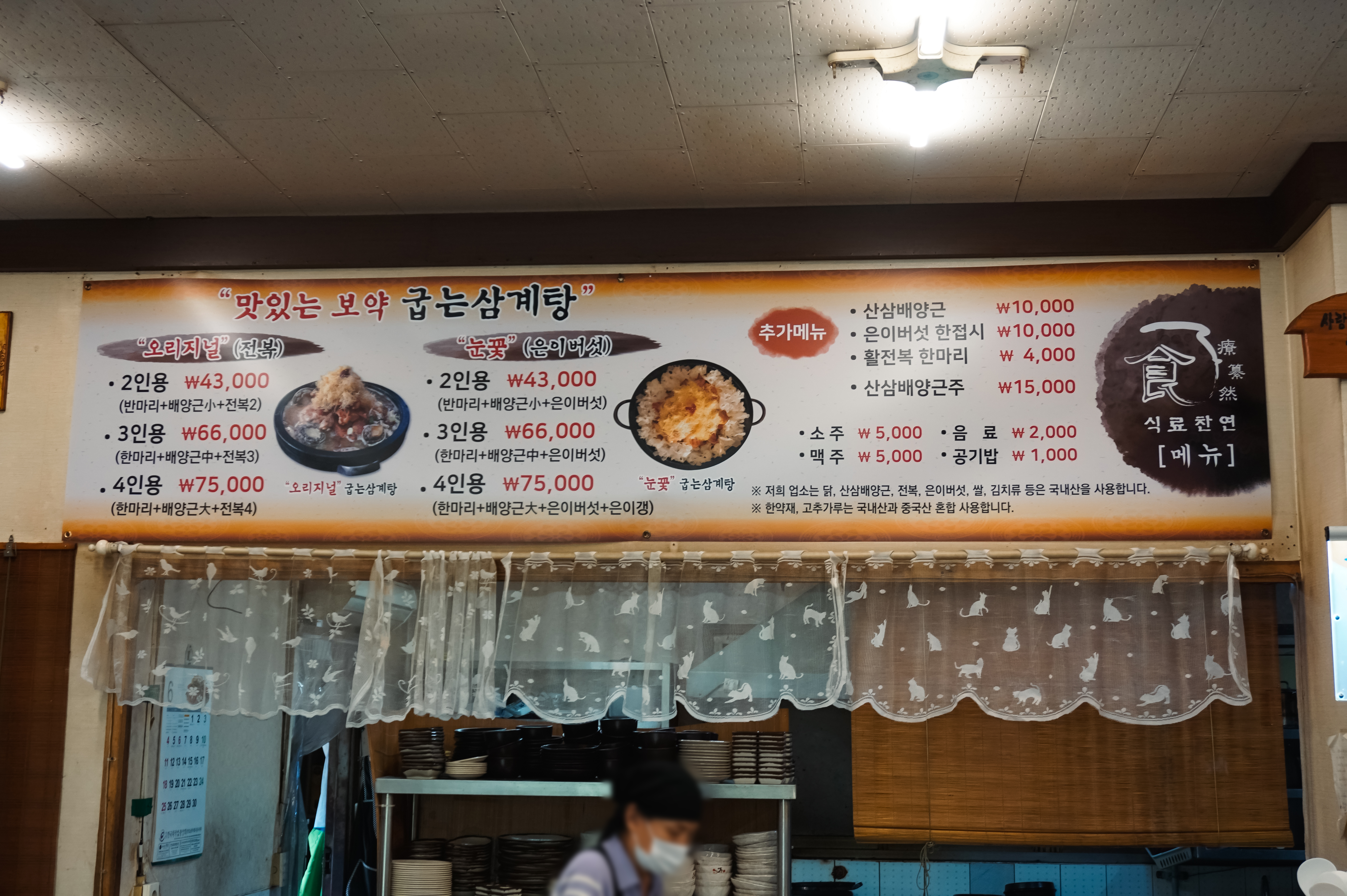 퓨전굽는삼계탕의 메뉴는 오리지널 '전복삼계탕'과 은이버섯이 들어간 '눈꽃삼계탕'이 있었습니다. 모든 삼계탕에는 산삼배양근, 은이버섯, 활전복 등을 추가할 수 있었습니다. 저희는 눈꽃삼계탕 2인분을 주문했습니다.