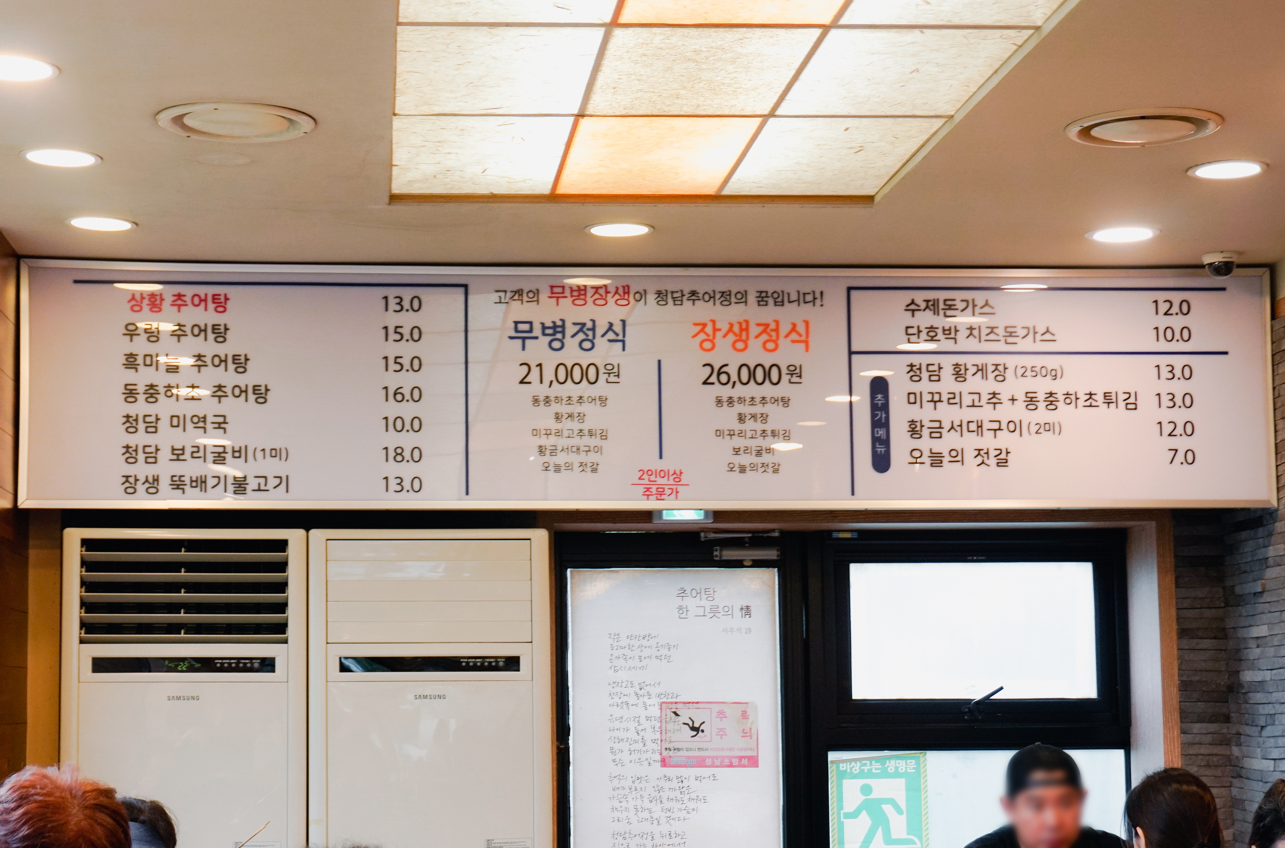 저희는 가게 직원의 안내를 받아 2층으로 올라갔고, 메뉴는 다음과 같았습니다. 상황추어탕, 우렁추어탕, 흑마늘추어탕, 동충하초추어탕, 청담미역국, 청담보리굴비, 장생뚝배기불고기, 수제돈까스, 단호박치즈돈까스, 청담황게장, 미꾸리고추+동충하초튀김, 황금서대구이, 오늘의젓갈 그리고 무병정식, 장생정식이 있었습니다.