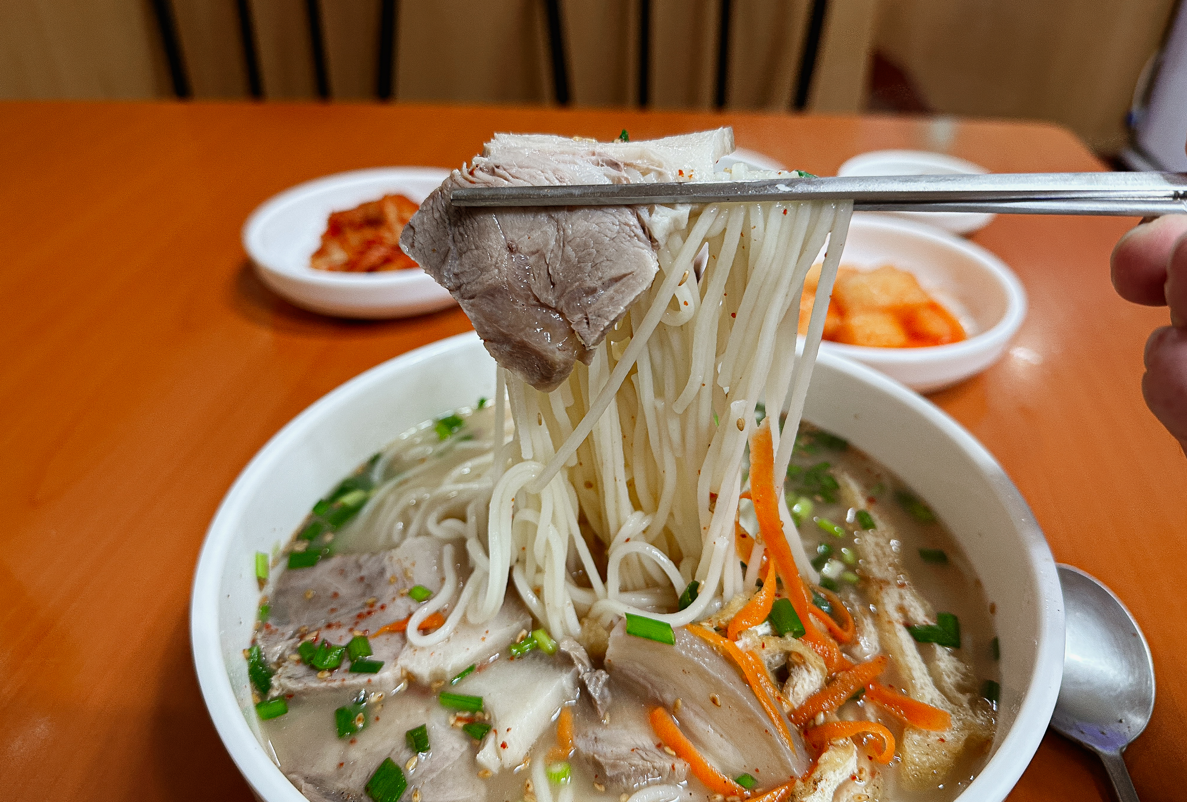 곧이어 주문한 고기국수가 나왔습니다. 고기국수는 국물이 일단 진해서 좋았고, 그 안에 들어가는 수육은 부드럽고 쫄깃한 것이 맛있더라고요. 제주도 고기국수는 특히 굵은 국수의 면이 식감도 괜찮고 면에 간간하게 간이 배어있어 맛있었습니다.