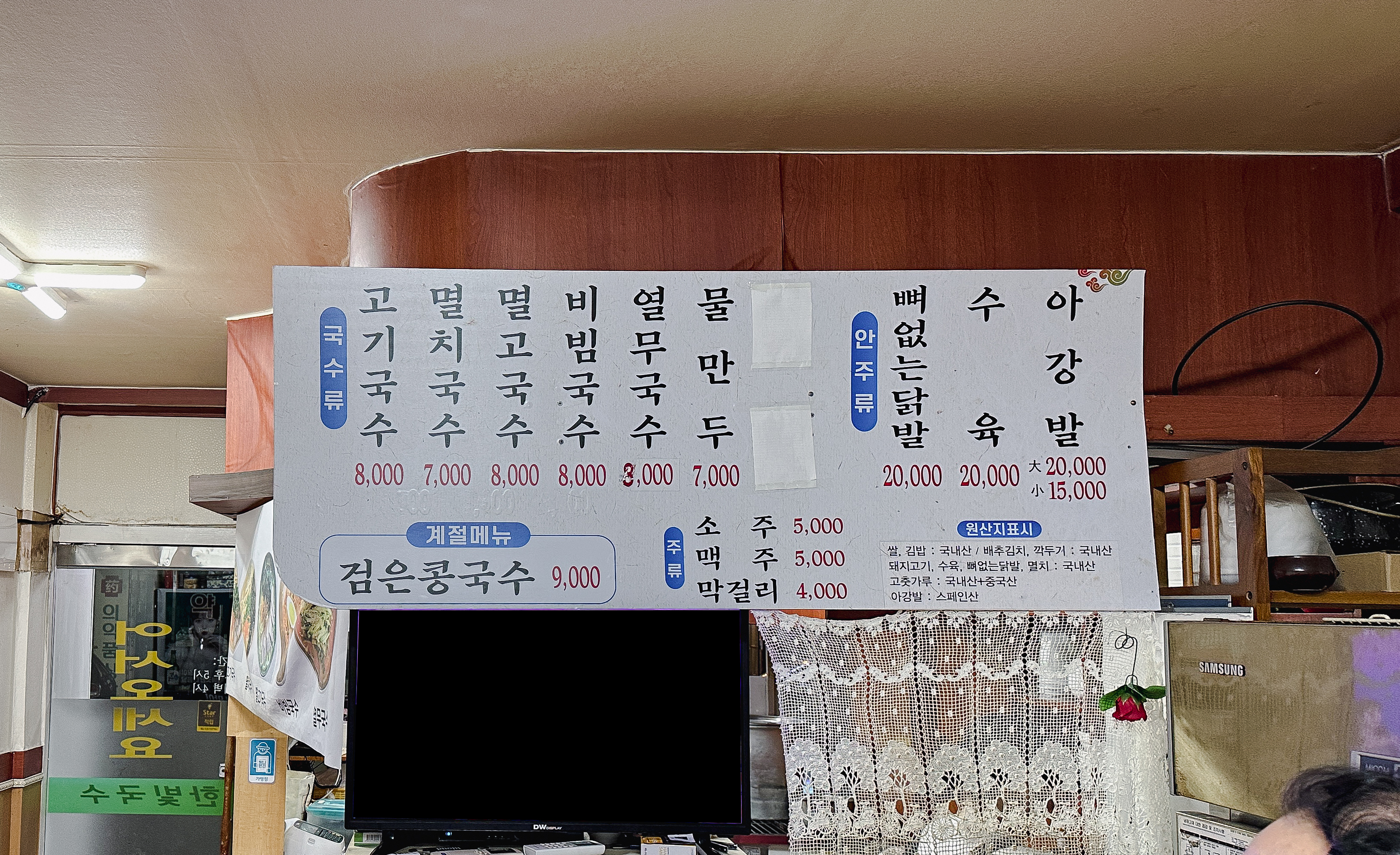 제주 연동 맛집 한빛국수의 메뉴는 고기국수, 멸치국수, 멸고국수, 비빔국수, 열무국수, 물만두, 검은콩국수, 뼈없는닭발, 수육, 아강발 등이 있었습니다. 가게가 오래된 노포인 만큼 요즘 식당들처럼 깔끔한 느낌은 없었는데, 간혹 이런 곳에서 숨은 맛집을 발견하게 되는 것 같습니다.
