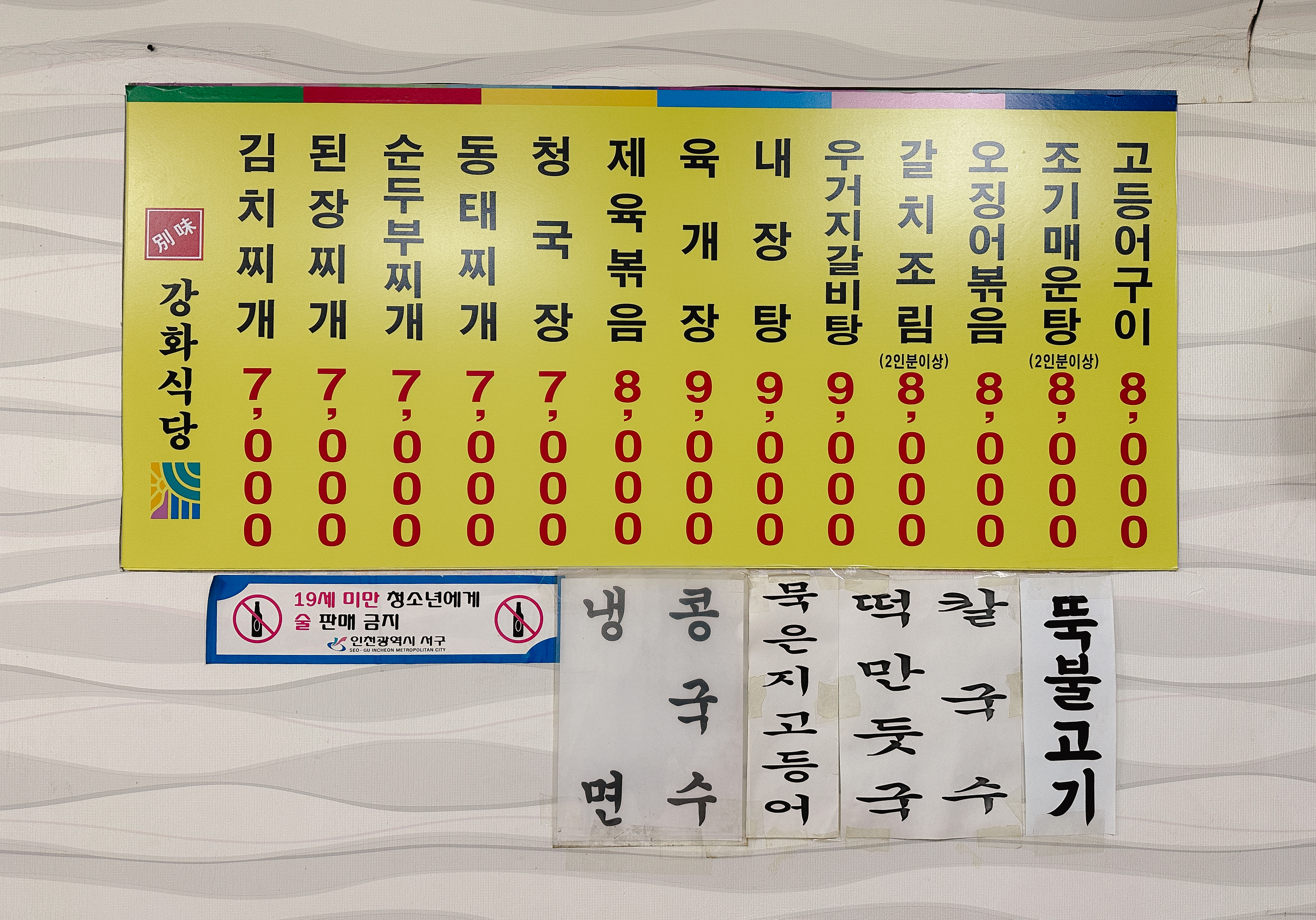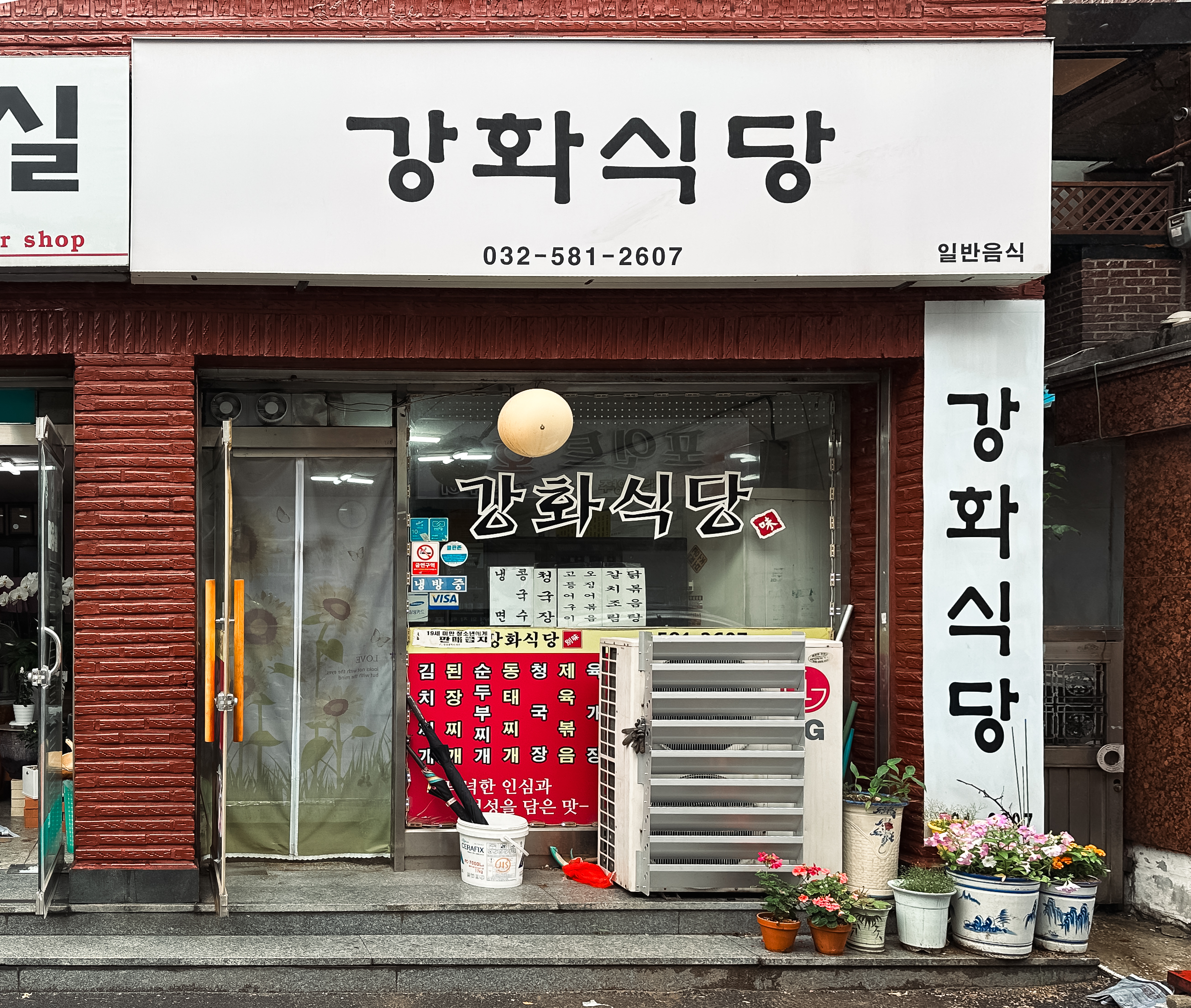 제가 소개할 강화식당은 인천 서구 신현동 173-61, 1층 에 위치해 있었습니다. 가게는 작고 아담한 크기였고, 노부부 두 분이서 운영하시는 듯했습니다. 가게에는 "넉넉한 인심과 정성을 담은 맛"이라는 문구가 적혀있는데, 과연 넉넉한 인심과 정성을 보여주실지 함께 들어가 보시죠.