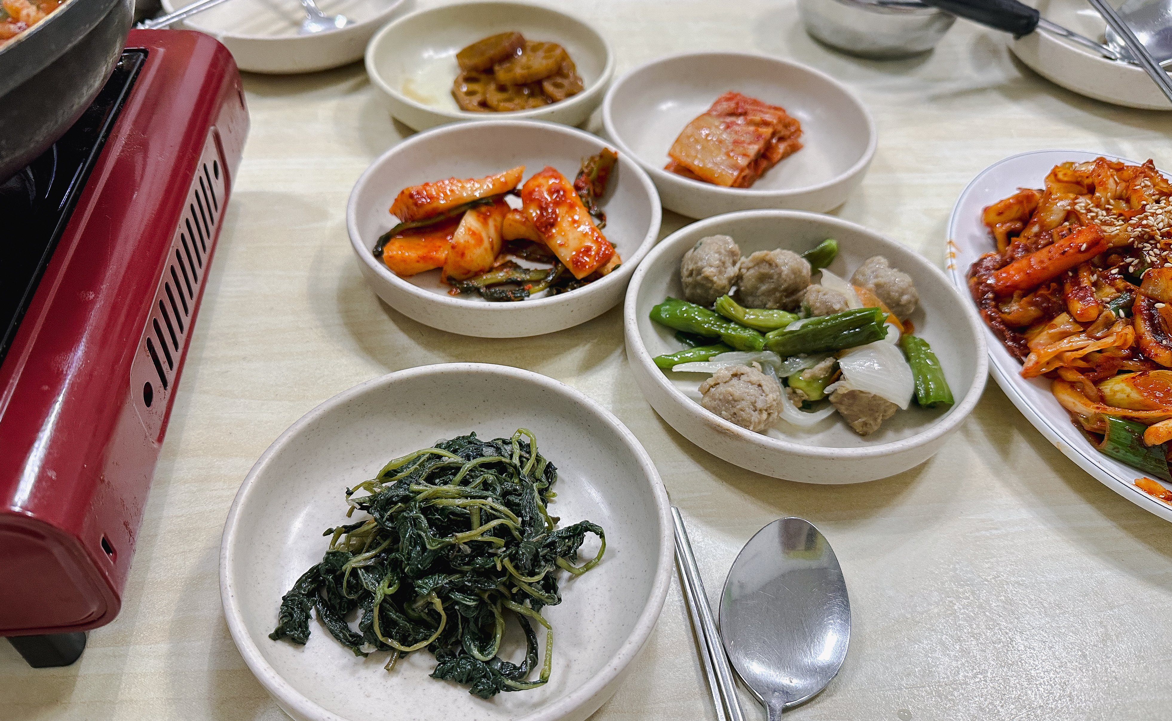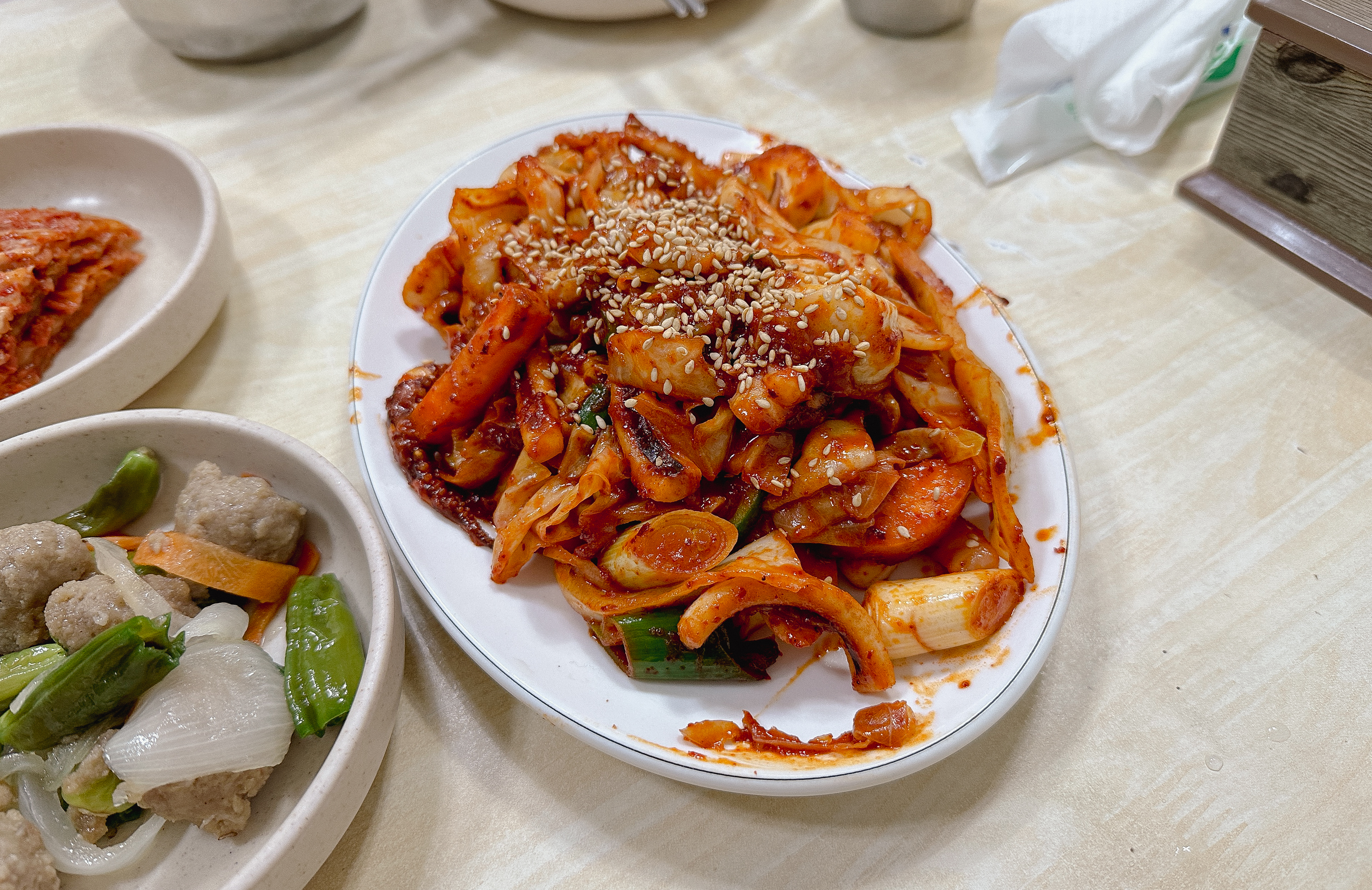 강화식당의 오징어볶음과 김치찌개가 나왔습니다. 반찬은 나물무침과 연근조림, 김치 등이 나왔습니다. 오징어볶음은 사실 크게 기대하지 않았던 메뉴인데, 요즘 오징어 가격이 많이 올라서 양이 적을 줄 알았는데, 생각보다 1인분의 양인데도 넉넉하게 나왔고, 김치찌개는 3명이서 나눠 먹기에 부족하지 않았습니다.