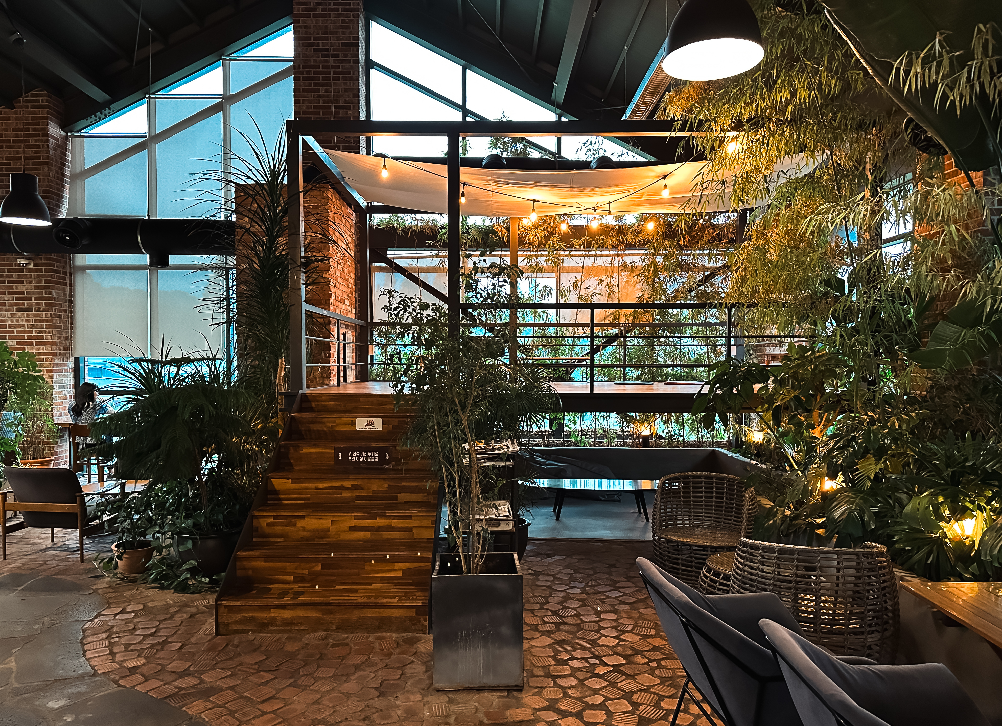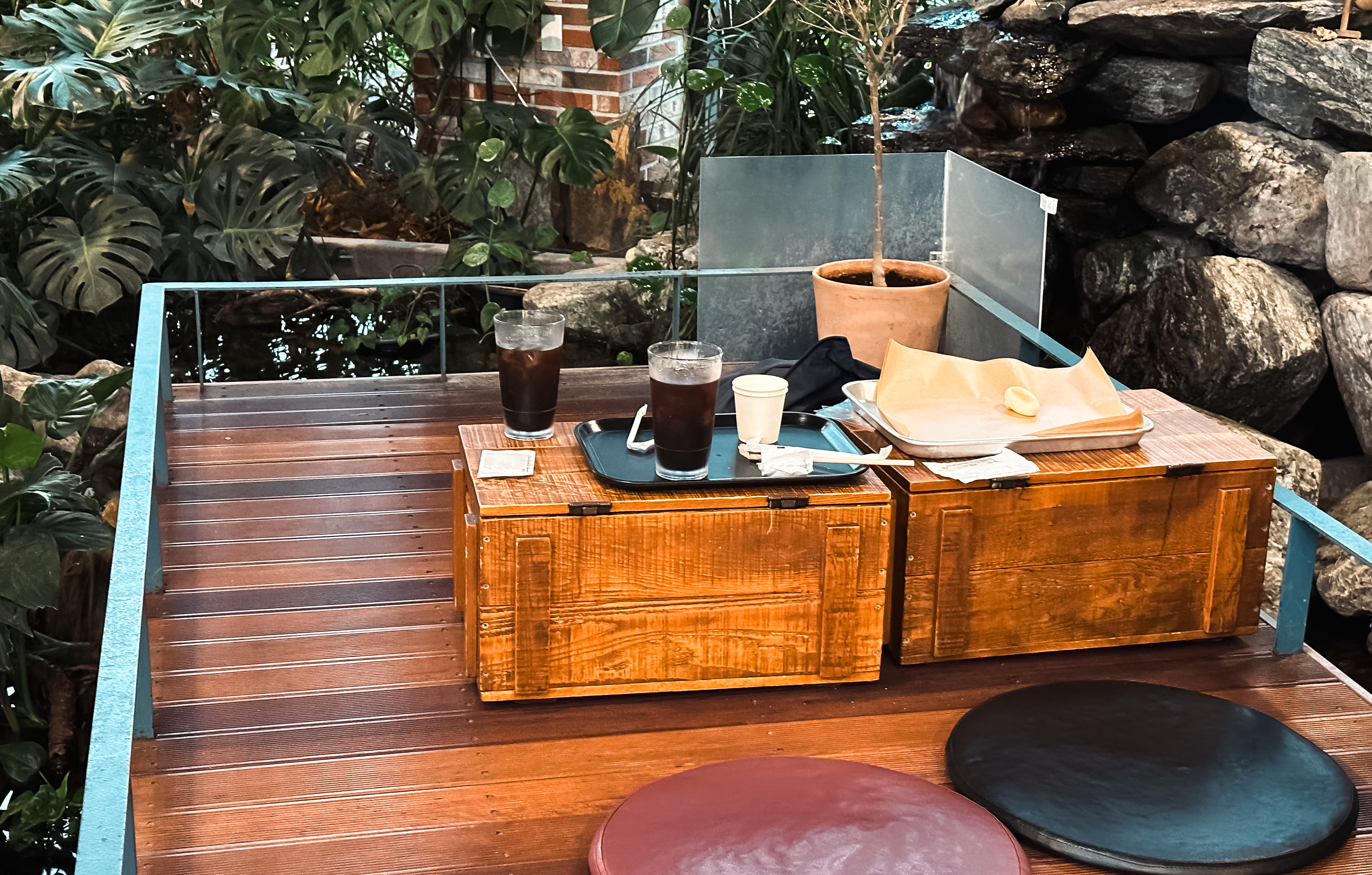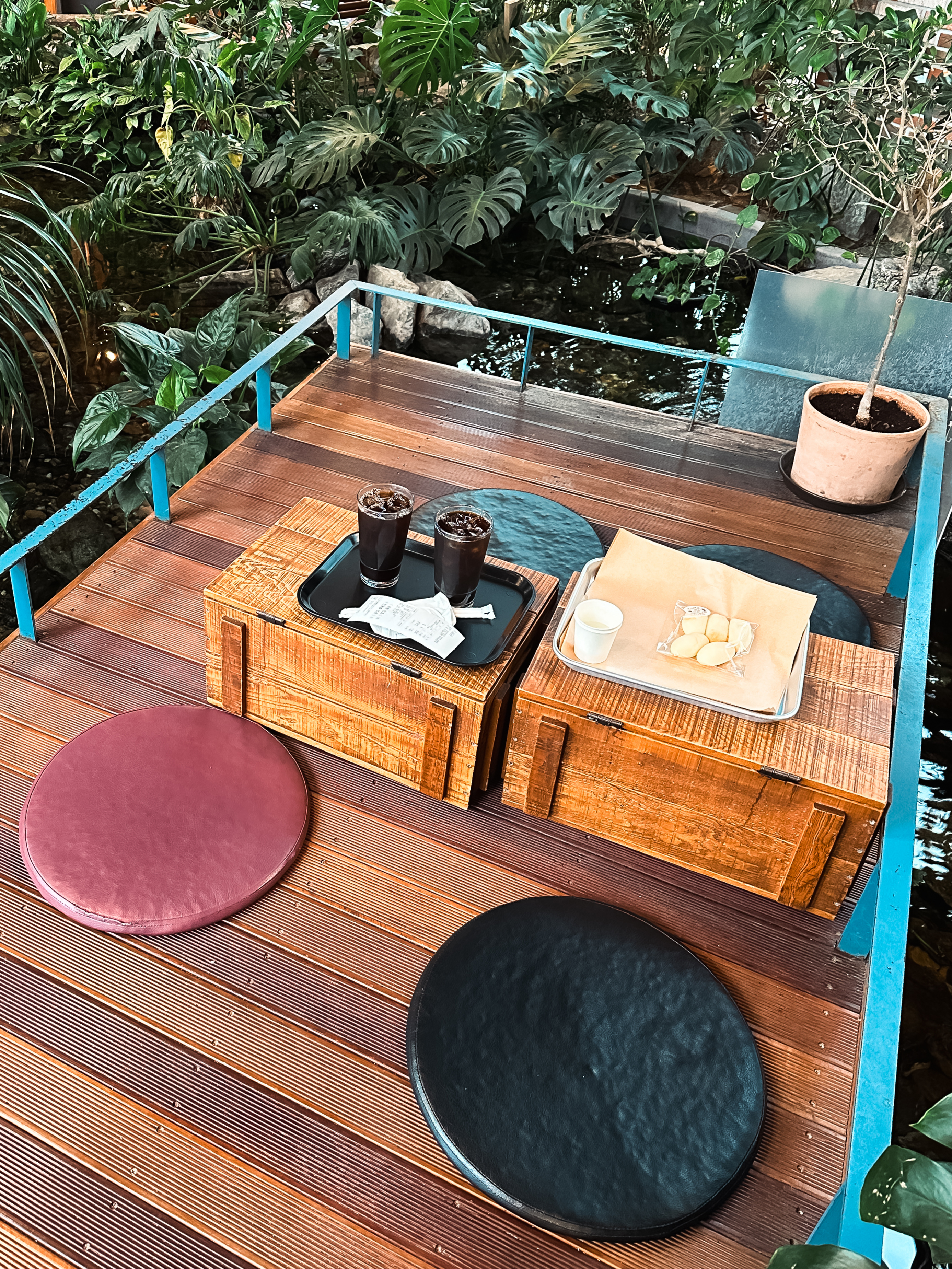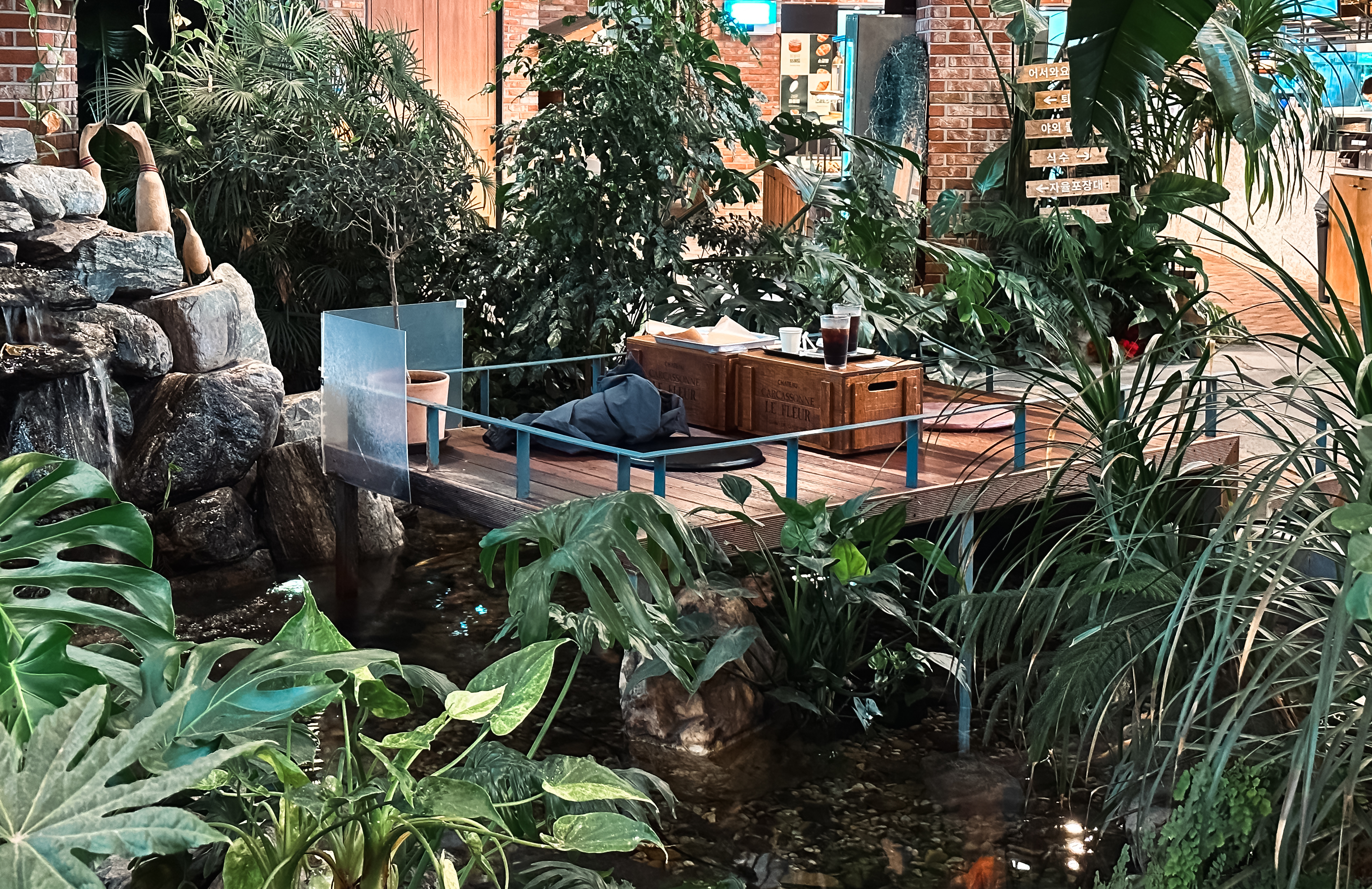 카페의 분위기는 마치 실내 공간에 자연을 옮겨놓은 듯한 느낌이었고, 실내에 물을 따라 물고기가 헤엄쳐 다니는 모습을 보니 마음이 정화(?)되는 느낌이 들었습니다. 곳곳에 평상이나 캠핑용품을 두어 공간별로 다른 분위기에서 커피를 즐길 수 있다는 것도 이 가게의 매력인 것 같았습니다.