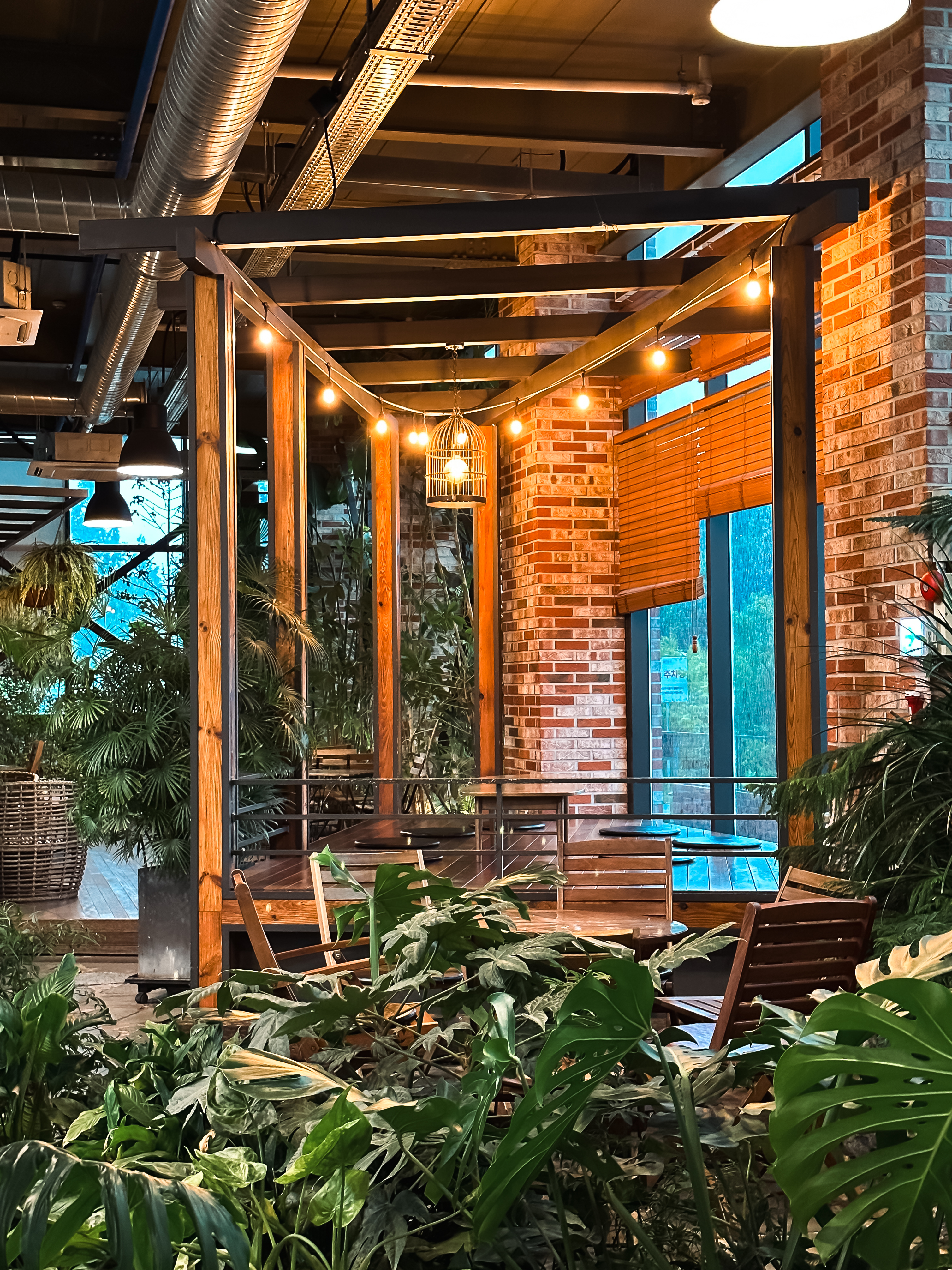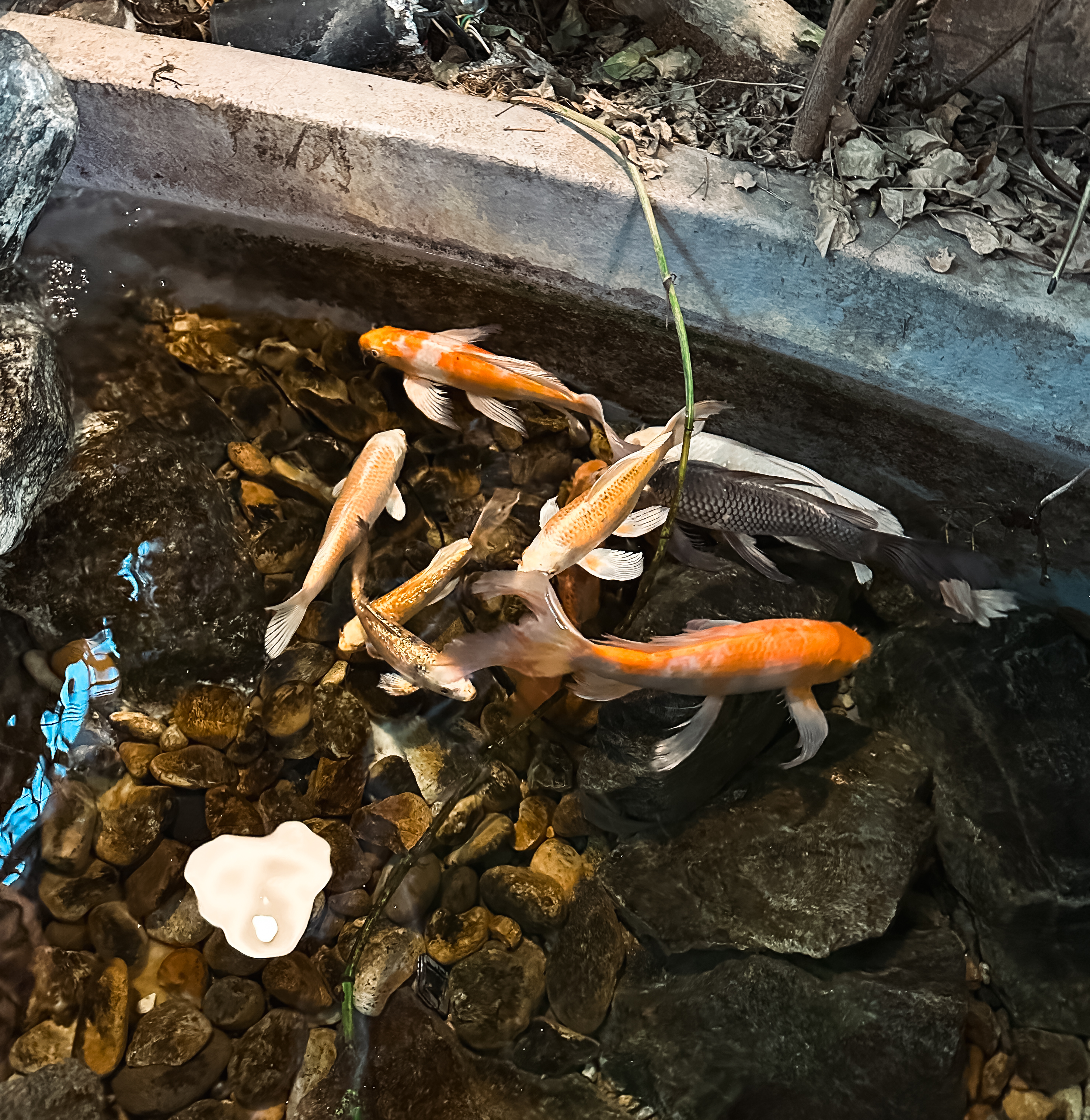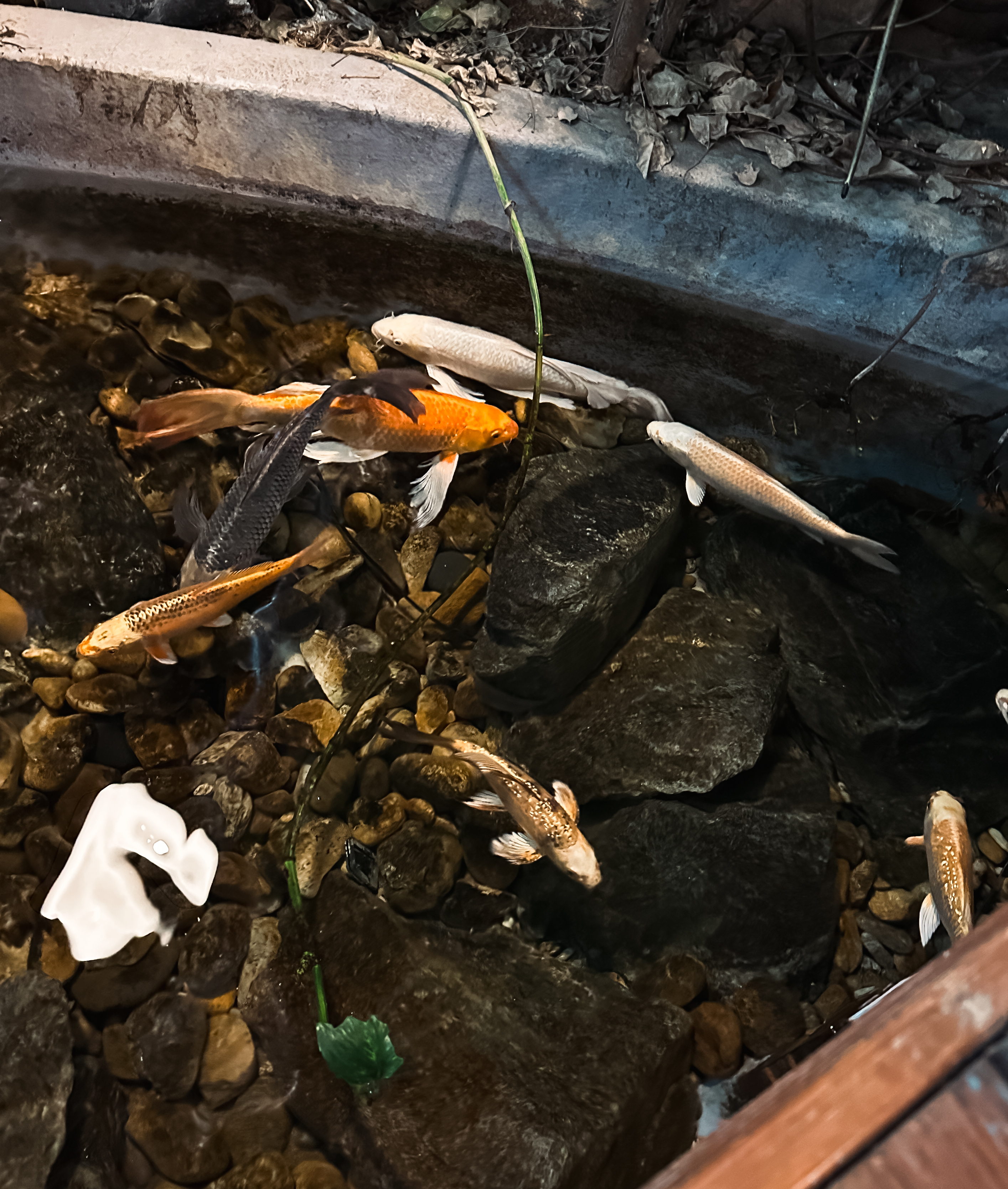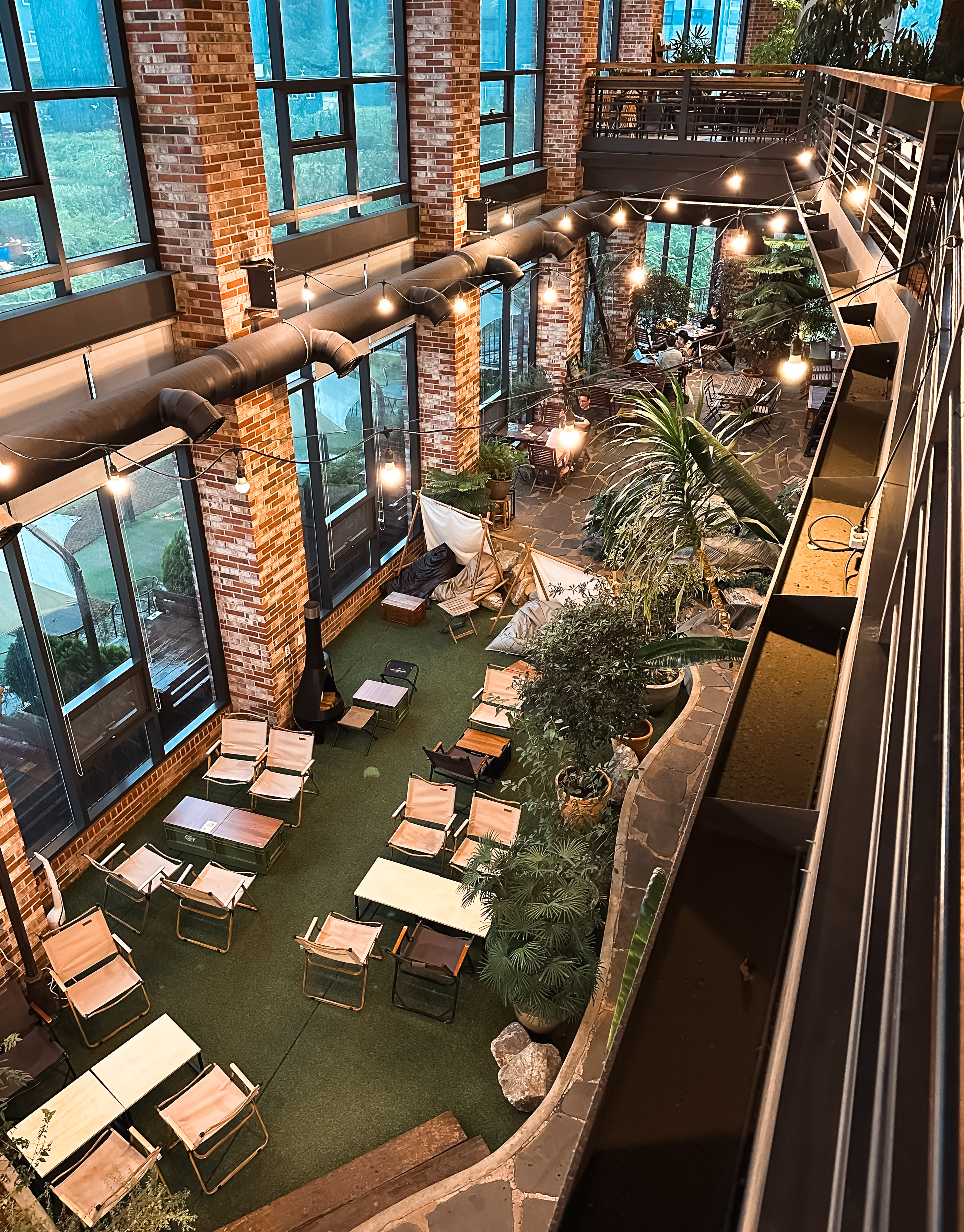 카페의 분위기는 마치 실내 공간에 자연을 옮겨놓은 듯한 느낌이었고, 실내에 물을 따라 물고기가 헤엄쳐 다니는 모습을 보니 마음이 정화(?)되는 느낌이 들었습니다. 곳곳에 평상이나 캠핑용품을 두어 공간별로 다른 분위기에서 커피를 즐길 수 있다는 것도 이 가게의 매력인 것 같았습니다.