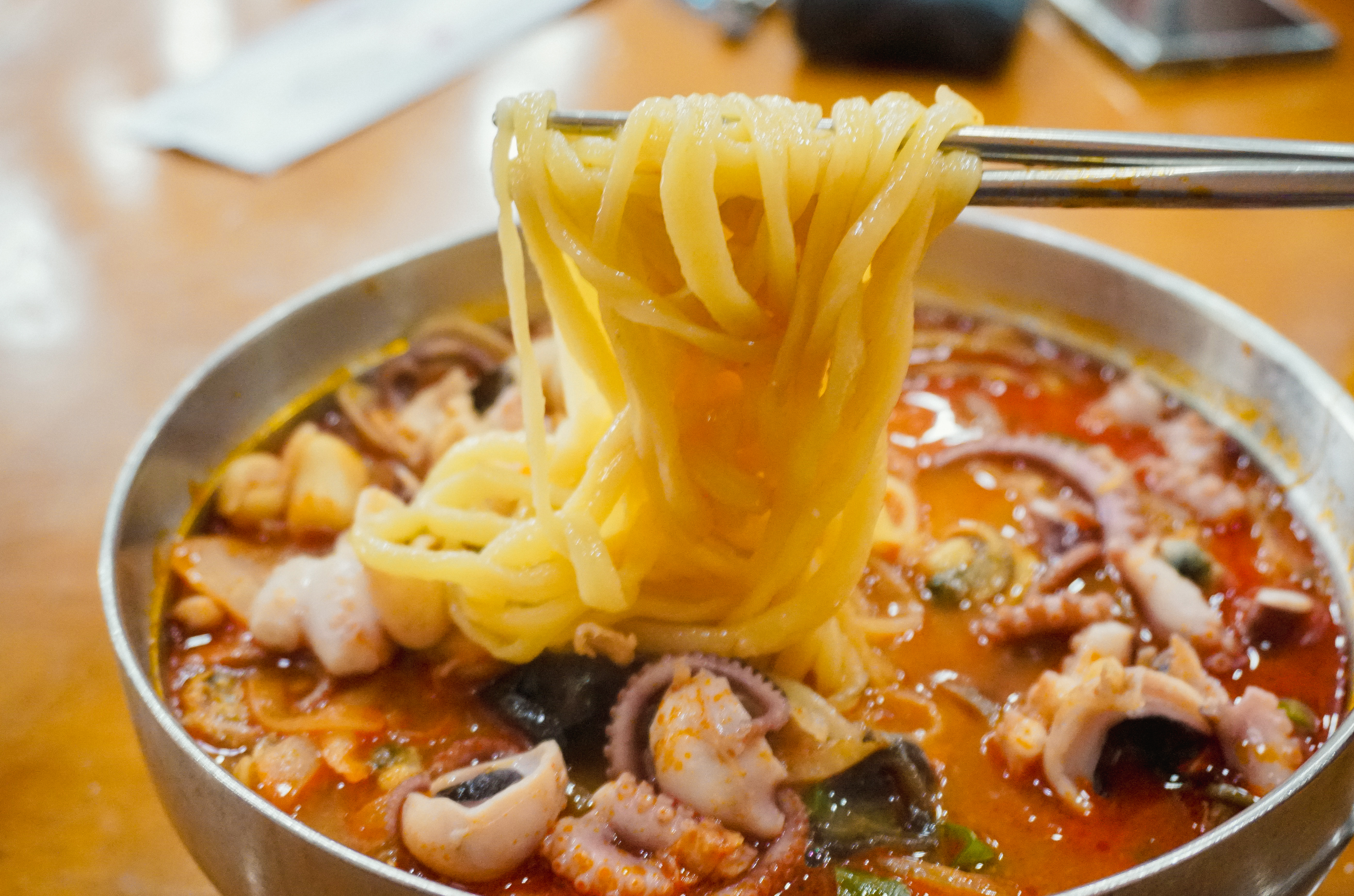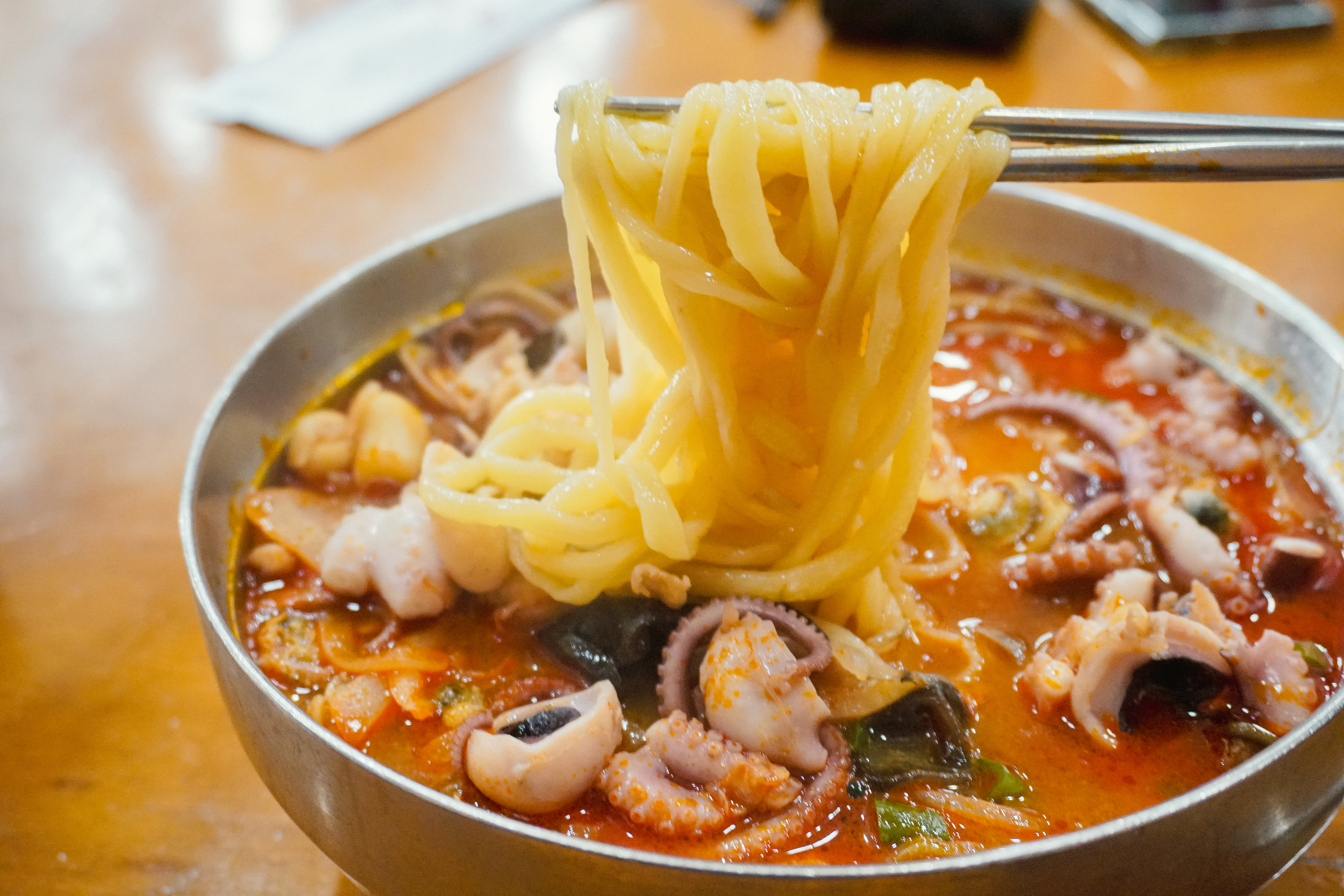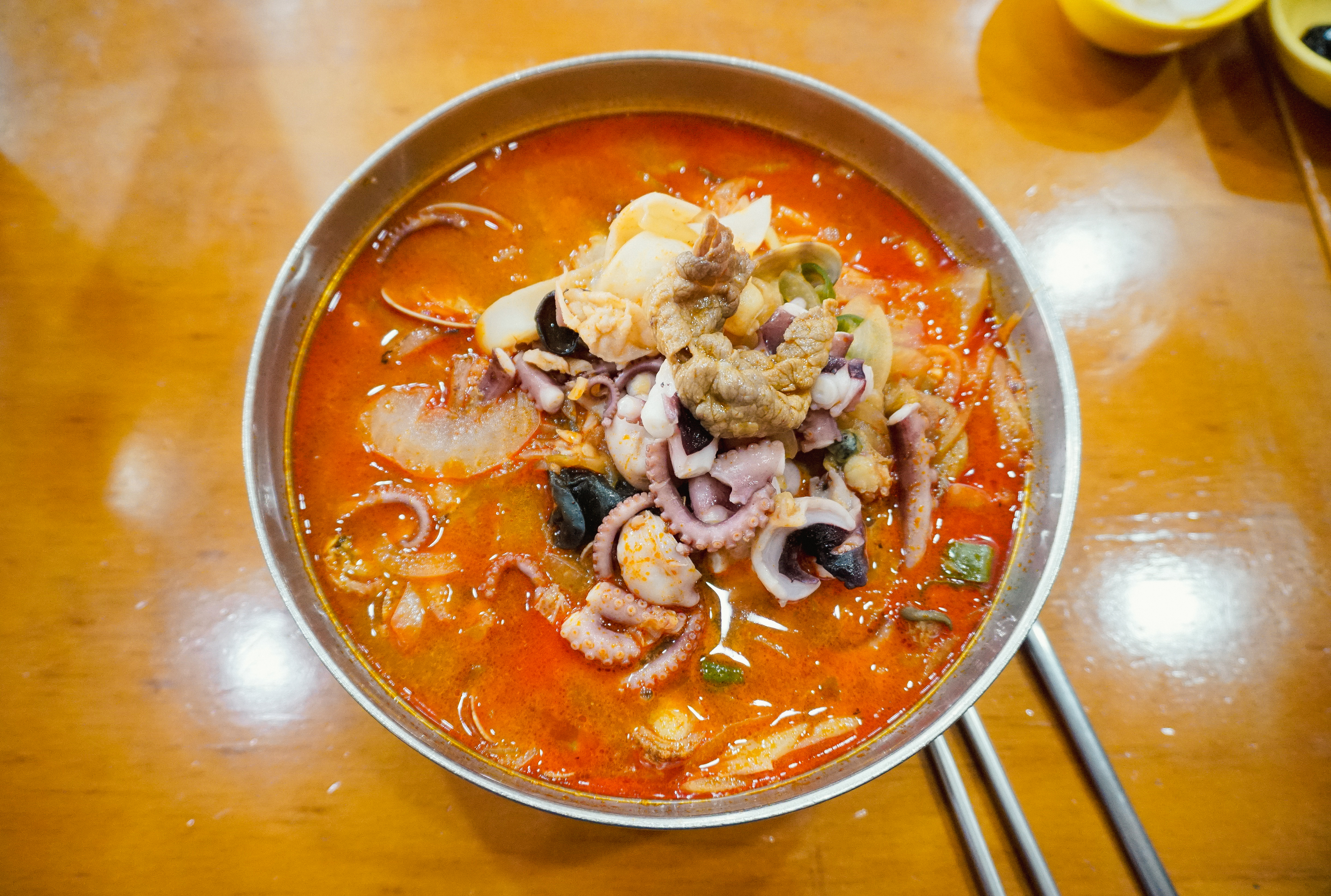 저희는 동춘옥의 차돌짬뽕과 낙지짬뽕을 주문했습니다. 낙지짬뽕은 금어기라 생낙지가 아니라 냉동을 쓴다고 했는데, 그래도 부드럽고 쫄깃한 식감의 낙지가 맛있었습니다. 처음에는 낙지가 통째로 나오는데, 가위로 먹기 좋게 잘라서 먹었습니다.