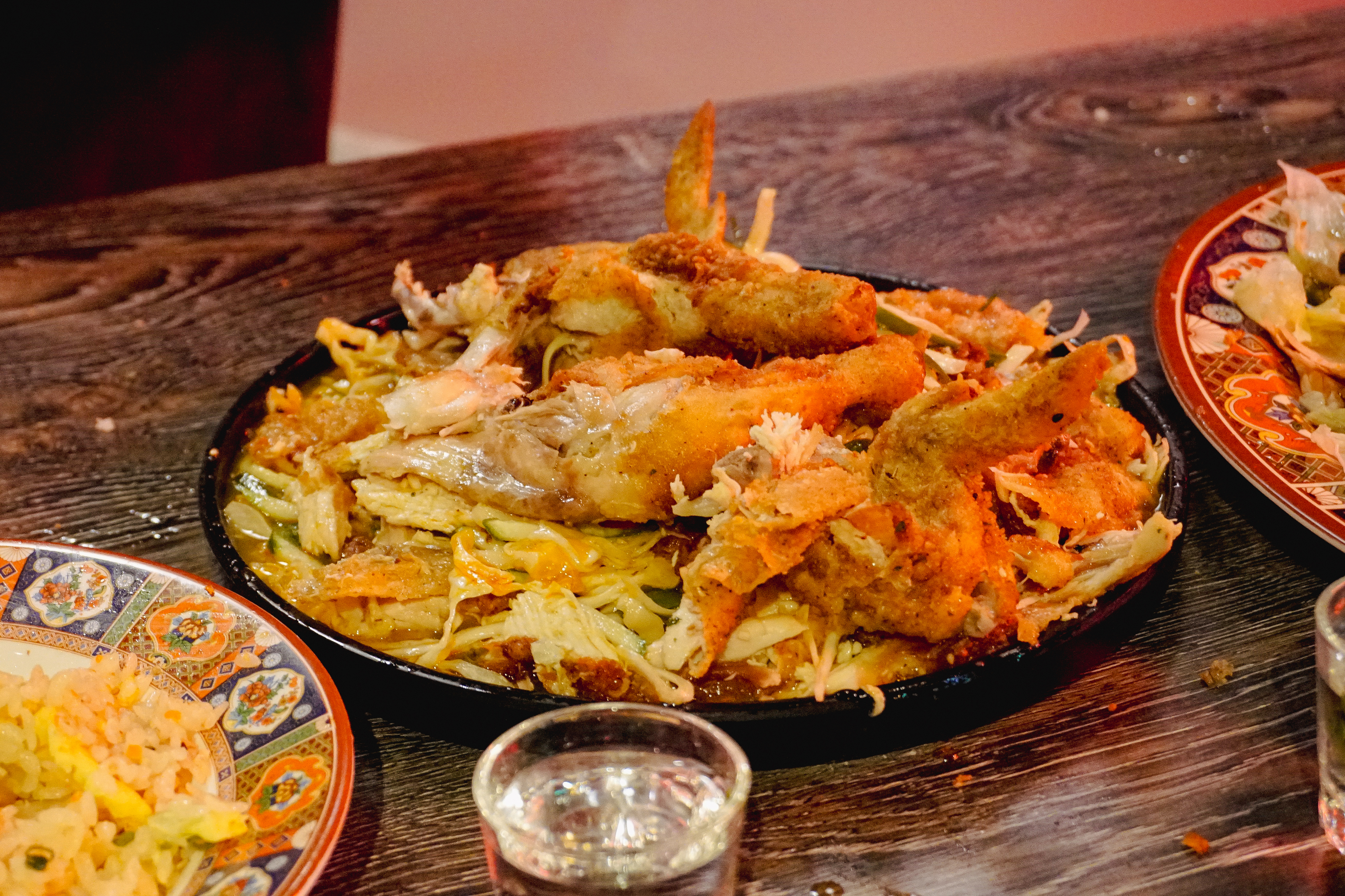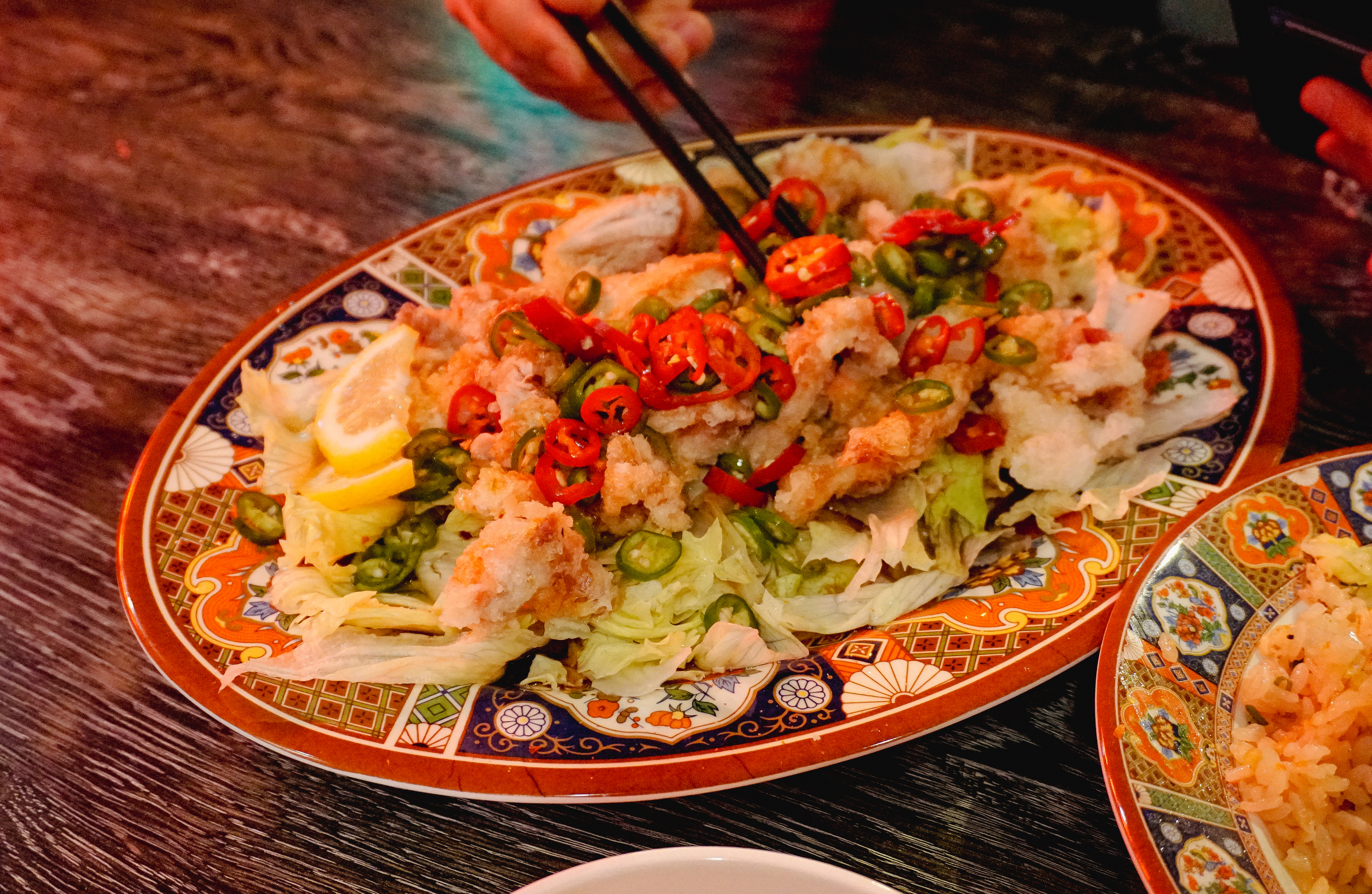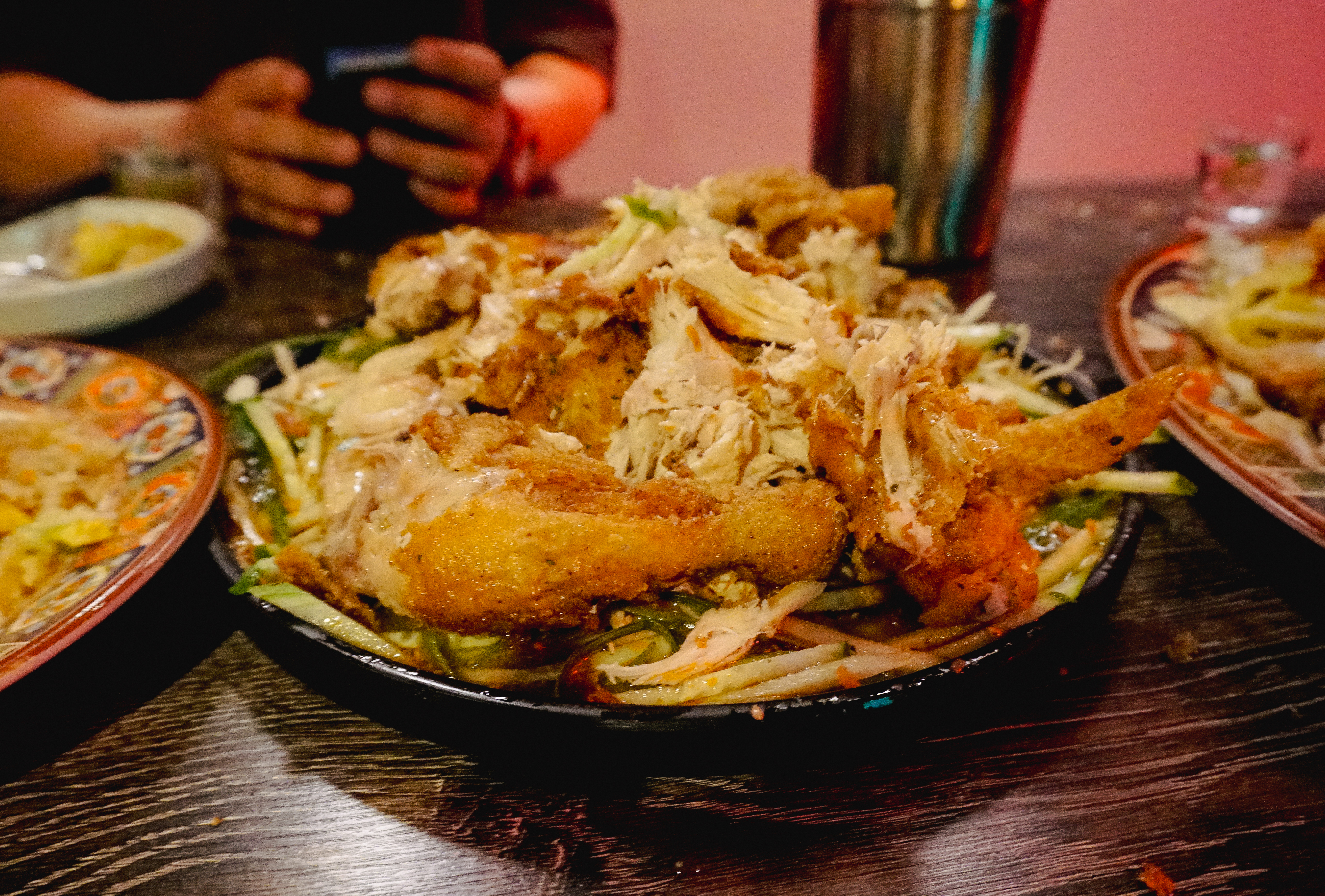 그리고 제일 기대되는 메뉴인 양장피통닭이 나왔습니다. 양장피통닭은 주주객반의 시그니쳐 메뉴라고 할 수 있는데, 새초롬한 양장피 소스에 양배추, 오이 등 채소들과 곁들여 먹는 메뉴였습니다. 특히 이 메뉴는 직접 자리에서 닭을 먹기 좋게 발라주는데, 나름 주주객반 만의 별미라고 할 수 있었습니다. 유린기랑 얼핏 비슷한 느낌이지만, 유린기는 탕수육처럼 닭고기를 튀겨낸 요리라면, 양장피통닭은 닭을 통째로 튀겨내어 살코기를 발라내고 하다 보니 조금 더 담백하고 양장피 특유의 새콤한 맛에 계속 손이 가는 메뉴였습니다.