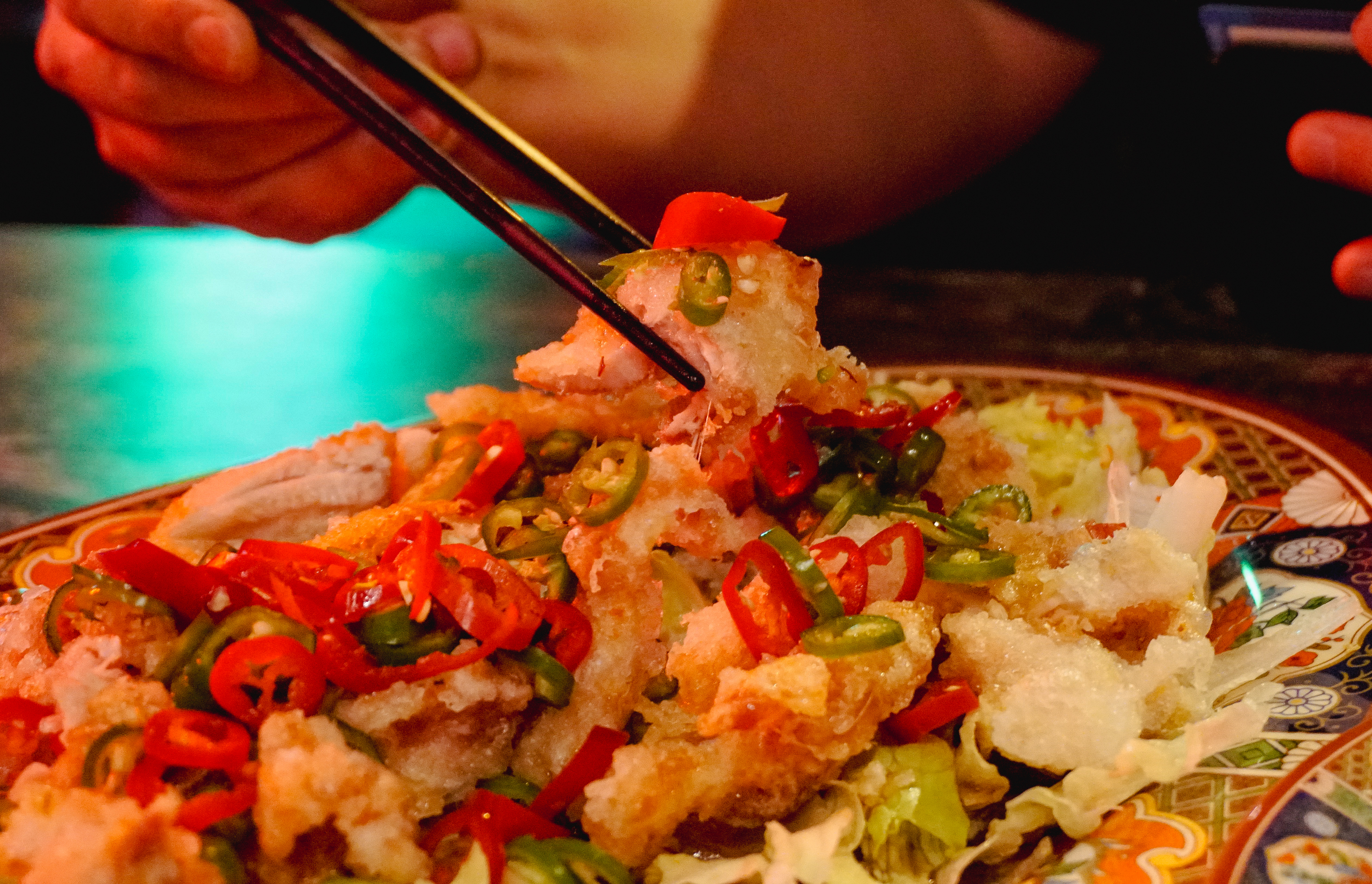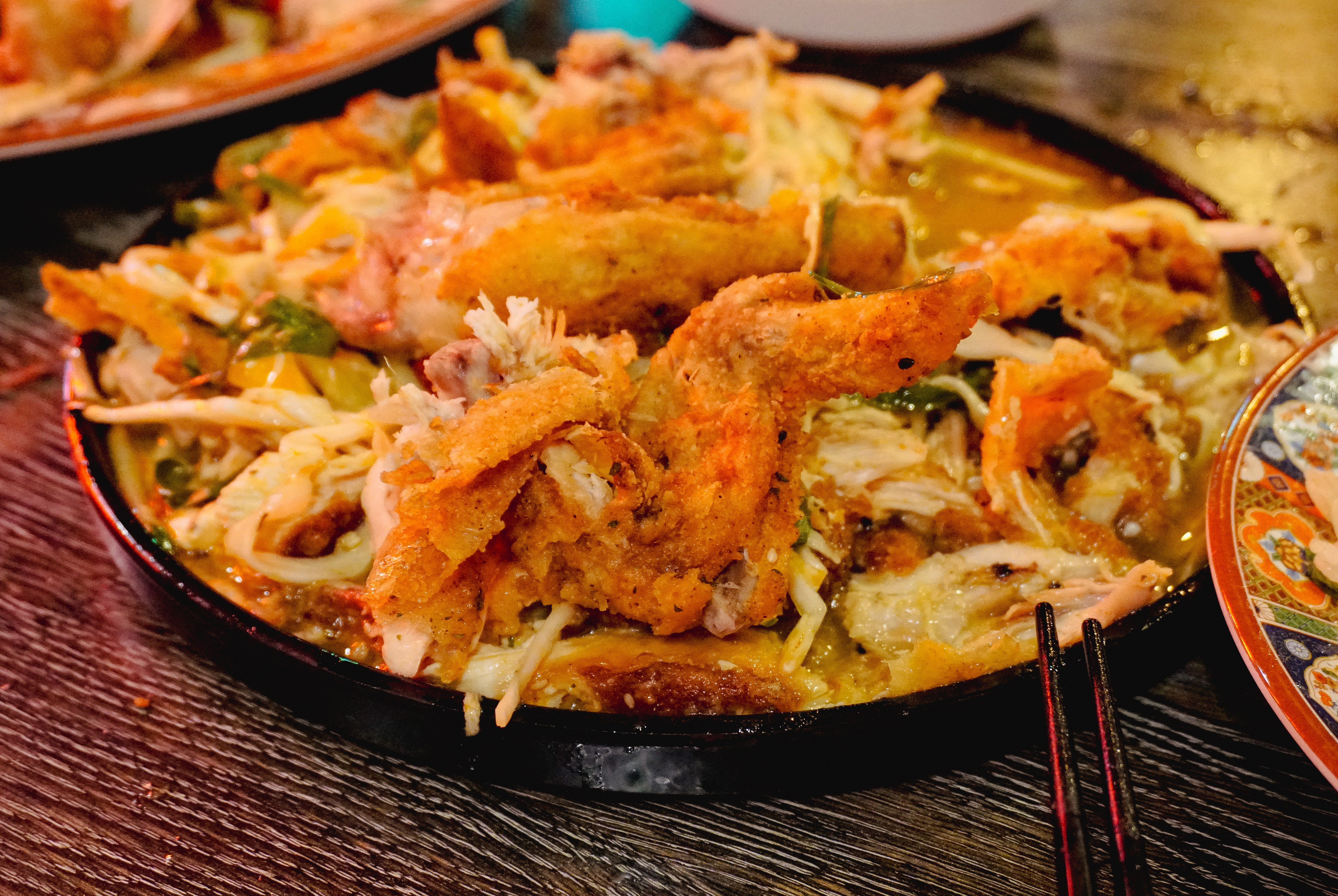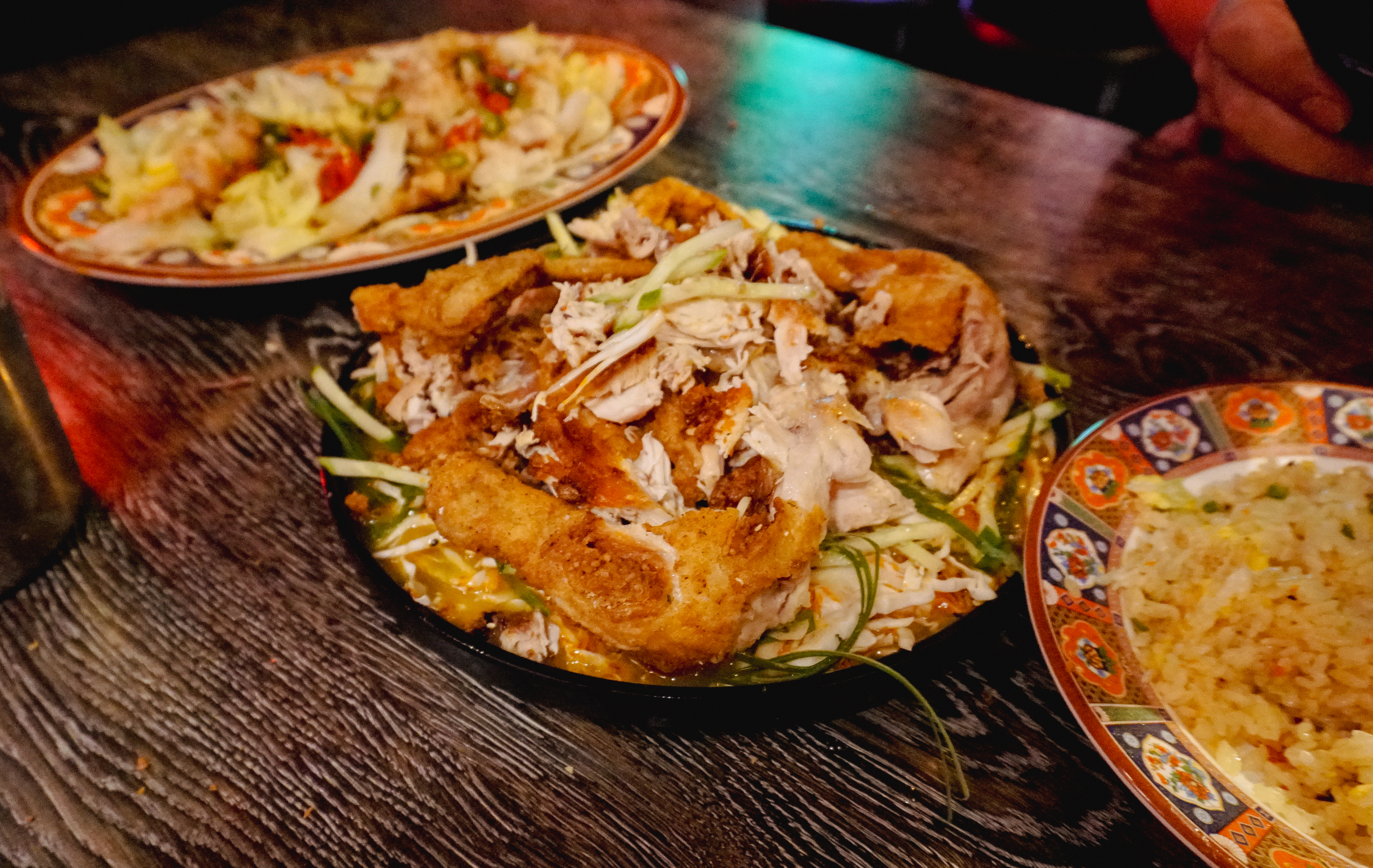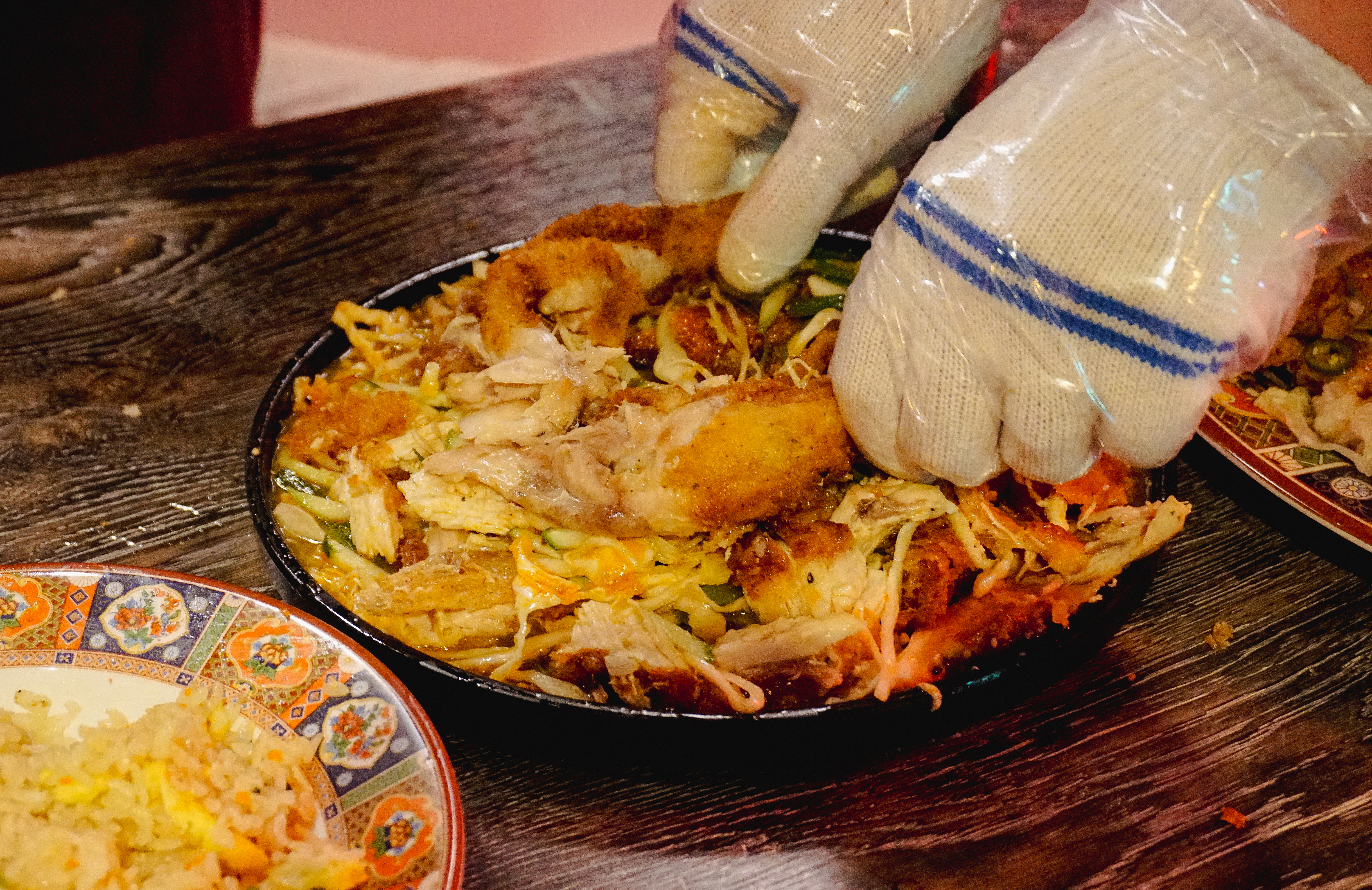 그리고 제일 기대되는 메뉴인 양장피통닭이 나왔습니다. 양장피통닭은 주주객반의 시그니쳐 메뉴라고 할 수 있는데, 새초롬한 양장피 소스에 양배추, 오이 등 채소들과 곁들여 먹는 메뉴였습니다. 특히 이 메뉴는 직접 자리에서 닭을 먹기 좋게 발라주는데, 나름 주주객반 만의 별미라고 할 수 있었습니다. 유린기랑 얼핏 비슷한 느낌이지만, 유린기는 탕수육처럼 닭고기를 튀겨낸 요리라면, 양장피통닭은 닭을 통째로 튀겨내어 살코기를 발라내고 하다 보니 조금 더 담백하고 양장피 특유의 새콤한 맛에 계속 손이 가는 메뉴였습니다.