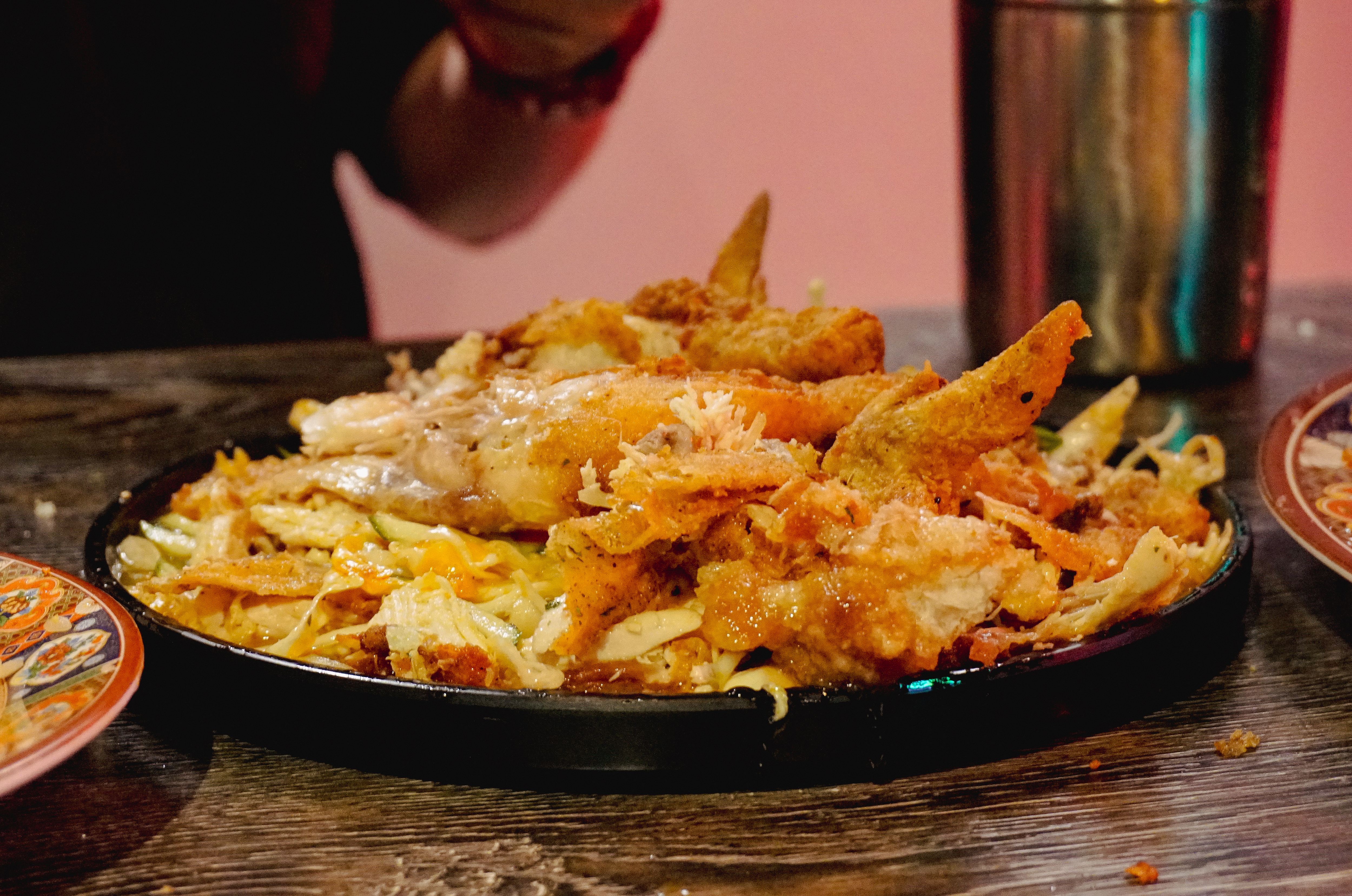 그리고 제일 기대되는 메뉴인 양장피통닭이 나왔습니다. 양장피통닭은 주주객반의 시그니쳐 메뉴라고 할 수 있는데, 새초롬한 양장피 소스에 양배추, 오이 등 채소들과 곁들여 먹는 메뉴였습니다. 특히 이 메뉴는 직접 자리에서 닭을 먹기 좋게 발라주는데, 나름 주주객반 만의 별미라고 할 수 있었습니다. 유린기랑 얼핏 비슷한 느낌이지만, 유린기는 탕수육처럼 닭고기를 튀겨낸 요리라면, 양장피통닭은 닭을 통째로 튀겨내어 살코기를 발라내고 하다 보니 조금 더 담백하고 양장피 특유의 새콤한 맛에 계속 손이 가는 메뉴였습니다.
