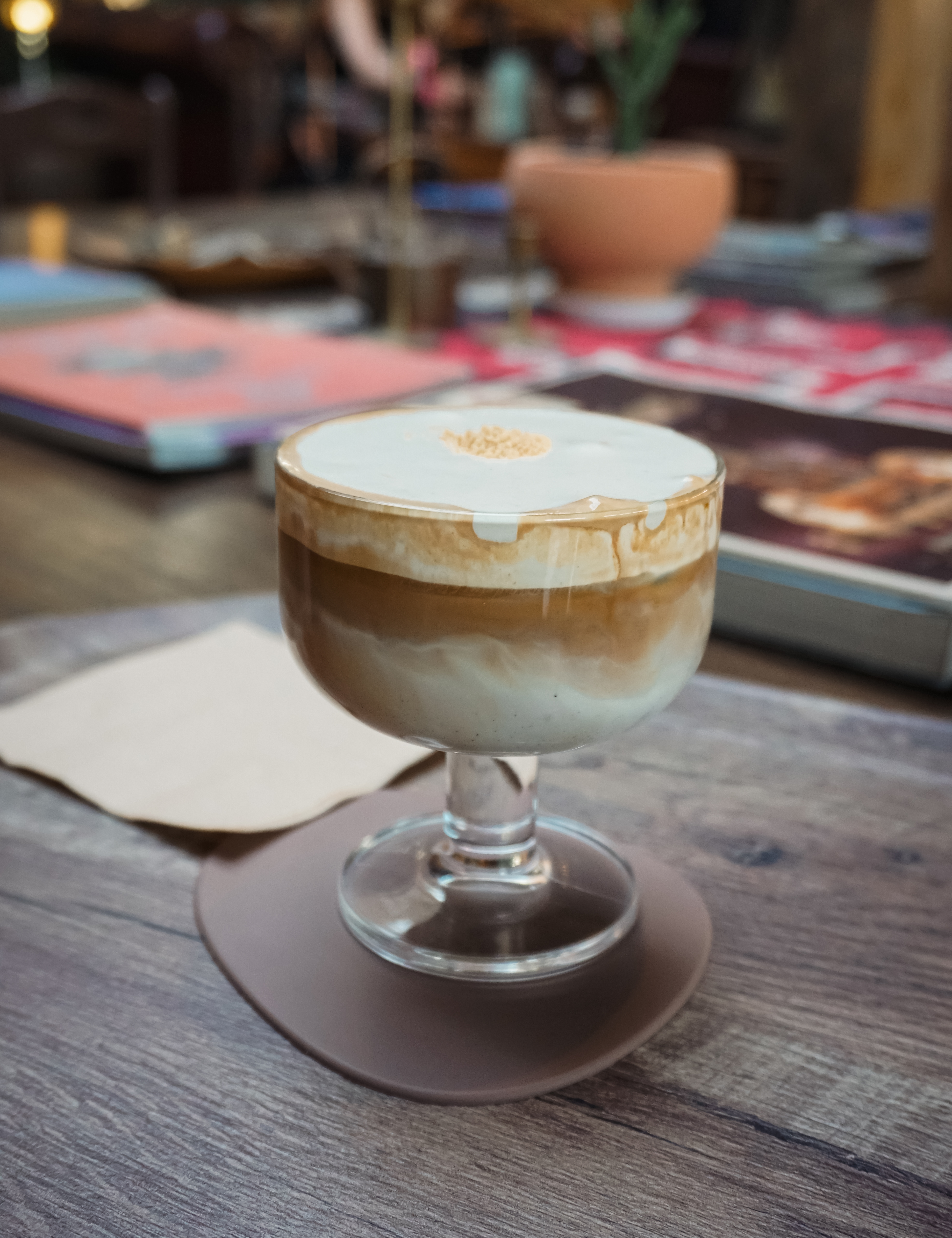 친봉산장은 1인 1음료를 주문하도록 되어있었고, 키오스크를 통해 메뉴를 직접 주문할 수 있도록 되어있었습니다. 저는 이 카페의 시그니쳐 메뉴인 에인절미 라떼를 주문했습니다. 에인절미 라떼는 땅콩크림과 부드럽고 크리미 한 우유폼이 올라간 라떼였는데, 진득한 맛이 먹기 좋았습니다.