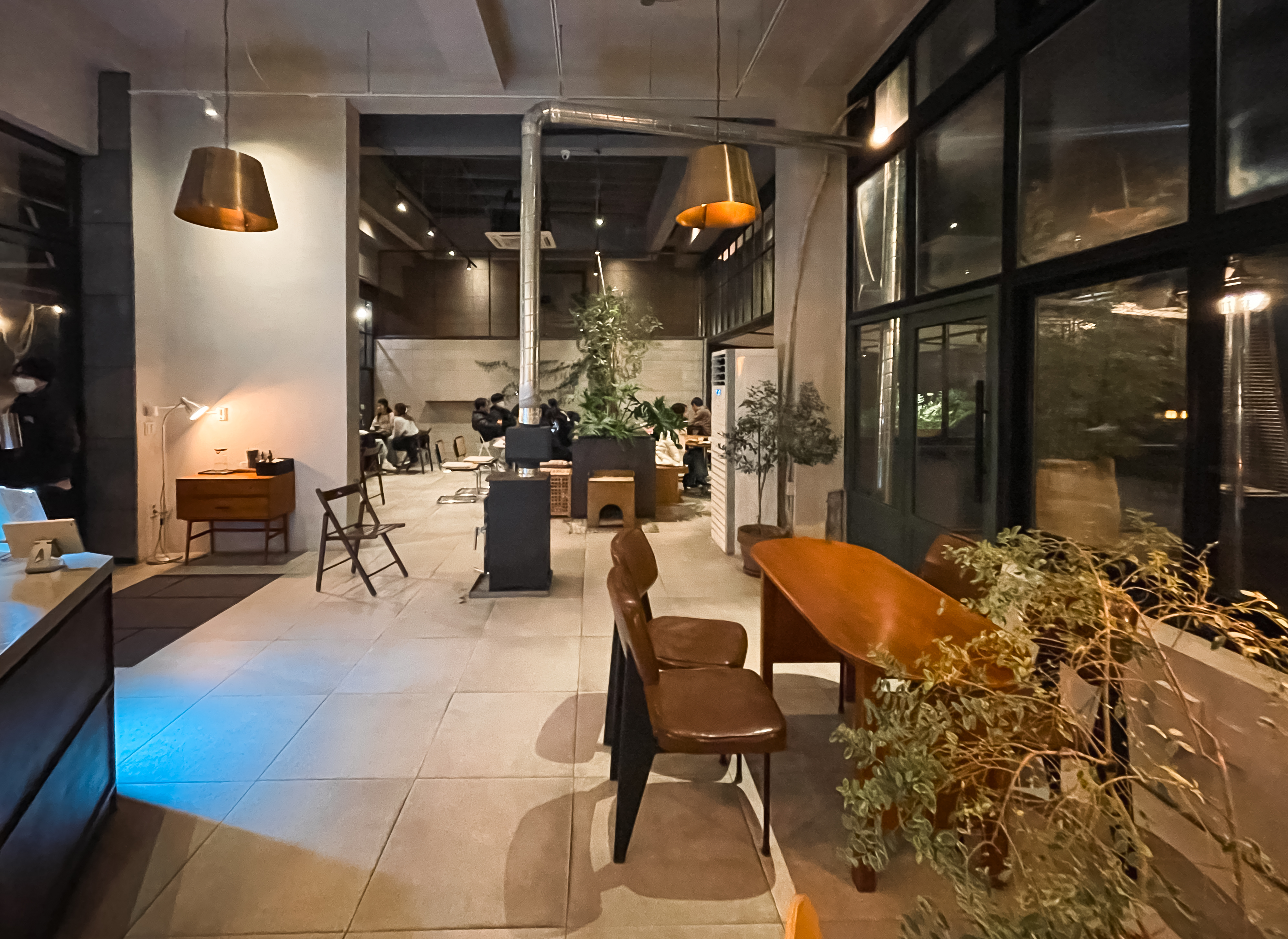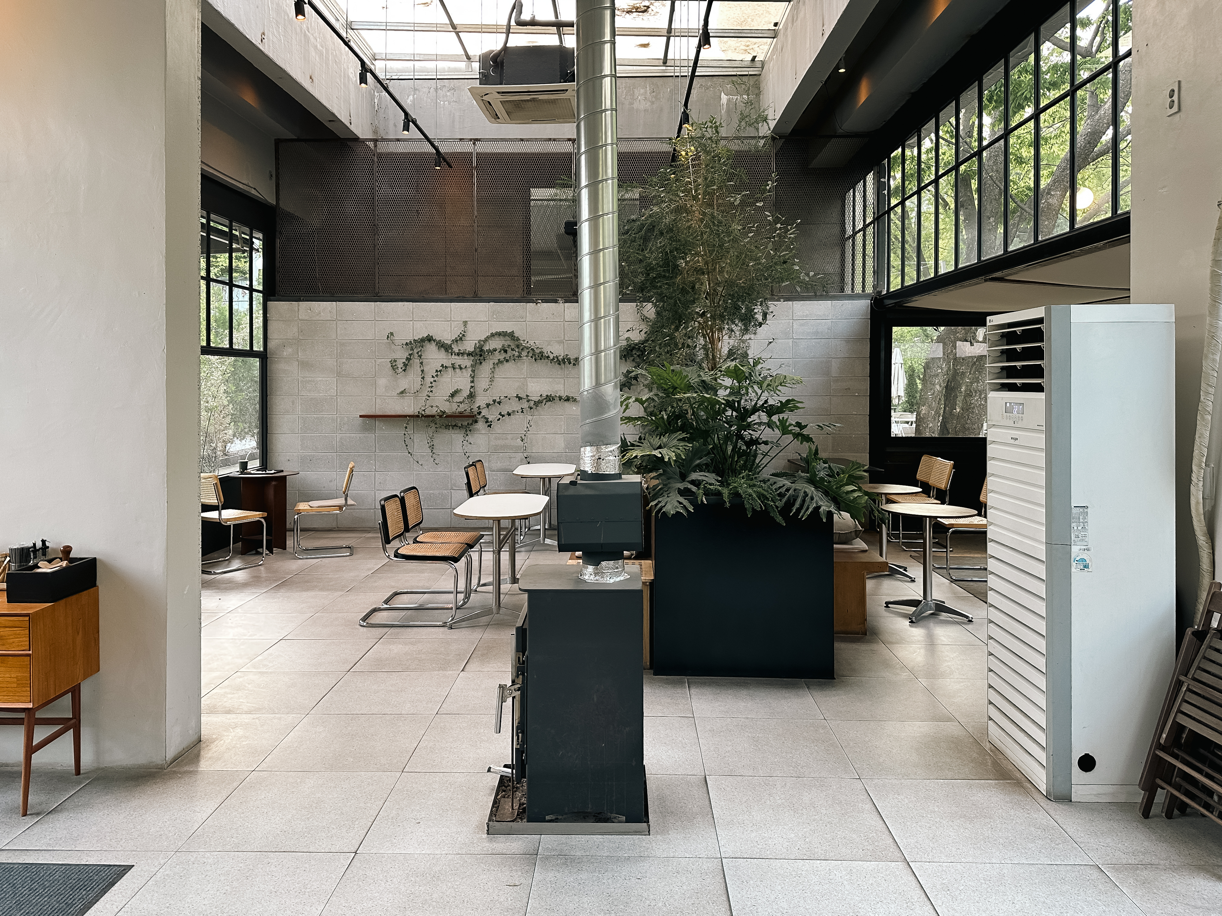 카페 내부의 모습은 이렇습니다. 앞서 말씀드린 것처럼 깔끔한 분위기에 천장이 높아서 그런지 공간이 답답한 느낌이 없어서 좋았습니다. 여름에는 에어컨을 틀지만, 겨울에는 난로를 피우는지 가게 중앙에 난로가 놓여있더라고요.