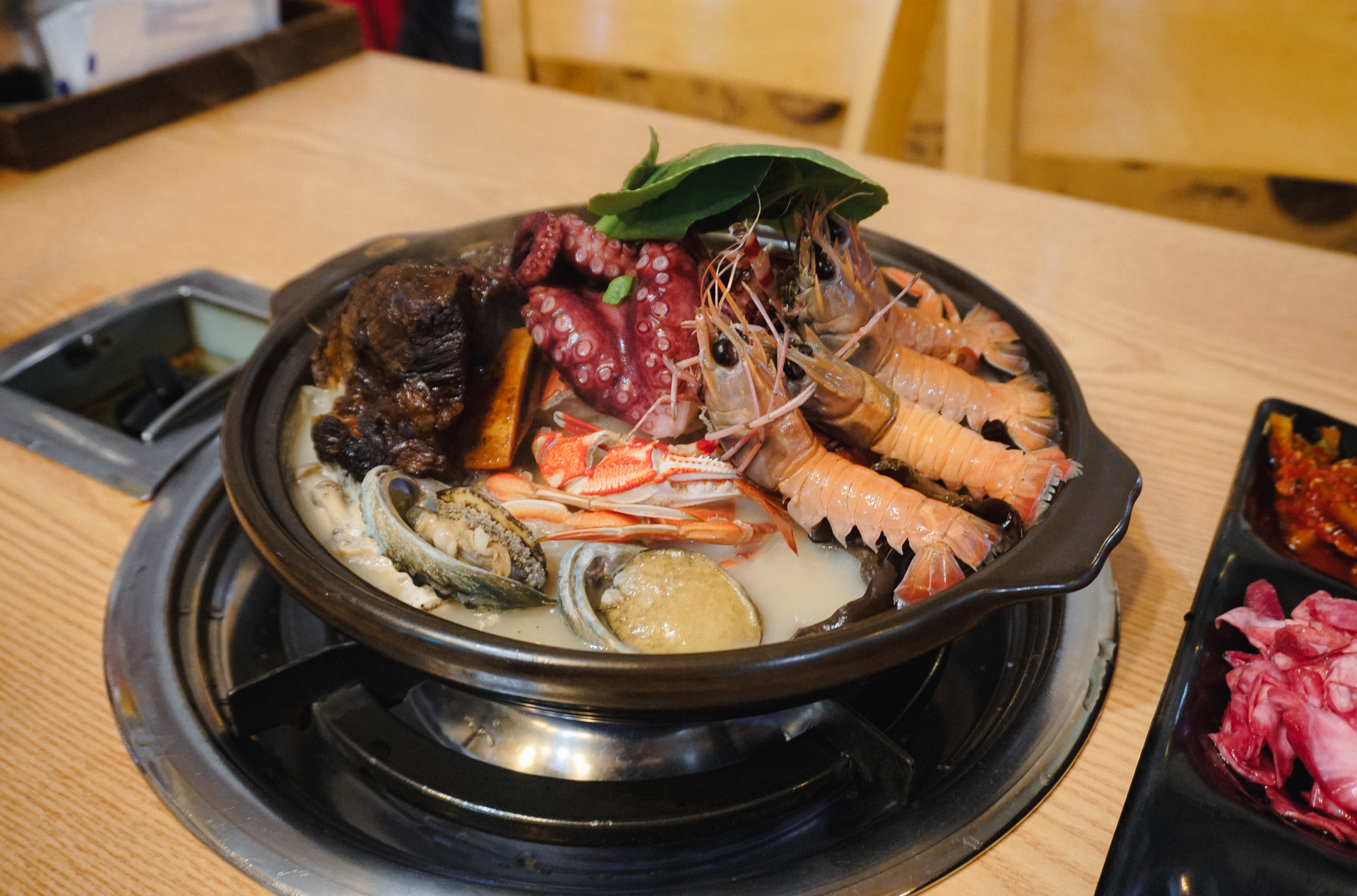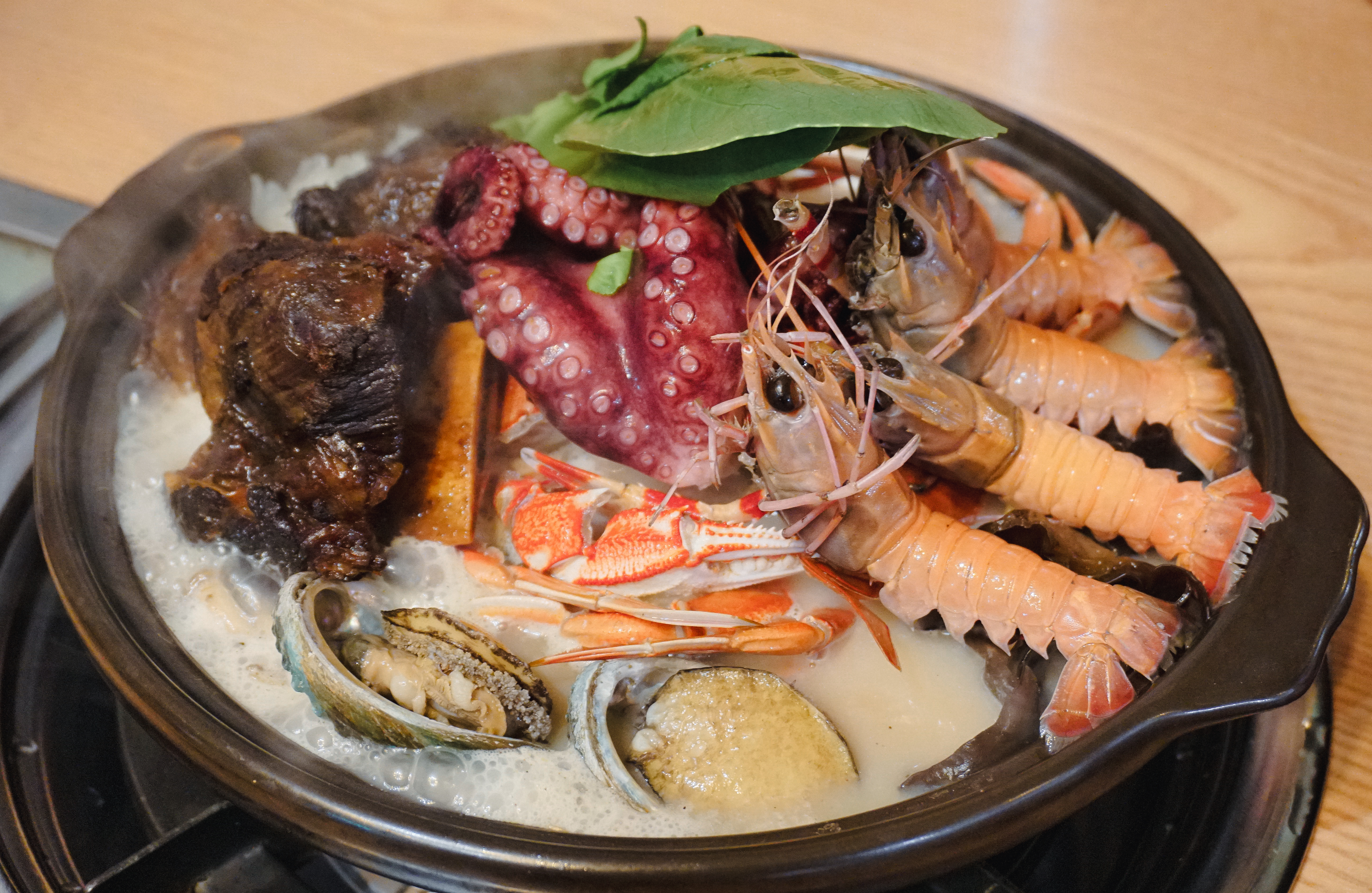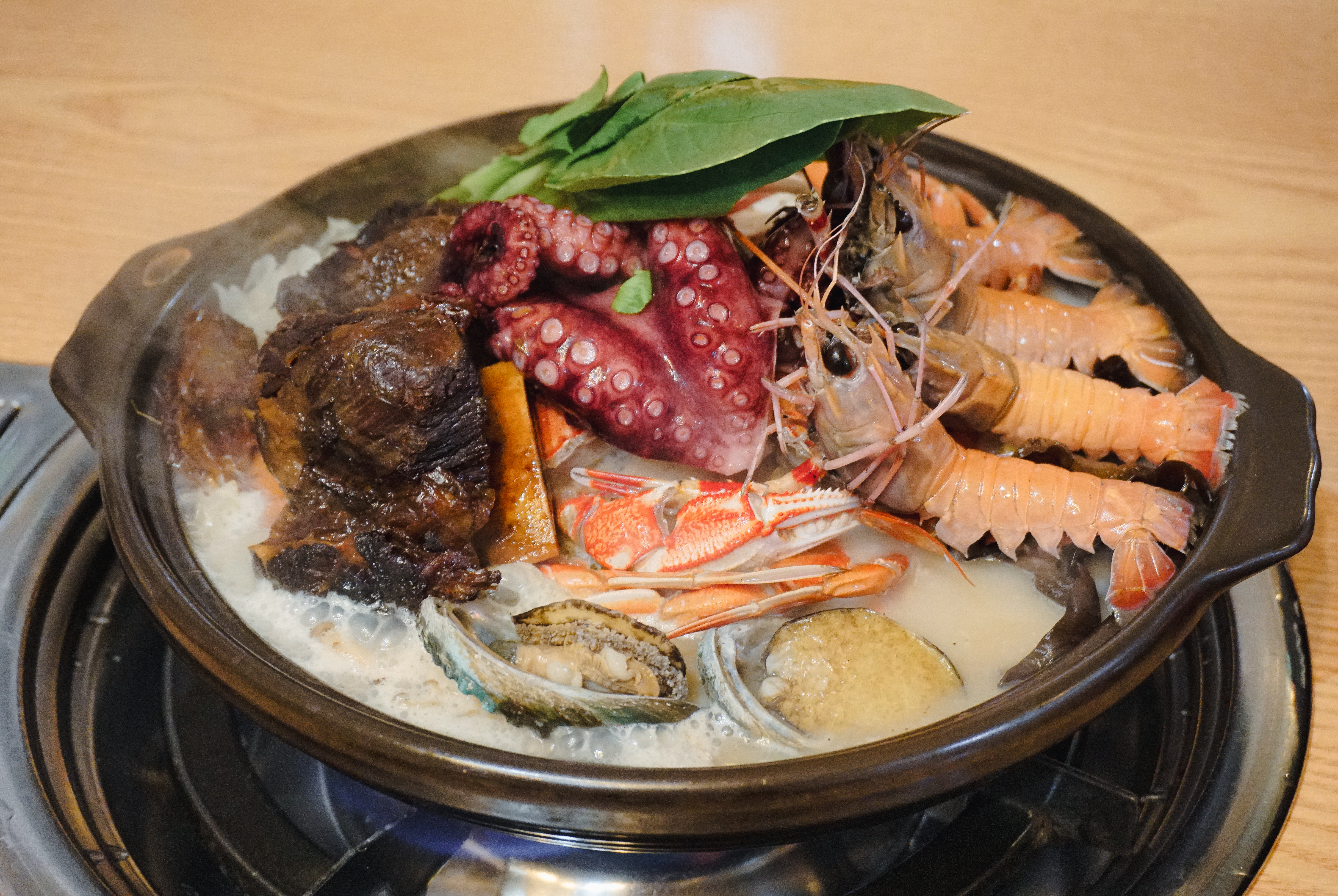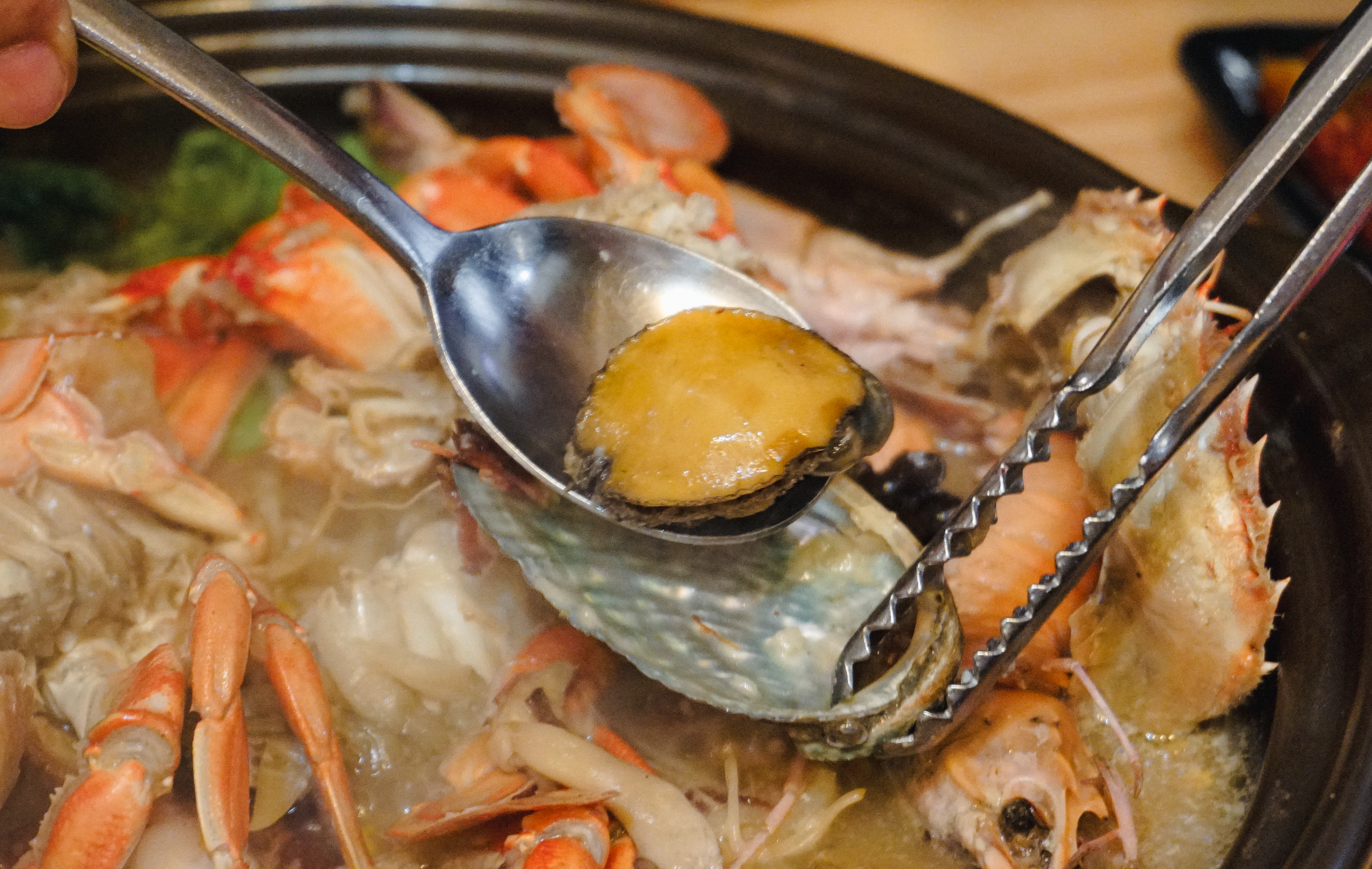 ➍ 전복(전복도 갈비와 마찬가지로 쉽게 분리되었습니다). ➎ 게(게는 먹기 좋게 직원분이 직접 손질해 주셨어요). 딱새우는 오래 우려낼수록 육수가 진해지니 국물 끓이는 용도로 사용하다가 젓가락을 이용해 먹었습니다.
