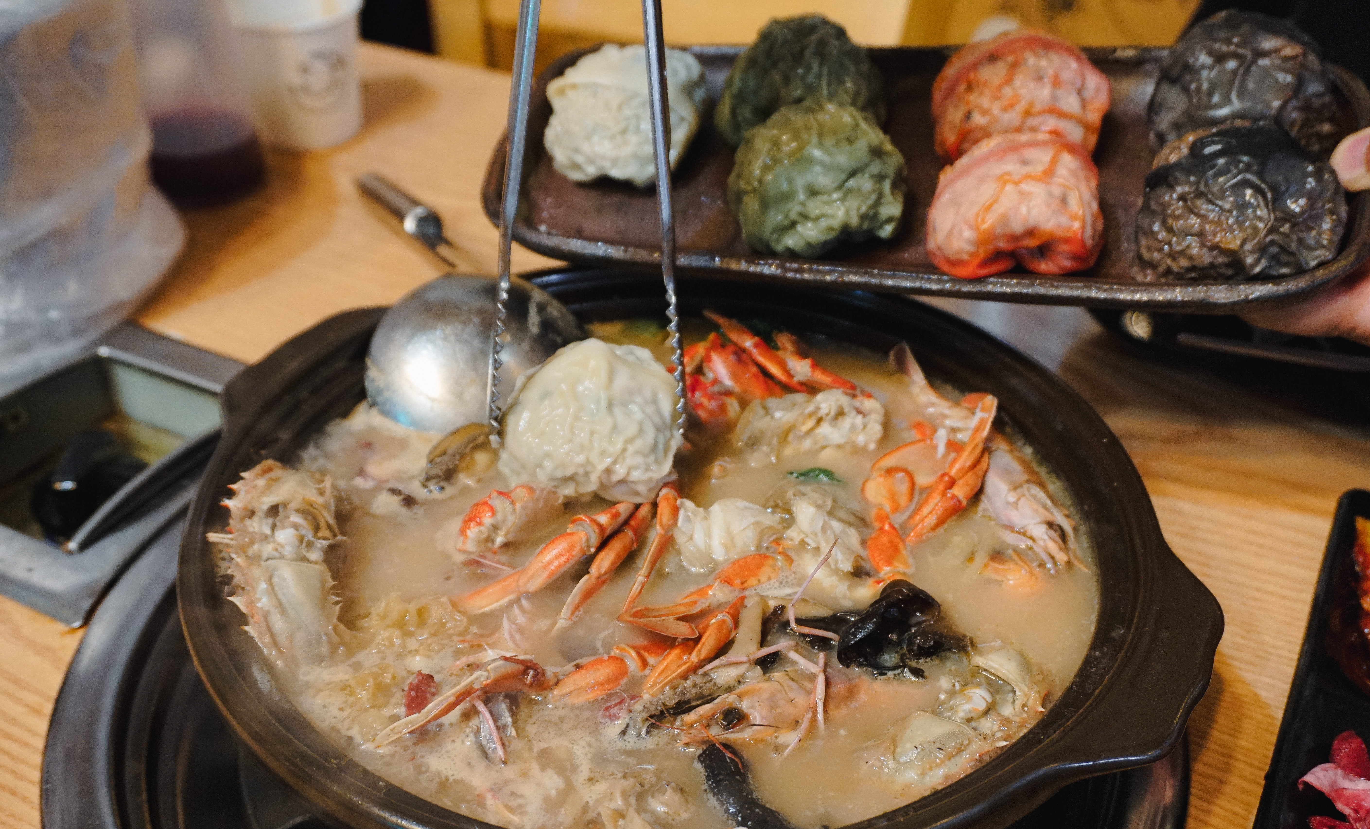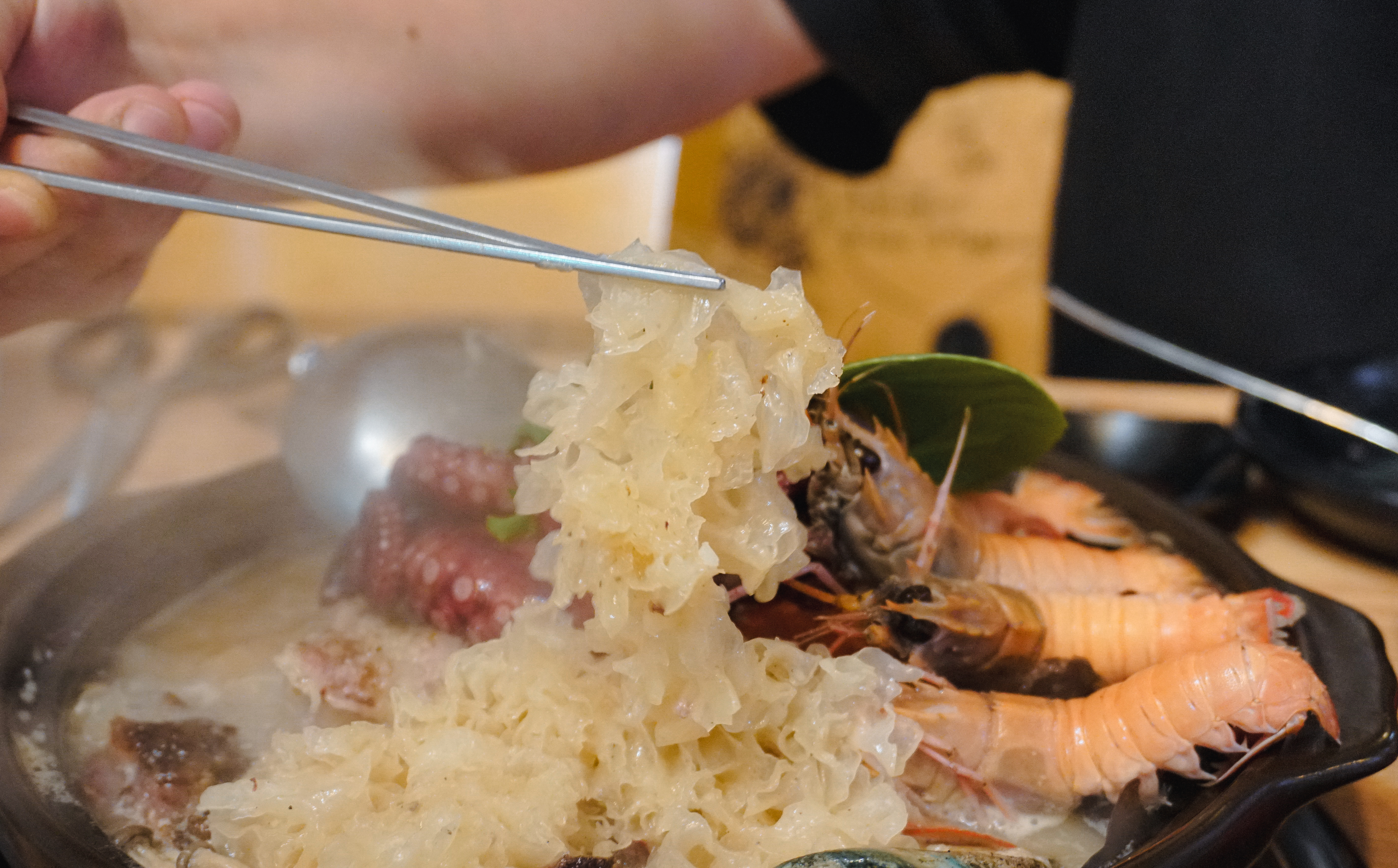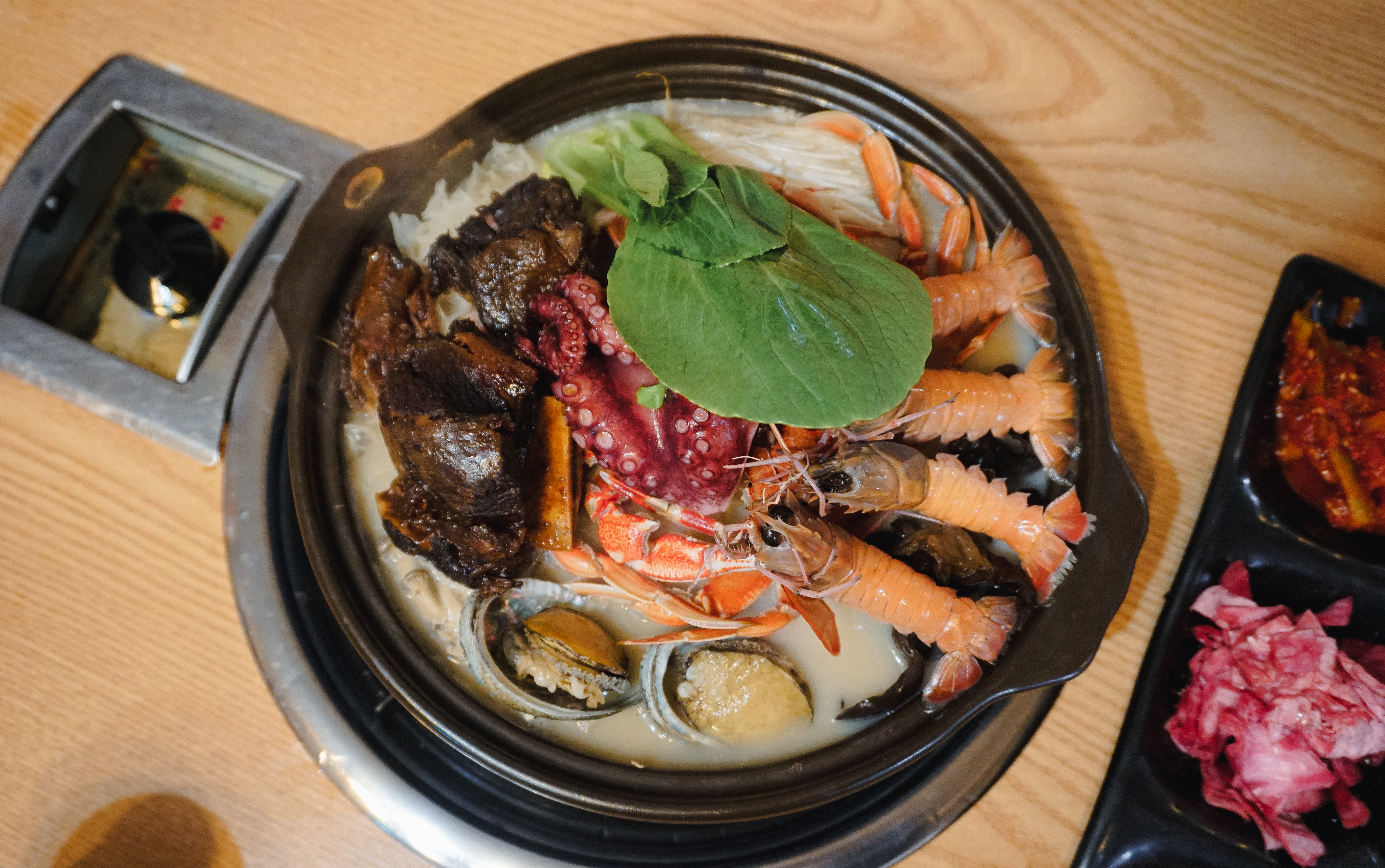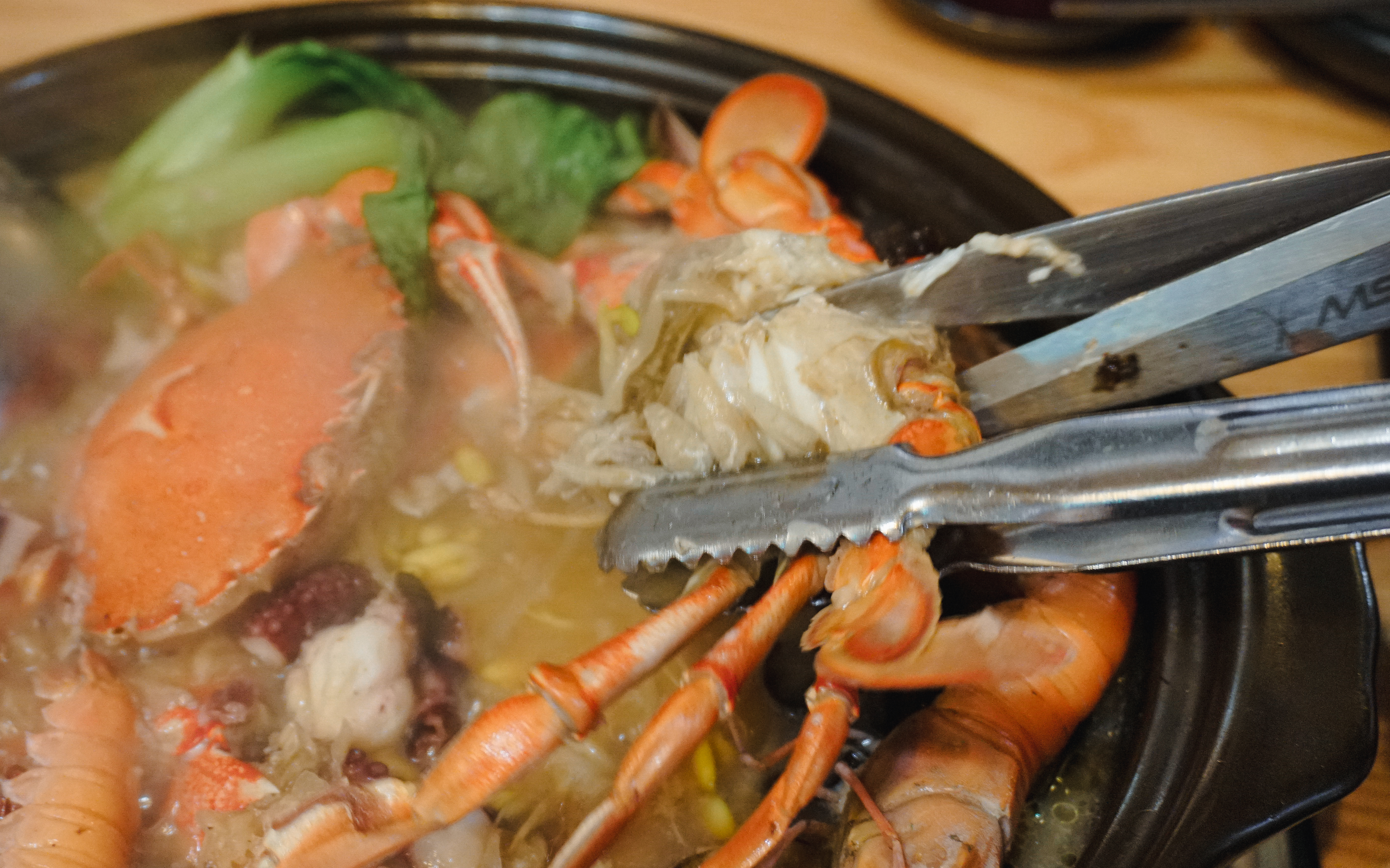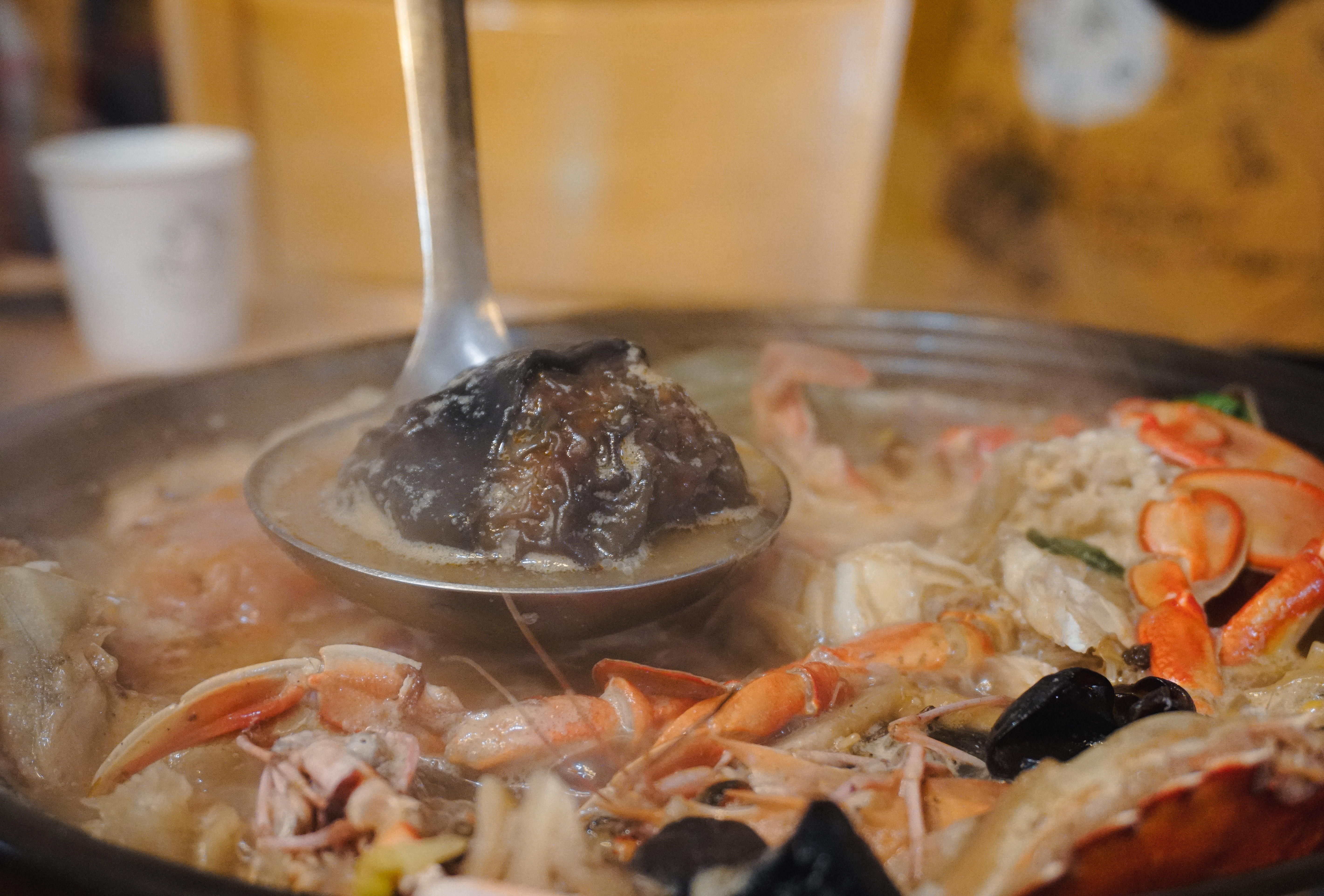 ➍ 전복(전복도 갈비와 마찬가지로 쉽게 분리되었습니다). ➎ 게(게는 먹기 좋게 직원분이 직접 손질해 주셨어요). 딱새우는 오래 우려낼수록 육수가 진해지니 국물 끓이는 용도로 사용하다가 젓가락을 이용해 먹었습니다.
