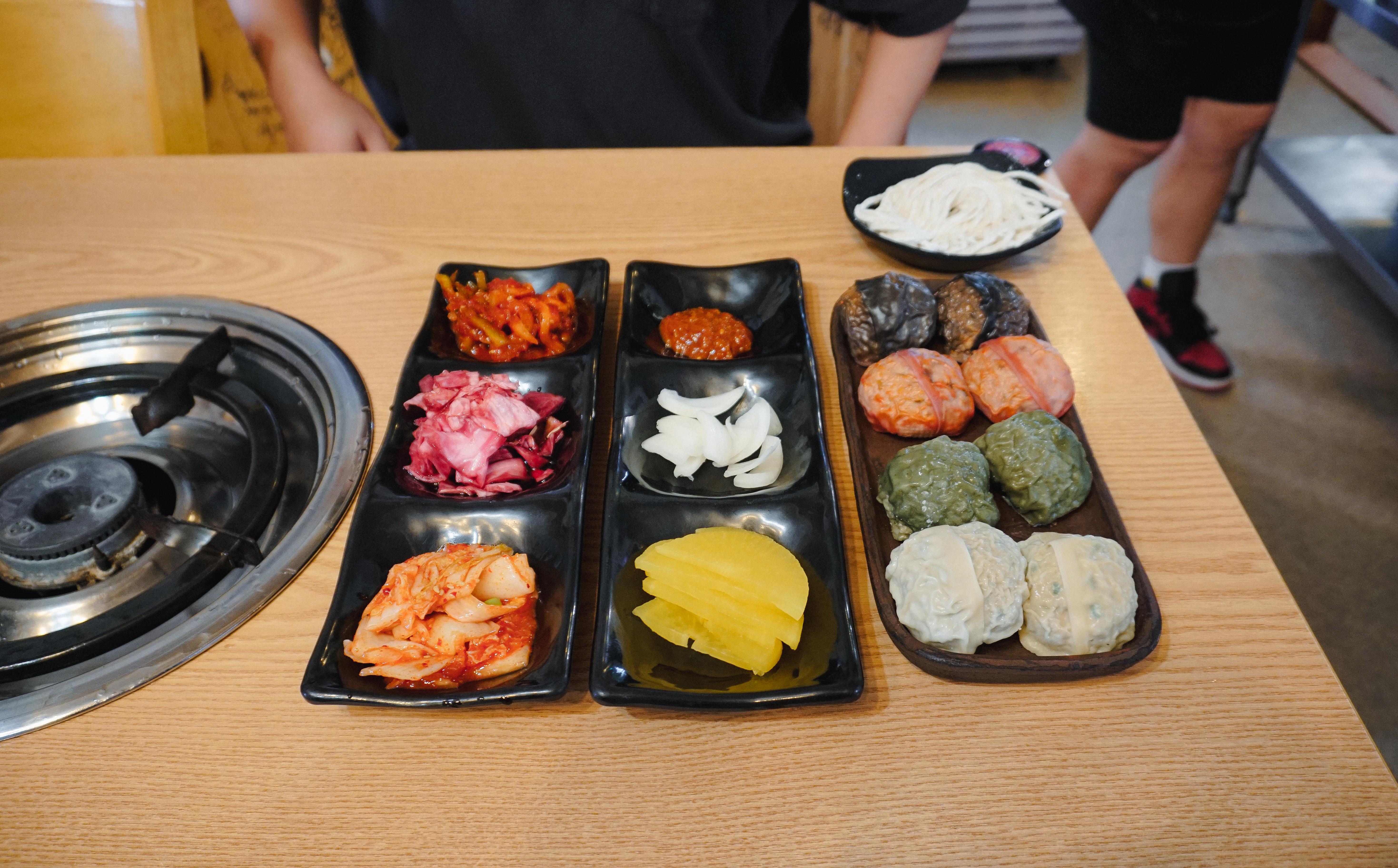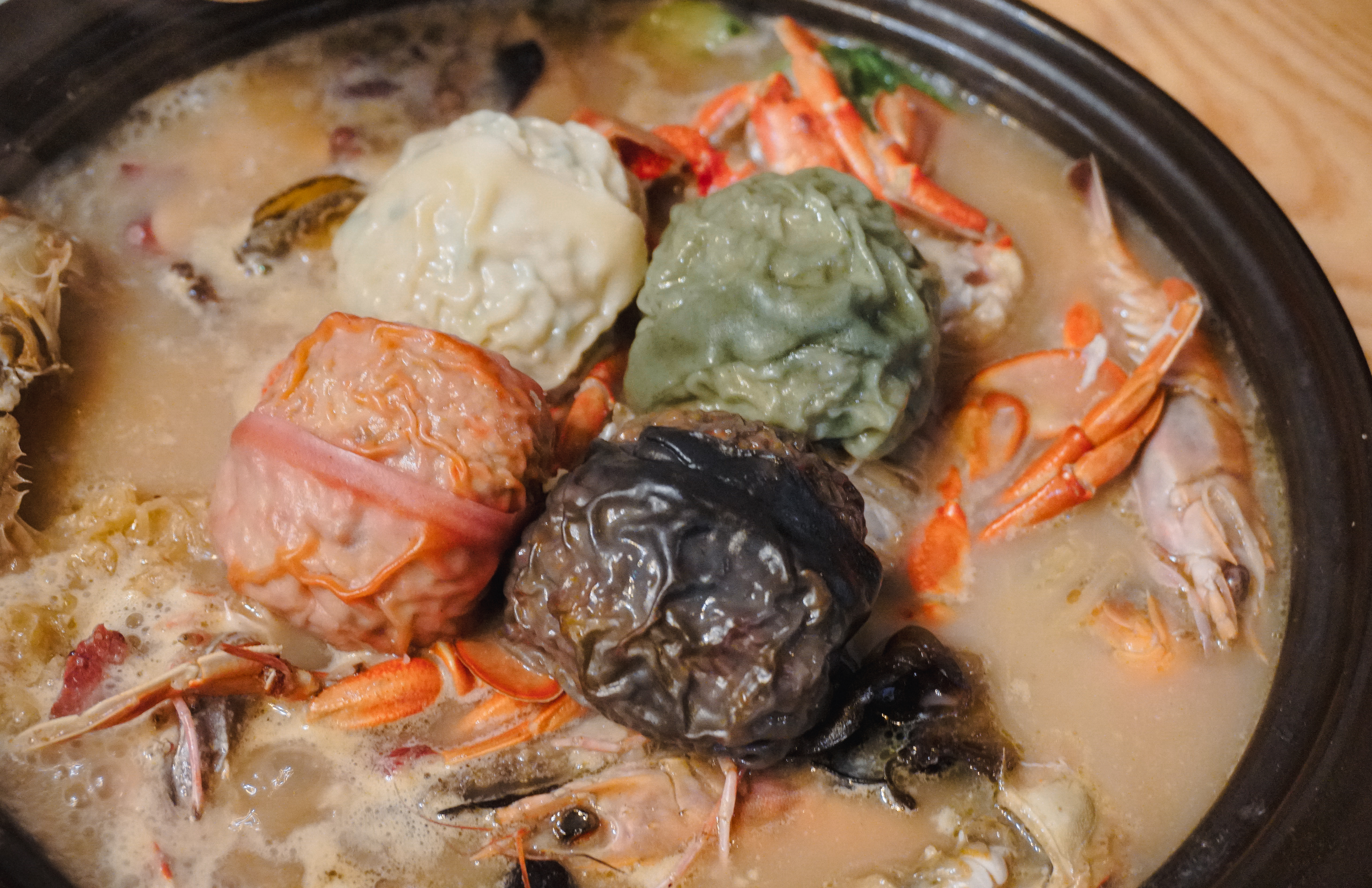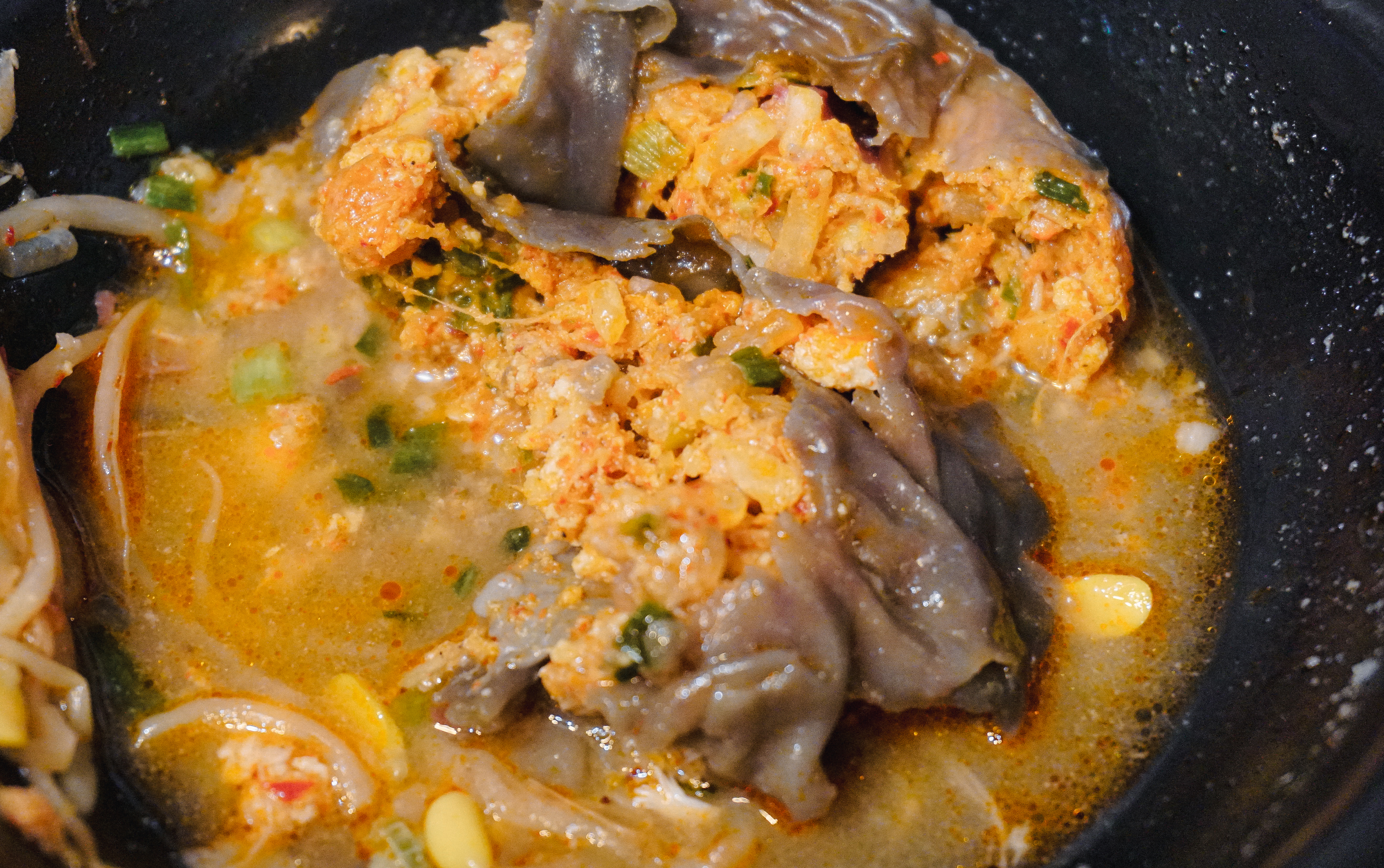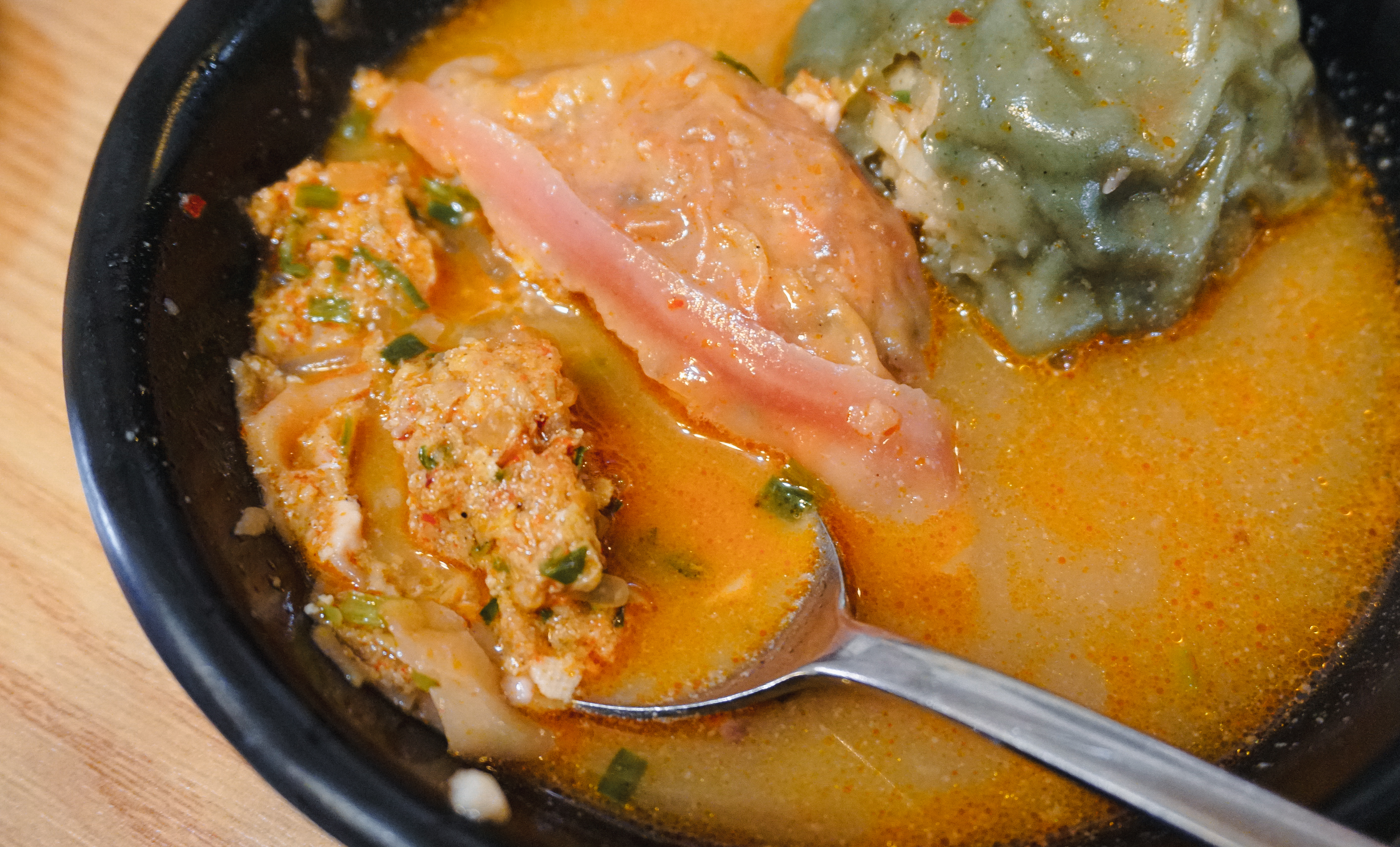 ➏ 만두(육수를 리필하고 만두를 넣어주었습니다). 4색만두라는 이름답게 만두는 흰색, 분홍색, 검은색, 초록색을 띄고 있었고, 만두의 색깔별로 속재료가 구분되어 있었습니다. 참고로 위 사진처럼 국물에 만두를 으깨듯 풀어서 먹는 것을 추천드립니다. 만두에 양념이 진해서 그냥 먹어도 맛있지만, 국물과도 잘 어울렸거든요.